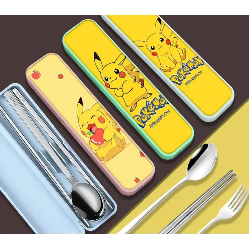 Comprar Pokemon Pikachu juego de cubiertos de acero inoxidable portátil con caja de almacenamiento, palillos, tenedor, cuchara, vajilla de viaje, cubiertos de Camping