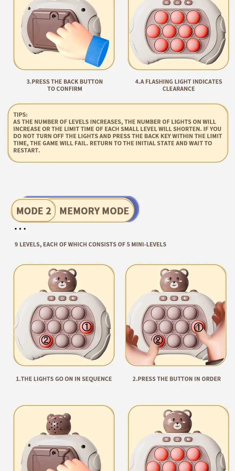 3. ¿Busca una forma divertida y atractiva de mejorar las habilidades motoras finas de su hijo? ¡No busque más, la consola de juegos Quick Push Fidget Stress Relieving Toys! Estos juguetes proporcionan una experiencia sensorial divertida y única que ayuda a desarrollar la coordinación mano-ojo y las habilidades motoras finas. Ya sea que esté atrapado en el tráfico o esperando en la fila, la consola de juegos Quick Push Fidget Stress Relieving Toys es una excelente manera de pasar el tiempo. Con su tamaño compacto y material de silicona duradero, Estos juguetes son fáciles de llevar contigo dondequiera que vayas.