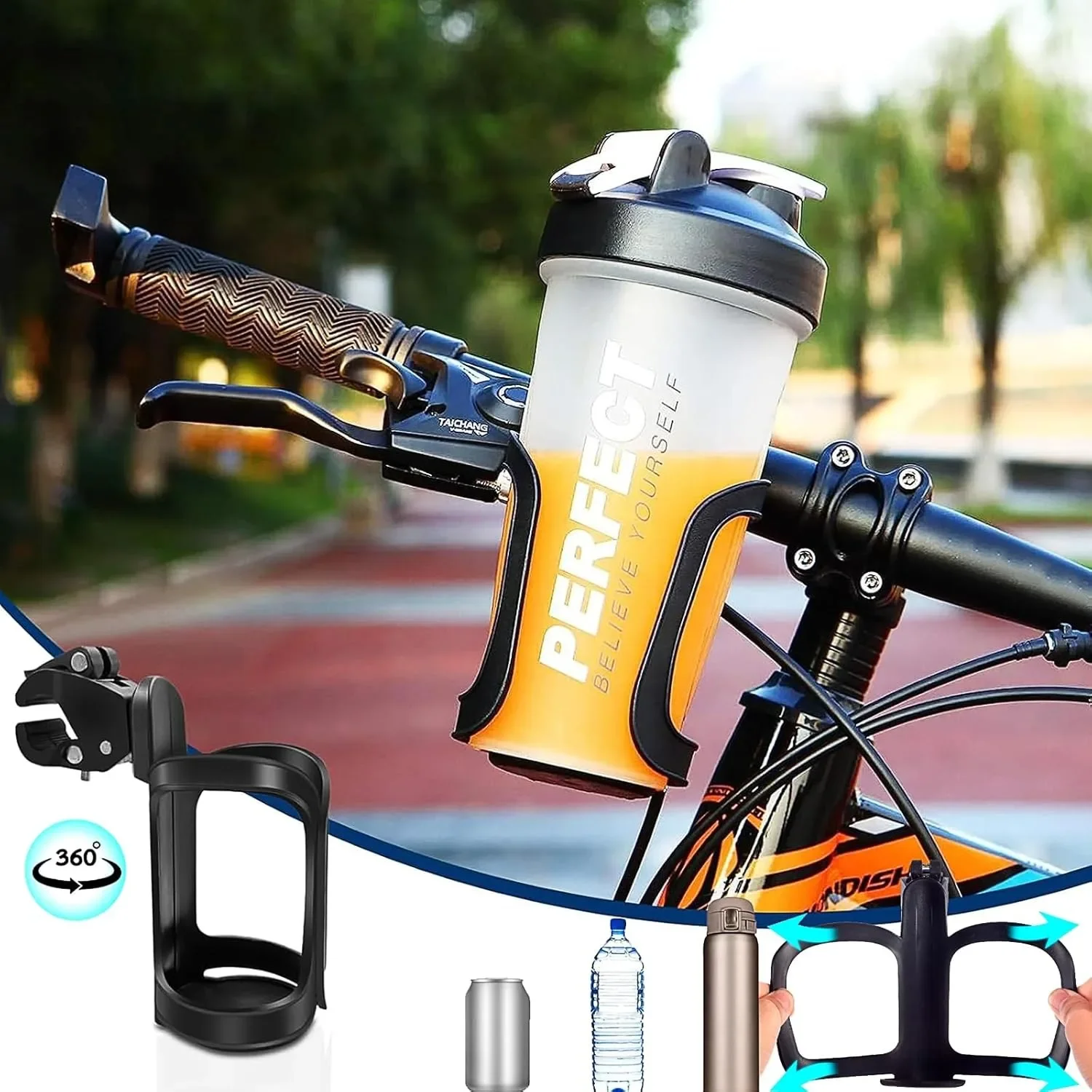 Rotación de 360 grados: el portavasos gira 360 grados.Se puede montar en el manillar, debajo del asiento, en el tubo inferior, en la horquilla delantera o en el tubo de dirección, y es compatible con la mayoría de los cochecitos.