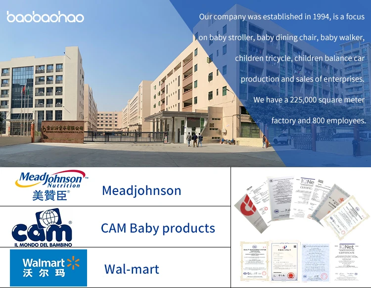 Zhongshan baobaohao children's products Co., Ltd. es una empresa totalmente extranjera especializada en la producción de productos para bebés y niños.Desde 1994, se especializa en la producción de cochecitos de bebé, andadores, triciclos y otros productos infantiles.Después de 23 años de desarrollo, baobaohao se ha convertido en una gran empresa moderna.Nuestra empresa cuenta con un equipo de diseño apasionado e innovador.Bajo el concepto de "diseño humanizado", desarrollamos constantemente productos que son más adecuados para el desarrollo óseo de los niños y más cercanos al corazón de la madre.El producto no solo tiene una apariencia moderna, sino que también es más cómodo de usar.Adherirse a la filosofía empresarial de calidad primero y cliente primero.La empresa cuenta con equipos de producción avanzados, una gran fuerza técnica y una línea de producción automática avanzada, formando una cadena de producción de soporte desde el diseño y el desarrollo hasta la fabricación y las ventas.El proceso de producción cumple estrictamente con la norma ISO9001 para la gestión de la calidad.Por lo tanto, nuestra empresa ganó la reputación de "calidad de producto confiable" galardonada por el Departamento Municipal de supervisión técnica de Zhongshan y el título honorífico de "empresa calificada con calidad estable" galardonado por el centro nacional de inspección y supervisión de la calidad de los juguetes.Pasó la certificación internacional B / T19001 / 2000 ml ISO9001:2000 en 2003, la certificación internacional de la serie SGS, CE, en 18888 en 2004, la certificación nacional "CCC" en 2006 y el título honorífico de "Empresa famosa china" y "Unidad de demostración del sistema de certificación de empresa de crédito de China" en enero de 2008 y aprobó con éxito la certificación nacional ISO9001:2008.En 2008, ganó el título de marcas famosas y productos de marcas famosas de la provincia de Guangdong.En 2010, ganó el título de "Marca famosa de China"!