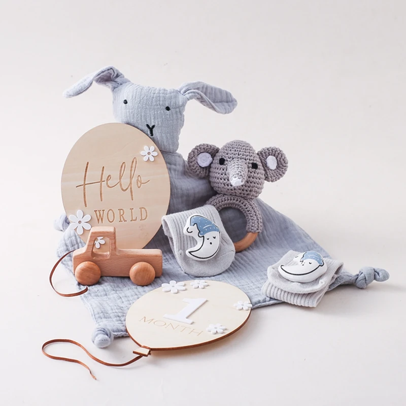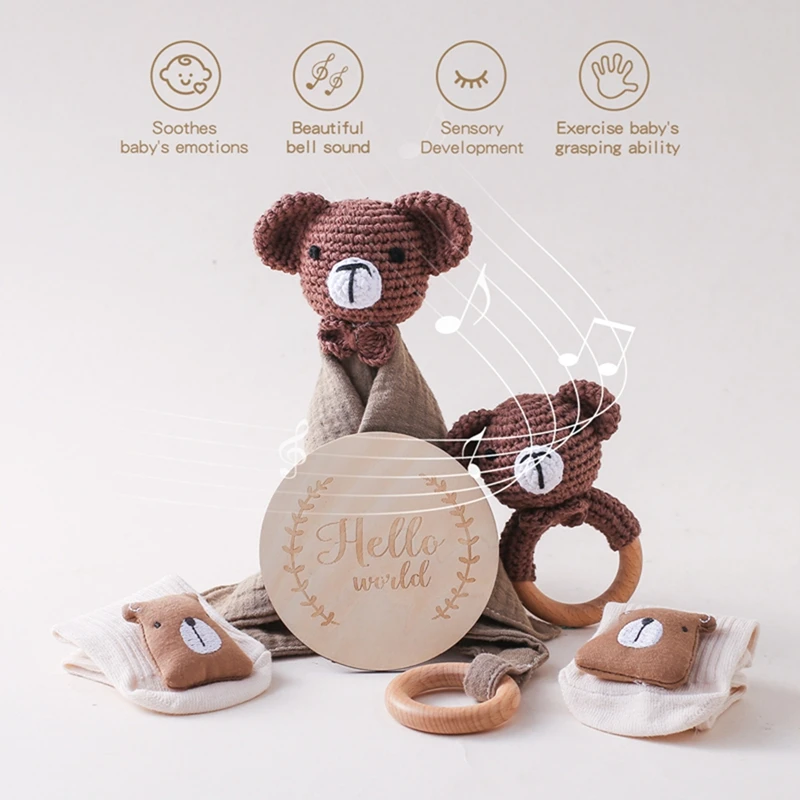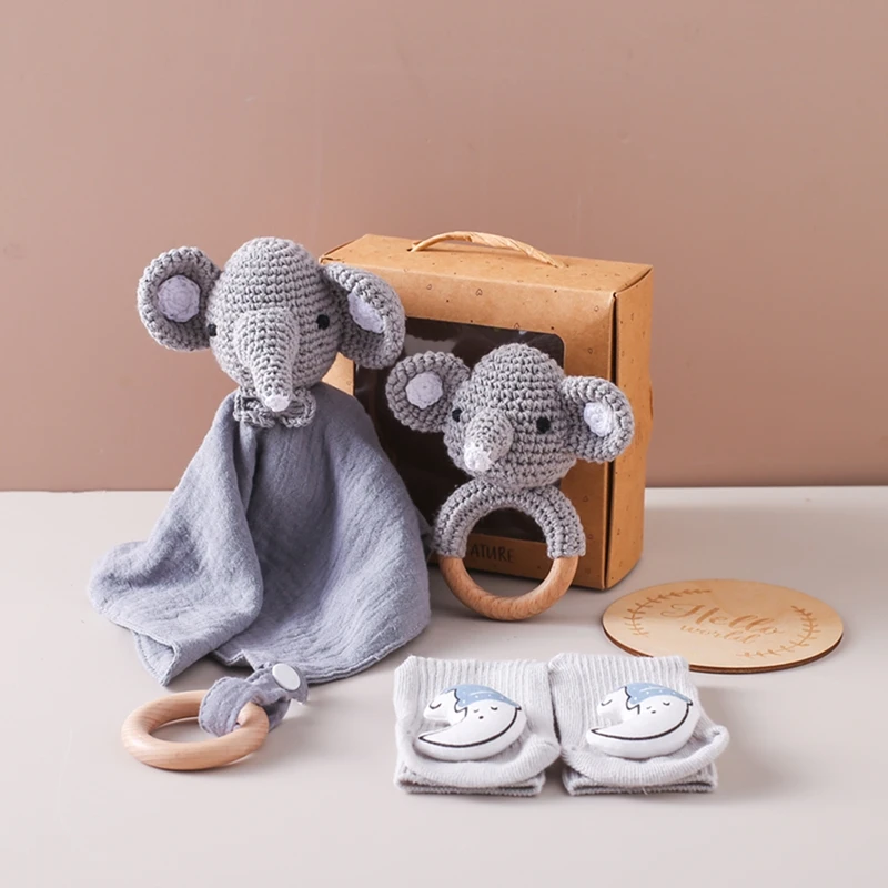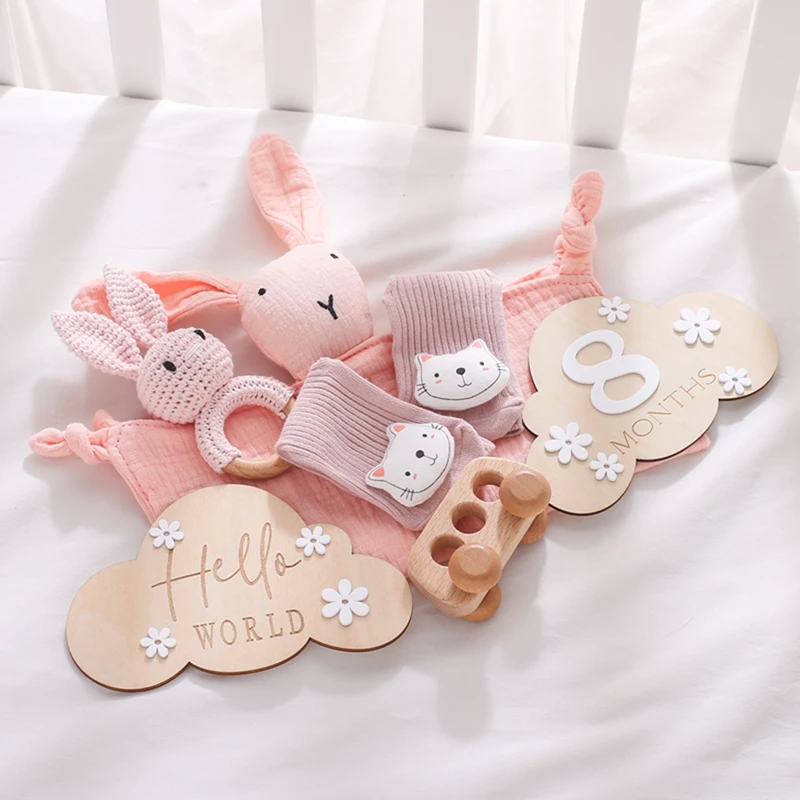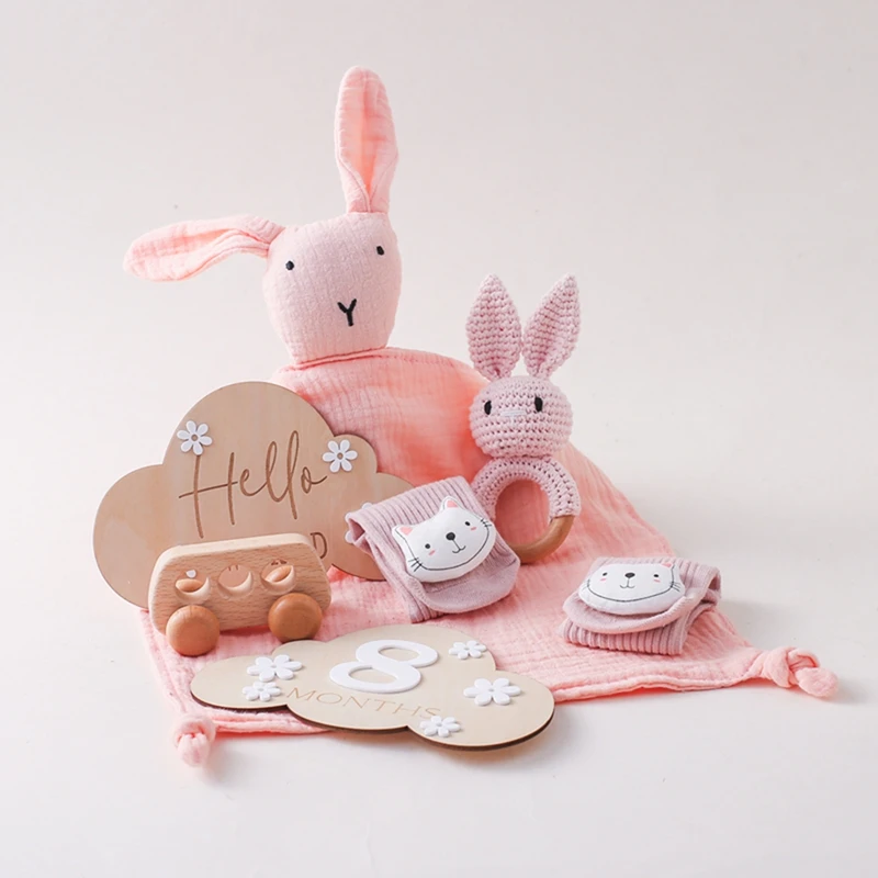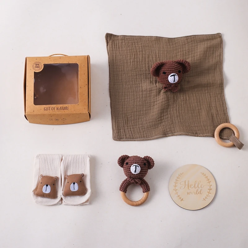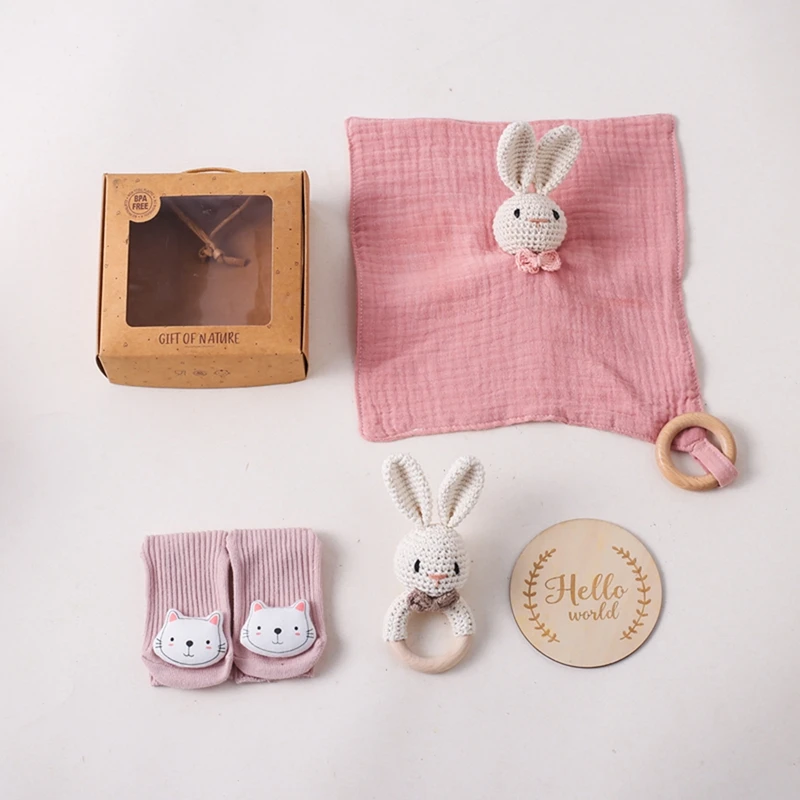 Bebé de madera de ganchillo conejito pulsera sonajero Manta de algodón cosas de baño toalla cepillo conjunto regalos caja cepillos toalla para Baby Shower regalo