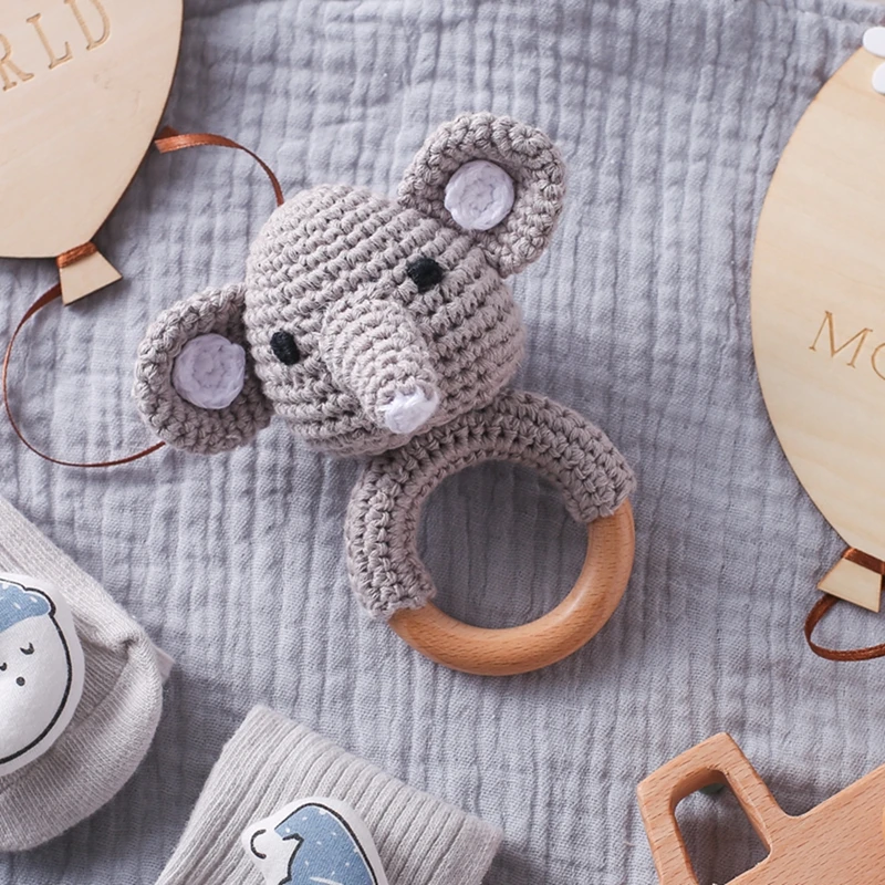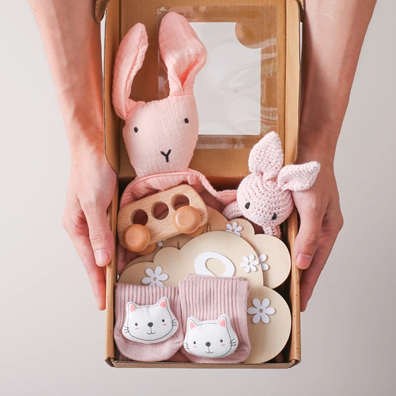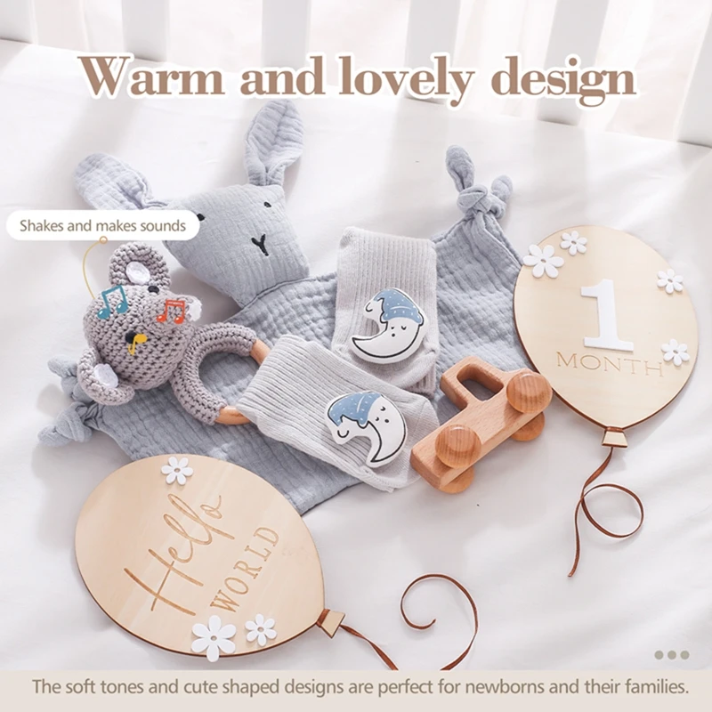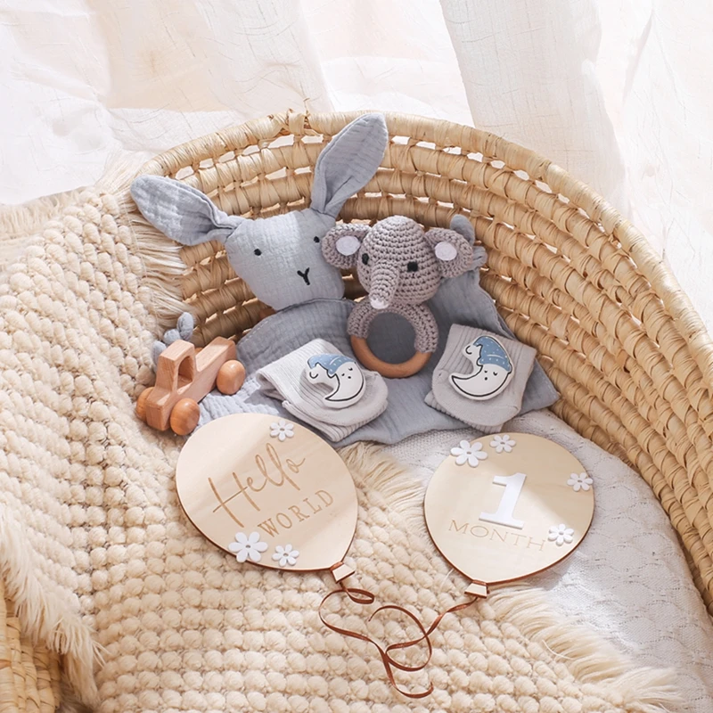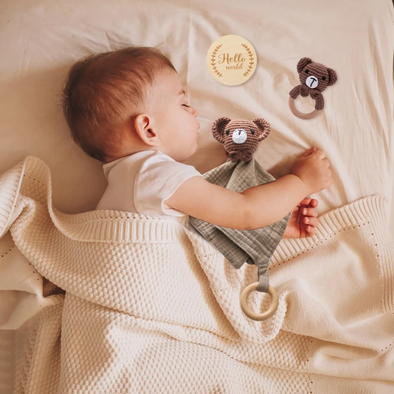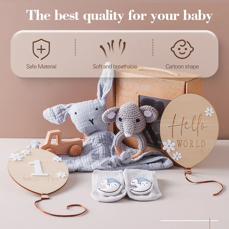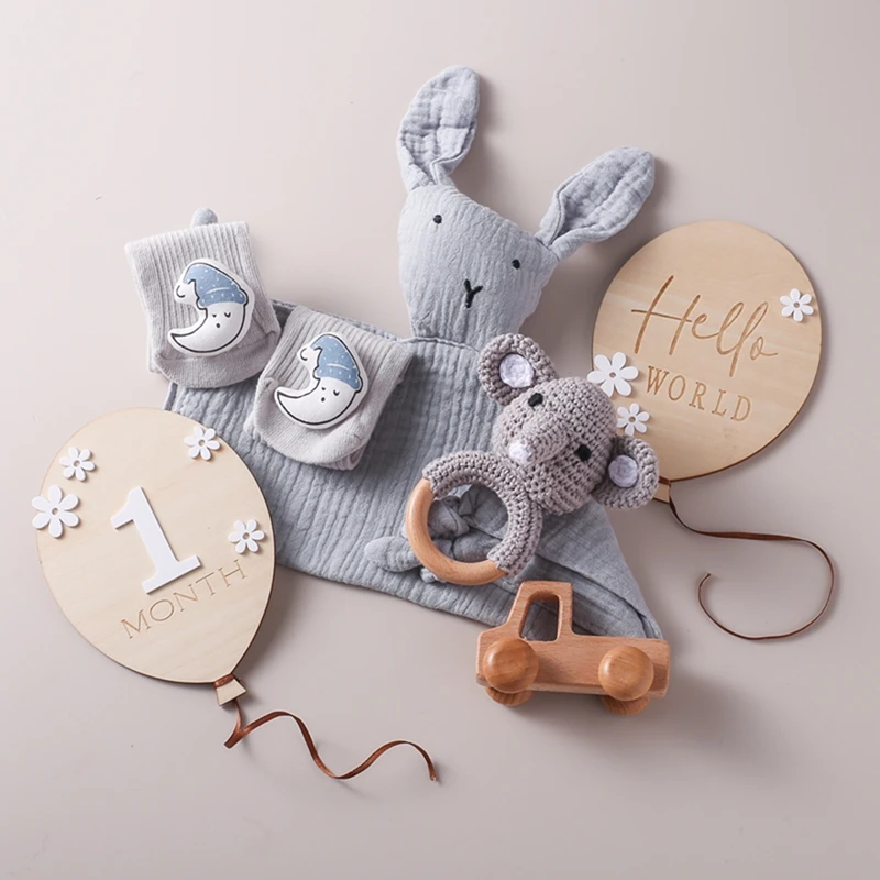 Bebé de madera de ganchillo conejito pulsera sonajero Manta de algodón cosas de baño toalla cepillo conjunto regalos caja cepillos toalla para Baby Shower regalo