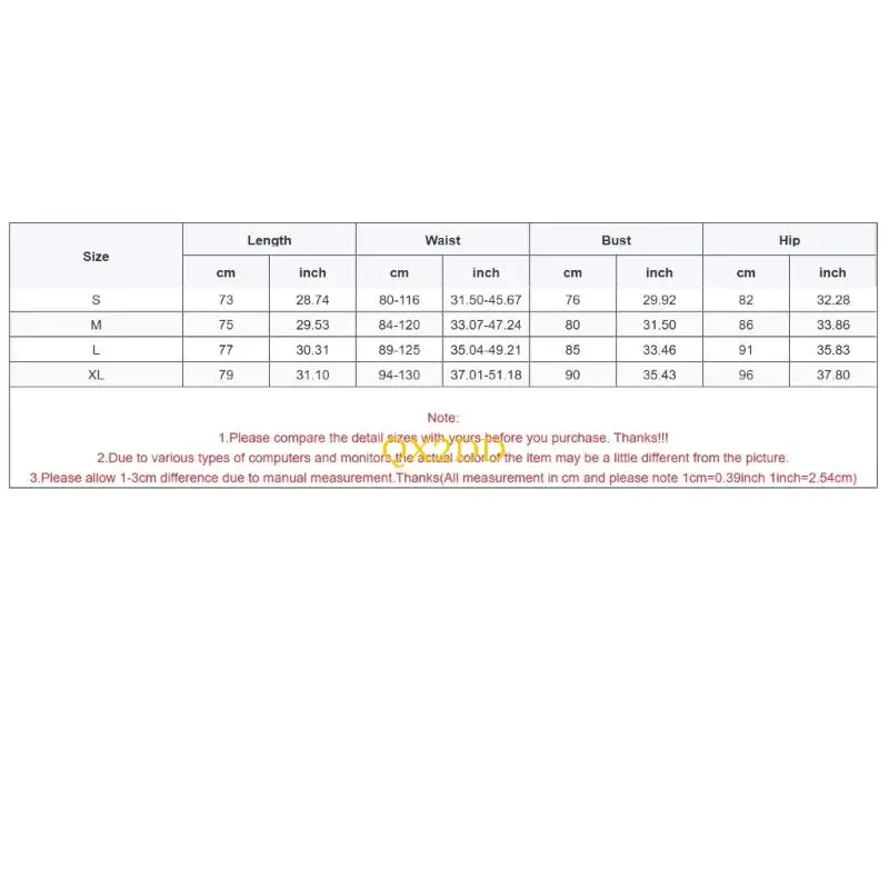 Tamaño: XL Longitud: 79 cm (31,10 pulgadas) Busto: 90 cm (35,43 pulgadas) Cintura: 94-130 cm (37,01-51,18 pulgadas) Cadera: 96 cm (37,80 pulgadas)