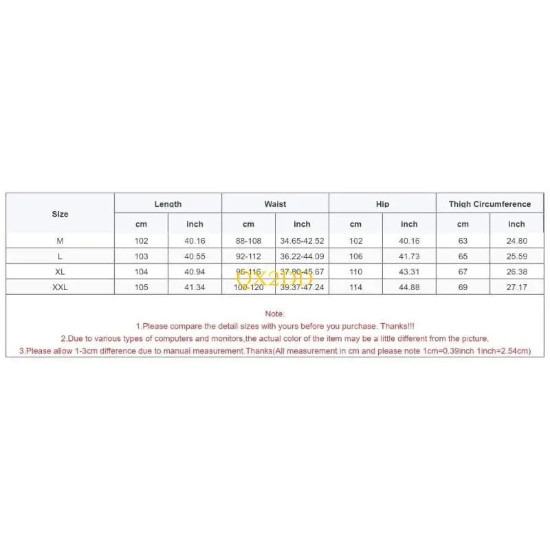 Tamaño: XXL Longitud: 105 cm (41,34 pulgadas) Cintura: 100-120 cm (39,37-47,24 pulgadas) Cadera: 114 cm (44,88 pulgadas) Circunferencia del muslo: 69 cm (27,17 pulgadas)
