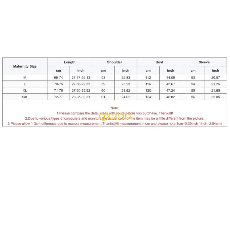 Tamaño de maternidad: XL Longitud: 71-76 cm (27,95-29,92 pulgadas) Hombro: 60 cm (23,62 pulgadas) Busto: 120 cm (47,24 pulgadas) Manga: 55 cm (21,65 pulgadas)