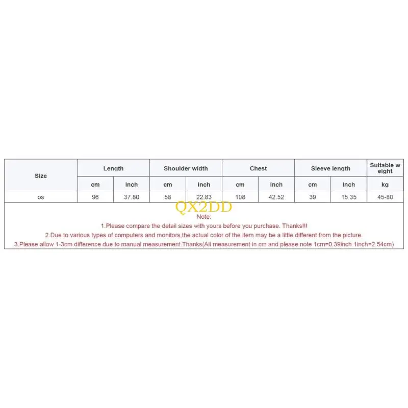 Tamaño: os Longitud: 96 cm (37,80 pulgadas) Ancho de hombros: 58 cm (22,83 pulgadas) Pecho: 108 cm (42,52 pulgadas) Longitud de la manga: 39 cm (15,35 pulgadas) Peso adecuado: 45-80 kg