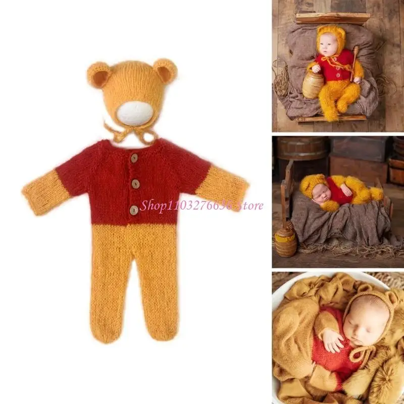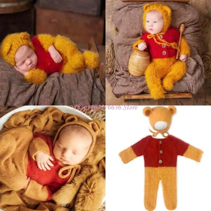 La foto perfecta para recién nacidos con el conjunto de ropa para fotografía de recién nacidos que presenta un sombrero con orejas de oso mohair y monos para una apariencia adorable.