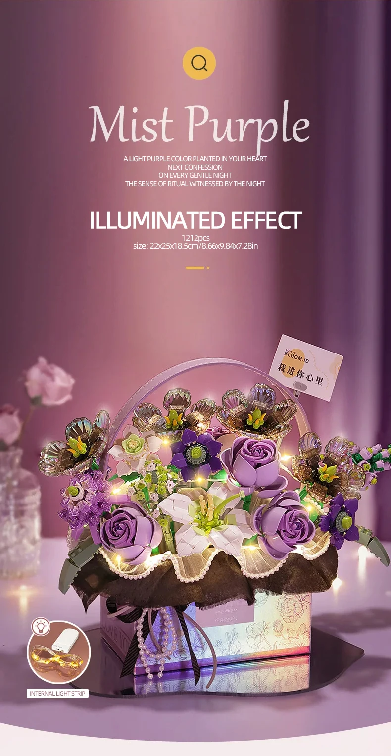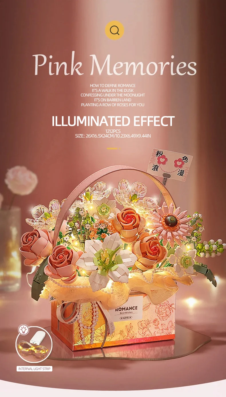 3.Iluminado con luces: agregando un toque de magia, este juego de bloques de construcción viene con luces incorporadas.Observe cómo se ilumina el ramo de la canasta de rosas rosas, creando una experiencia visual cautivadora para los niños.El suave brillo realza la atmósfera de juego y agrega un elemento adicional de maravilla y emoción.