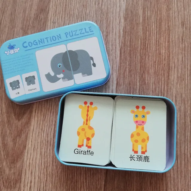 Comprar Rompecabezas cognitivo para bebés, juguetes para niños pequeños, caja de hierro, tarjetas, juego a juego, tarjeta cognitiva, coche, fruta, rompecabezas de vida Animal