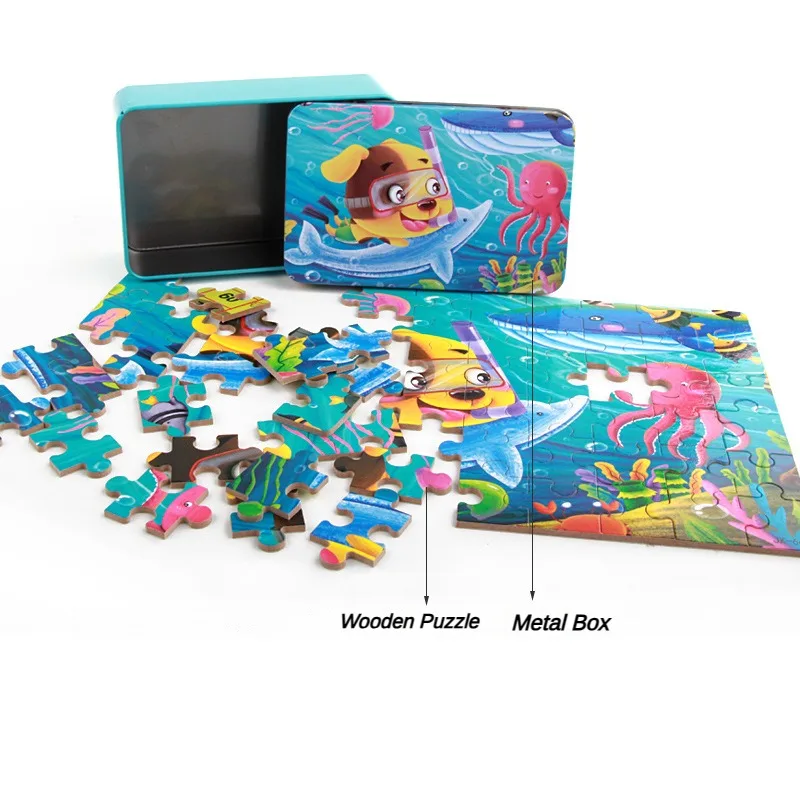 Rompecabezas de madera de 60 piezas para niños, rompecabezas educativo científico seguro con caja de Metal, diferentes temas, coloridos, regalos creativos de personajes