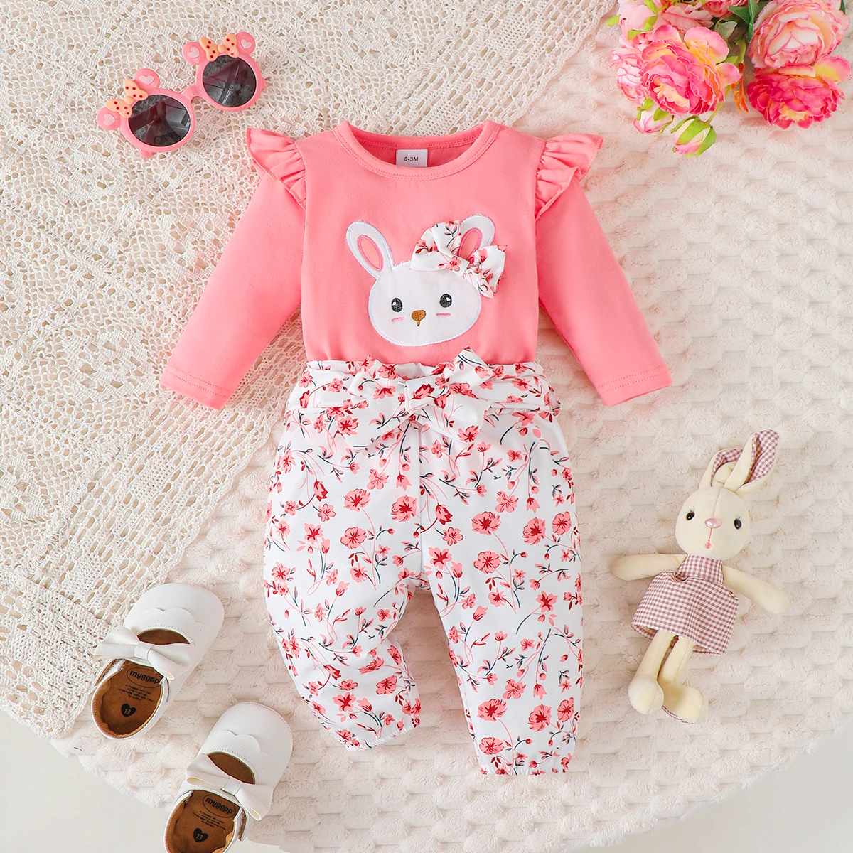 Ropa de 3 uds para niña, trajes de manga larga, mono de conejo encantador, pantalones de flores y diadema, ropa informal de otoño para bebé de 0 a 18M