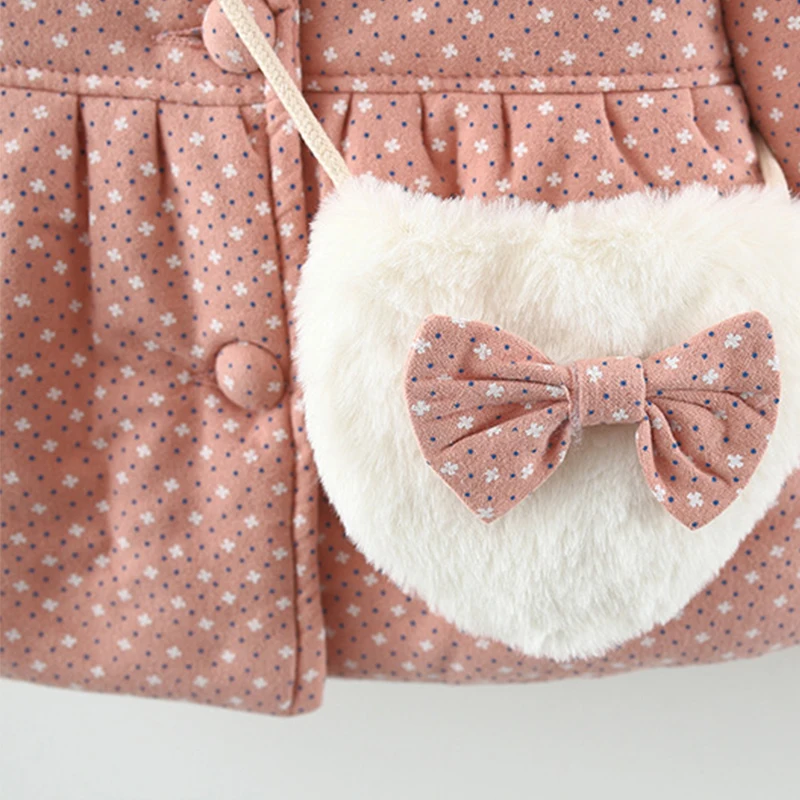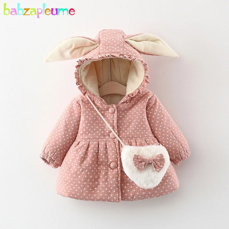 Ropa de abrigo de invierno para niña pequeña, chaqueta de dibujos animados coreanos, abrigo grueso cálido con capucha de lunares, bolsa, Tops para bebé, BC028