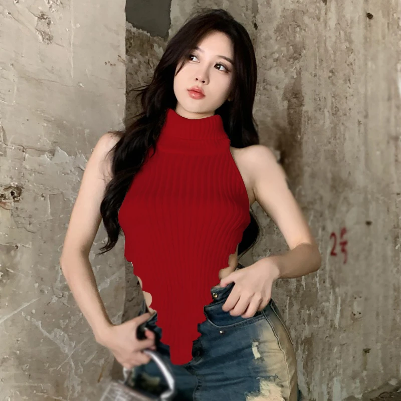 Comprar Ropa Base de cuello alto de Color sólido para mujer, chaleco elástico ajustado Sexy sin espalda, Chaleco de punto Irregular sin mangas, Top de verano