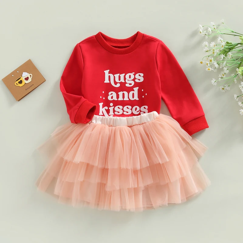 Comprar Ropa de bebé para niños y niñas, traje de manga larga con cuello redondo, letras, Tops, Vestido corto forrado de malla, conjunto de ropa para niños