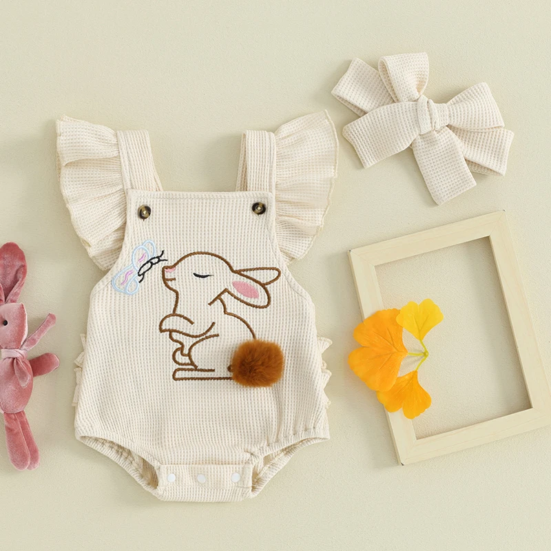 Ropa para bebés pequeños, 2 uds., trajes de Pascua, manga con volantes, mameluco bordado de conejito, conjunto de diadema, ropa para niños recién nacidos