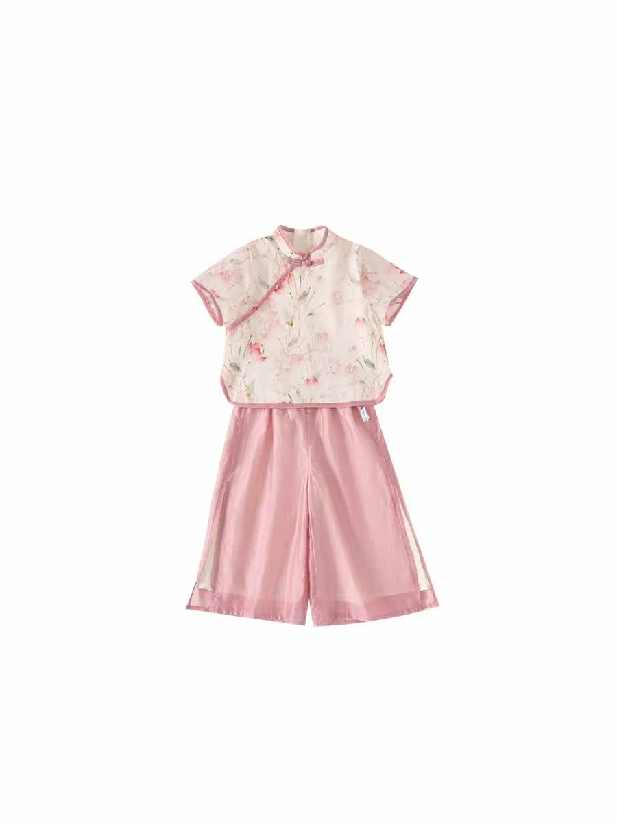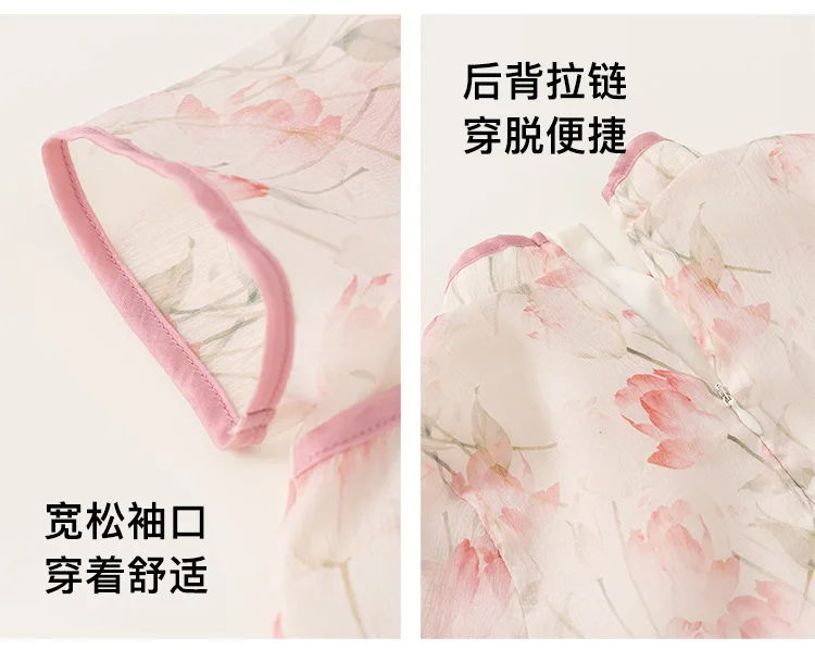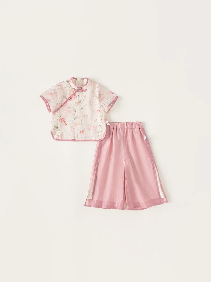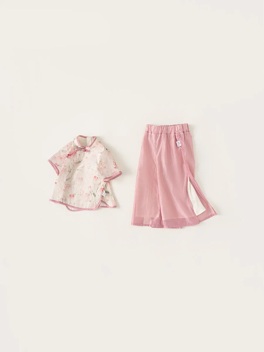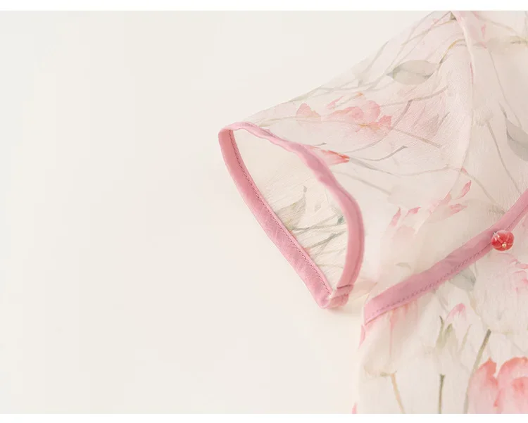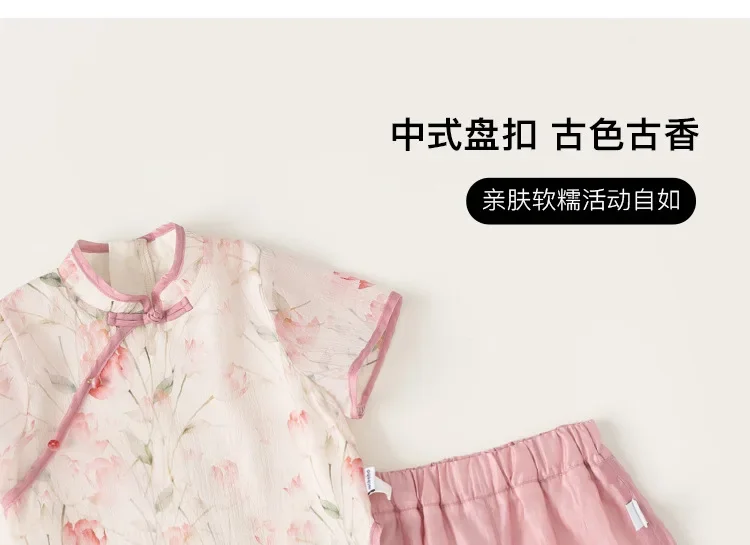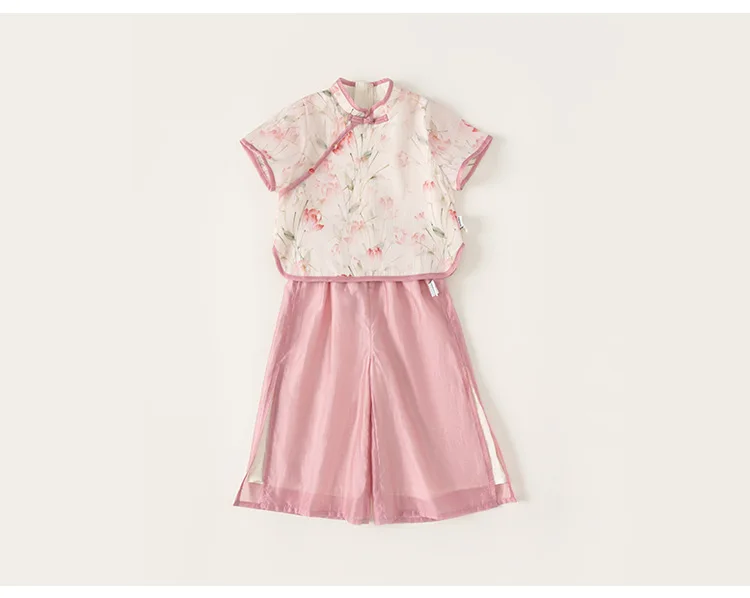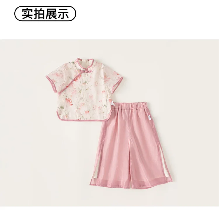 Ropa de Boutique de verano para niñas, 2 piezas, estilo chino, moda de flores, Tops rosas de manga corta para bebés + Pantalones de malla, ropa para niños B118