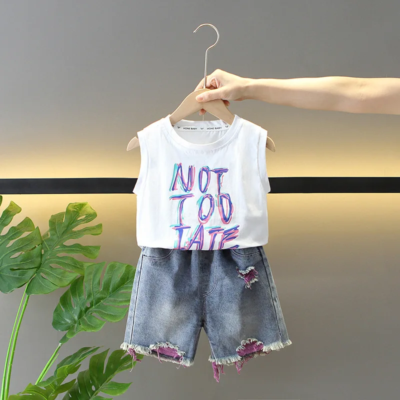 Ropa de Boutique de verano para niños, 2 piezas, moda coreana, Tops informales de algodón sin mangas con letras para bebés + pantalones cortos vaqueros, conjuntos para niños B002