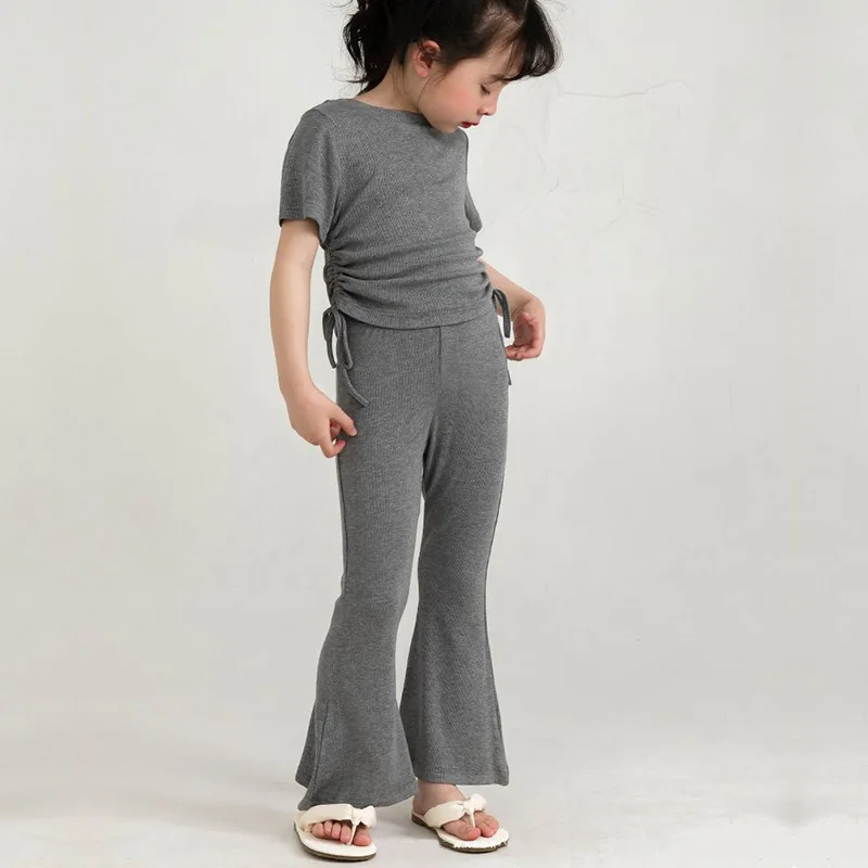 Ropa de casa de verano para niñas pequeñas, conjunto de ropa de manga corta, camiseta fina de Color sólido + Pantalones acampanados, 2 uds., tendencia de 2 a 6 años