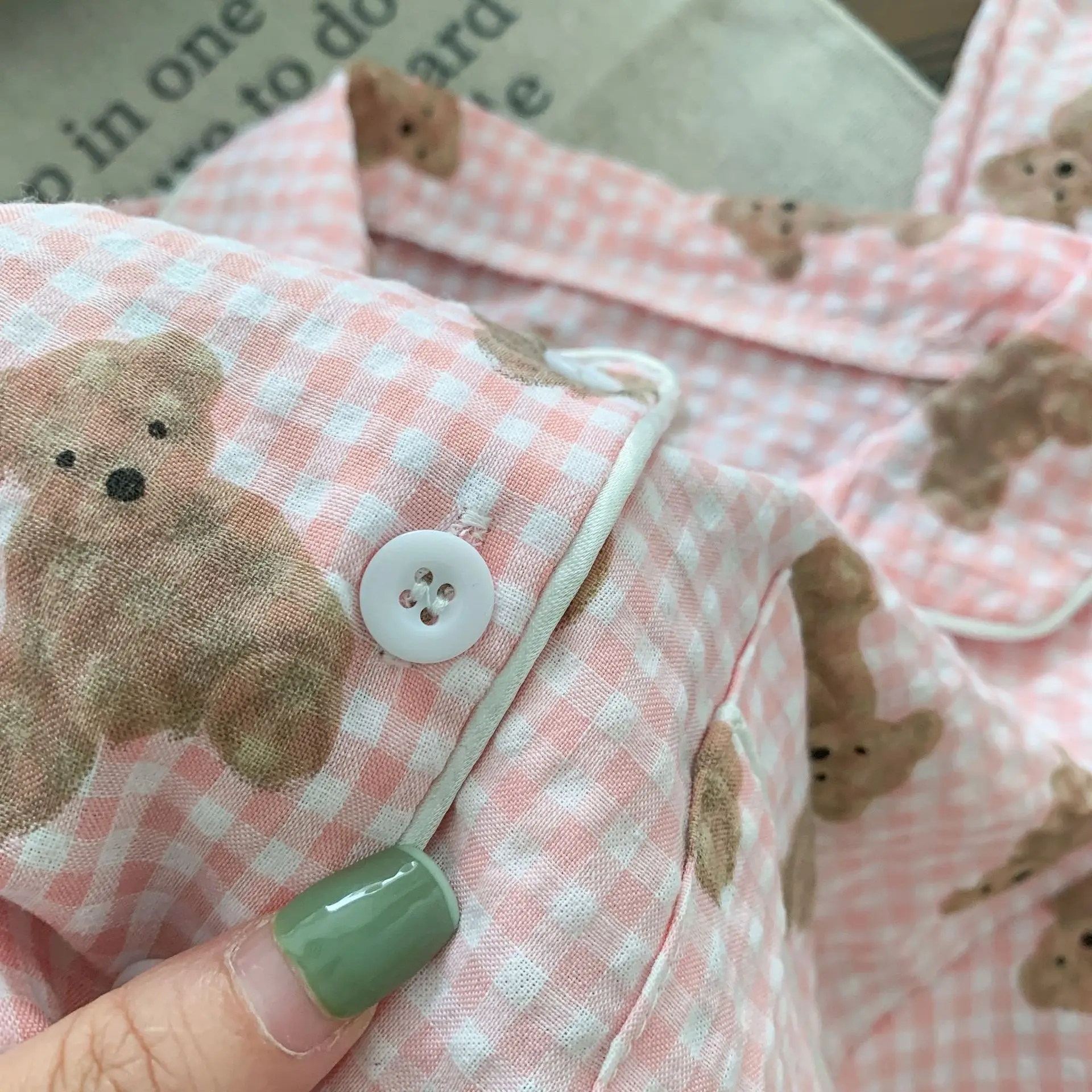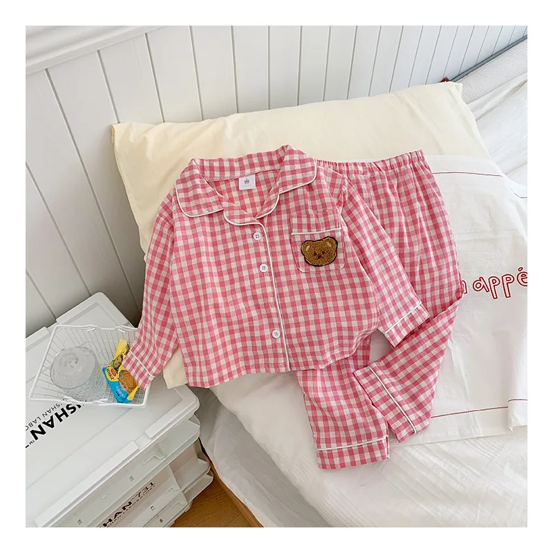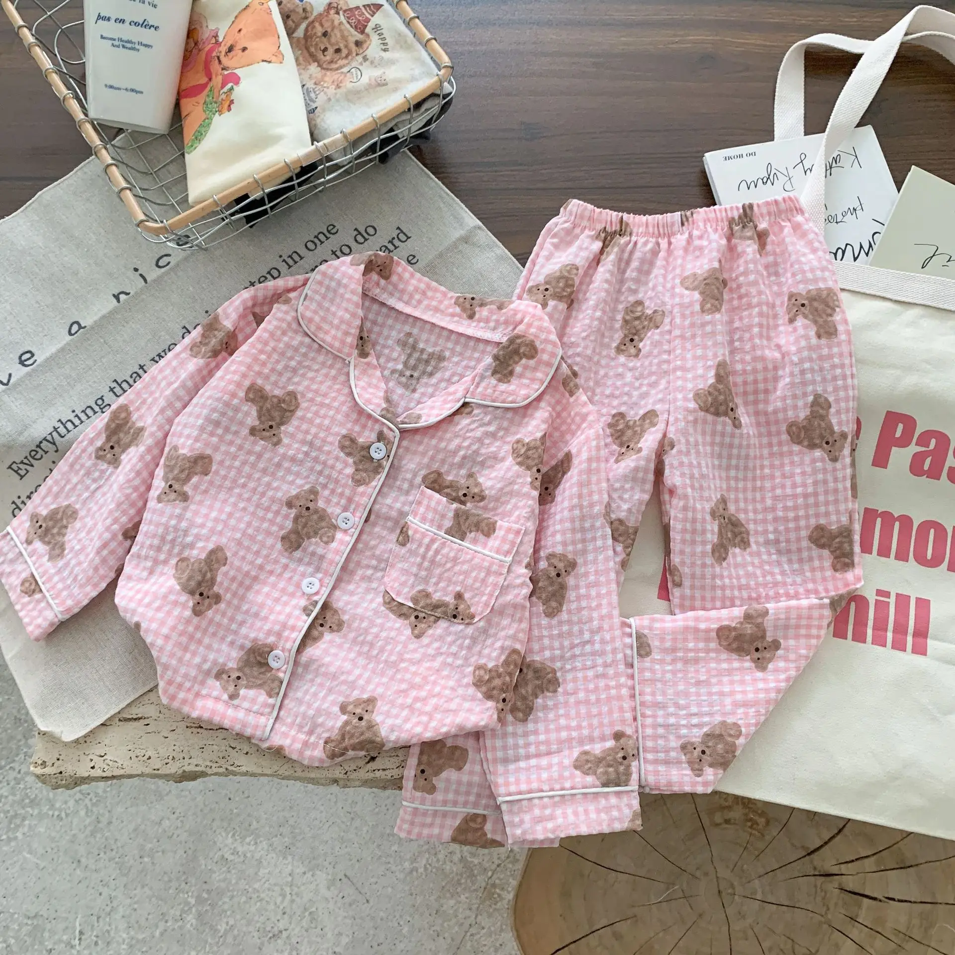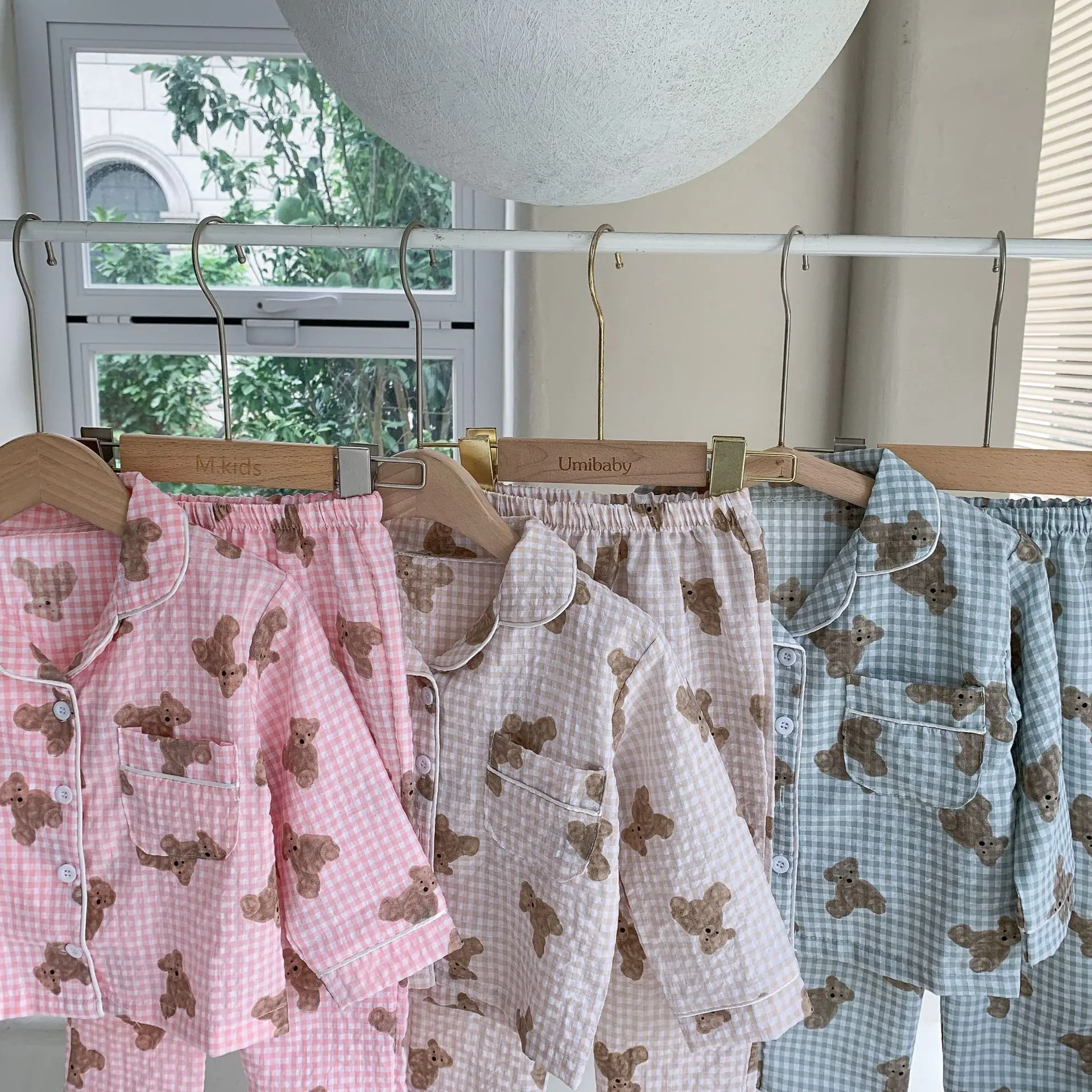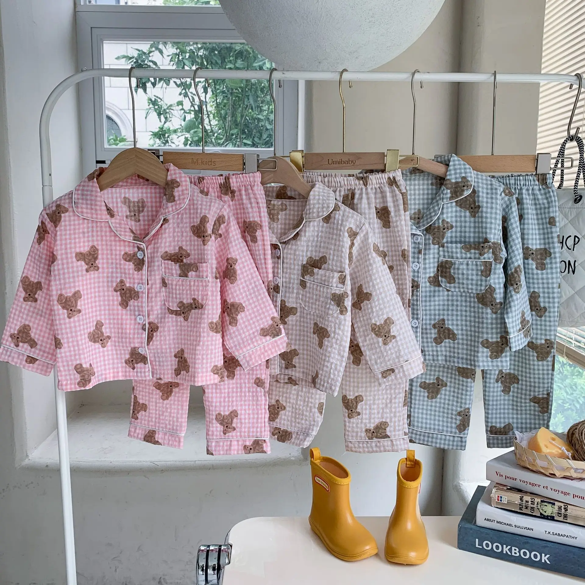 Ropa de dormir de algodón suave para niños y niñas, moda coreana, conjuntos de pijamas a cuadros con bonito oso de dibujos animados, ropa para el hogar para primavera y verano