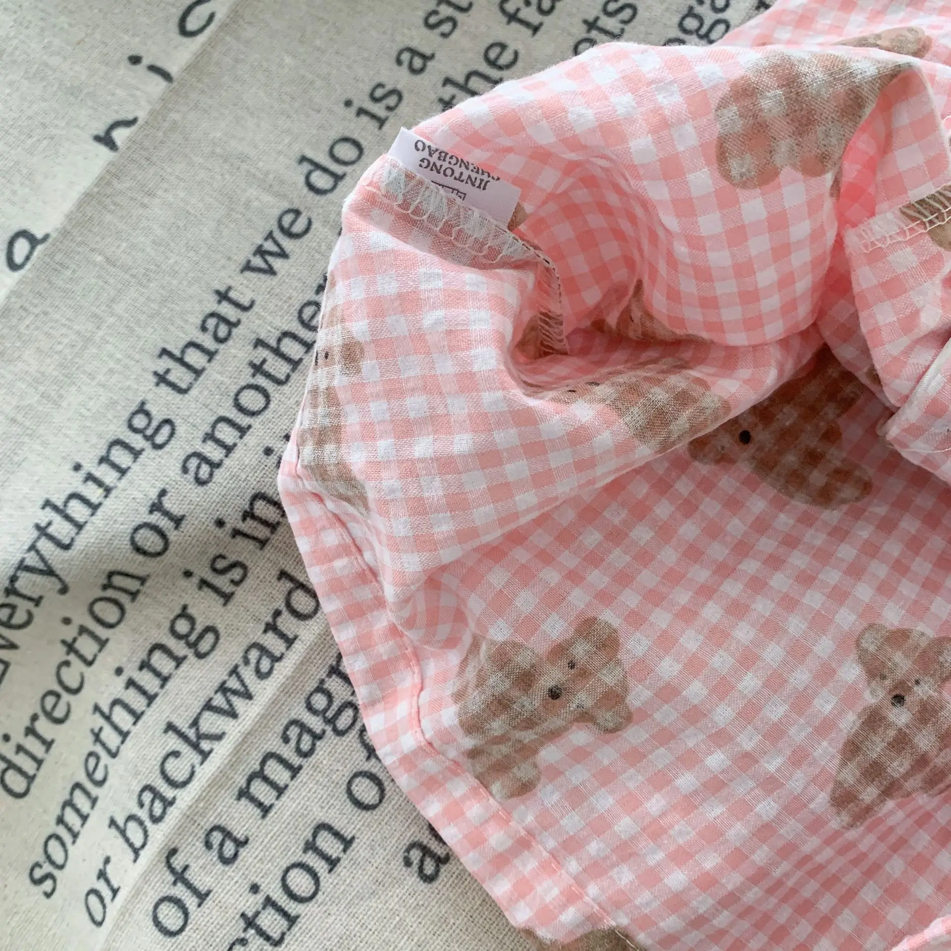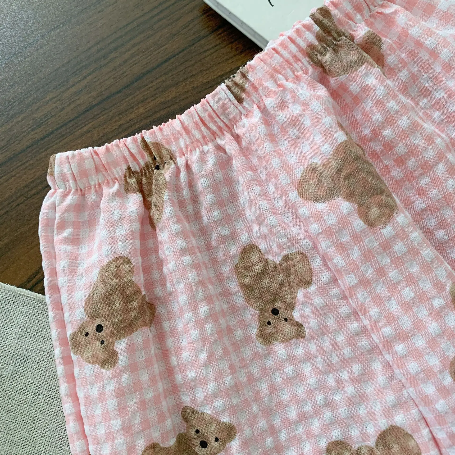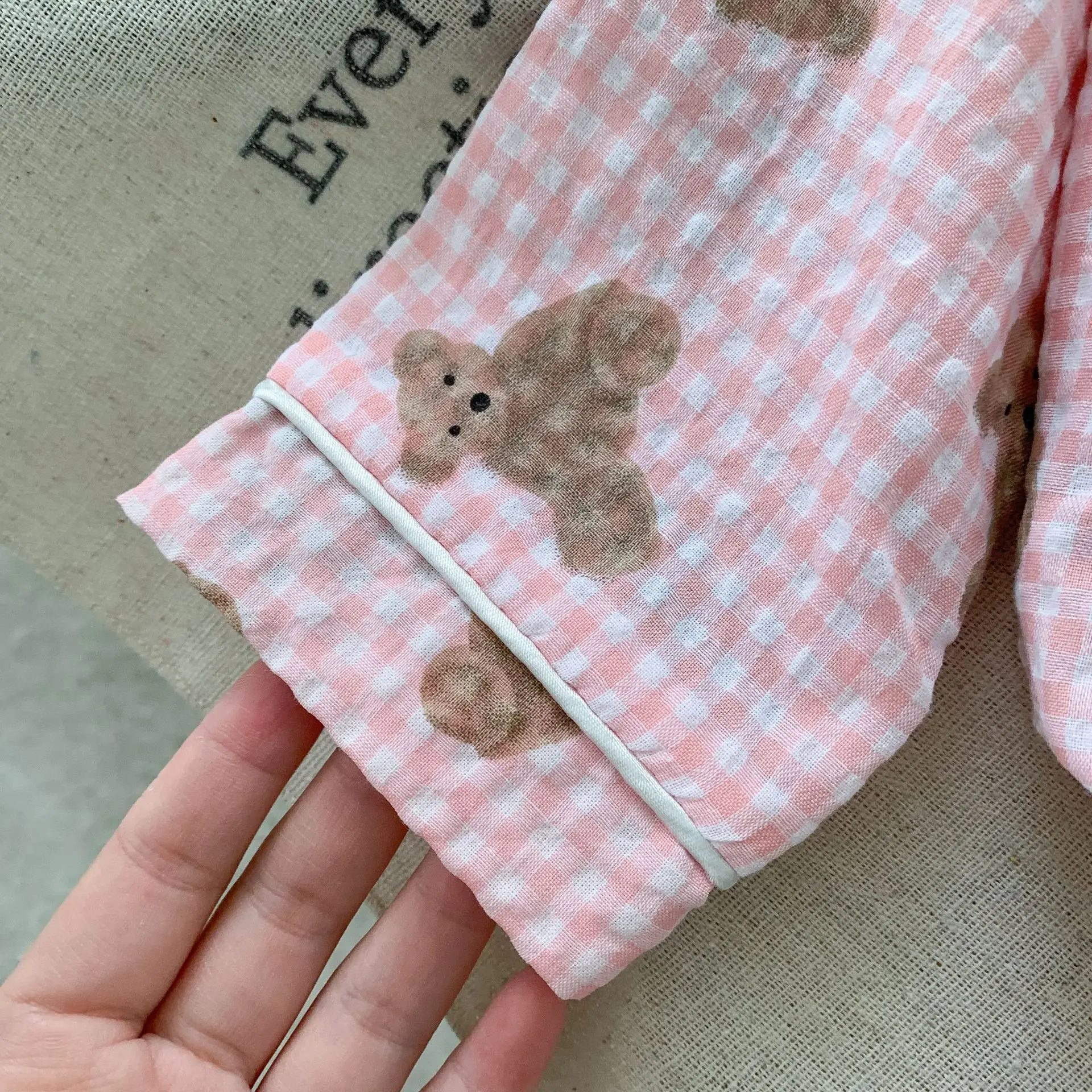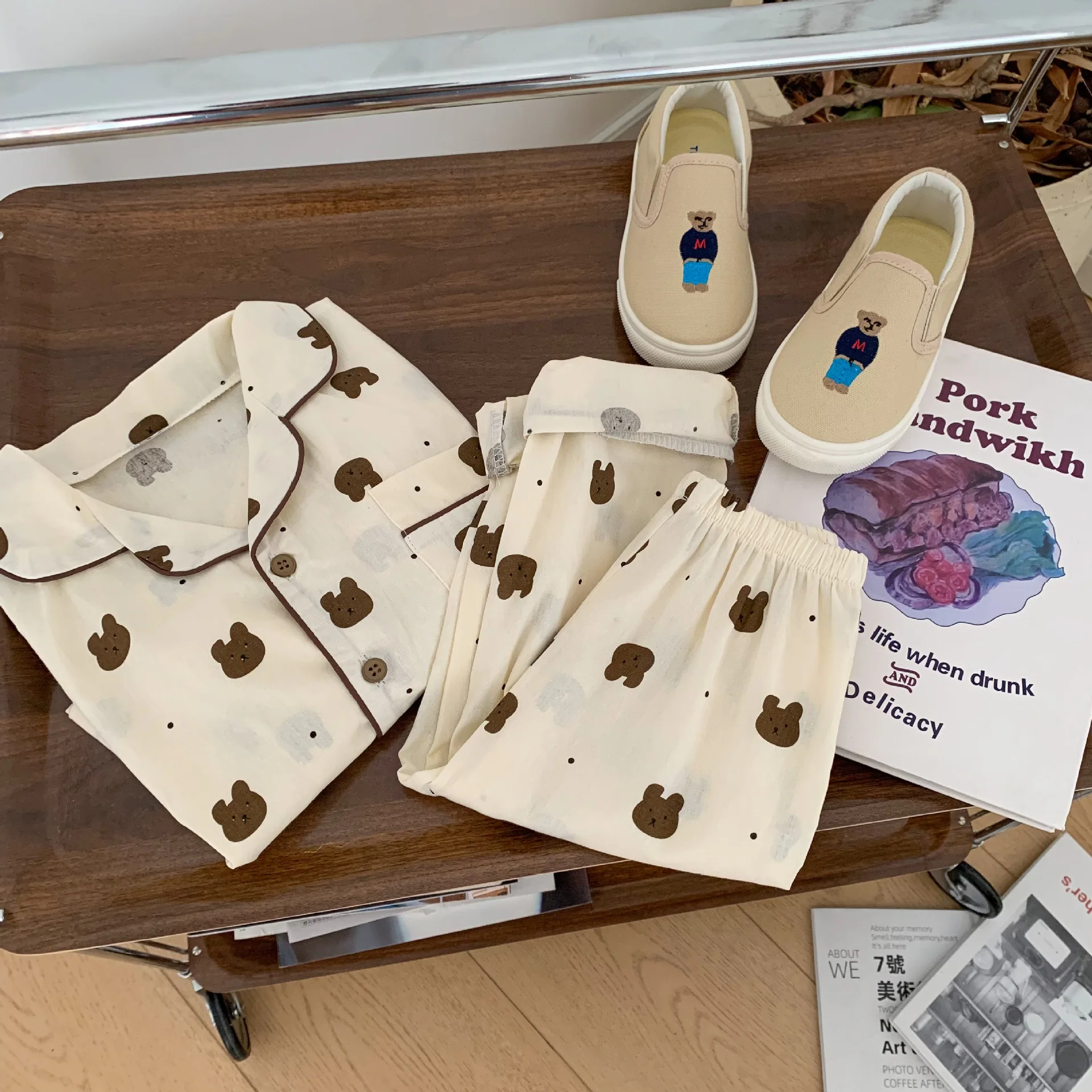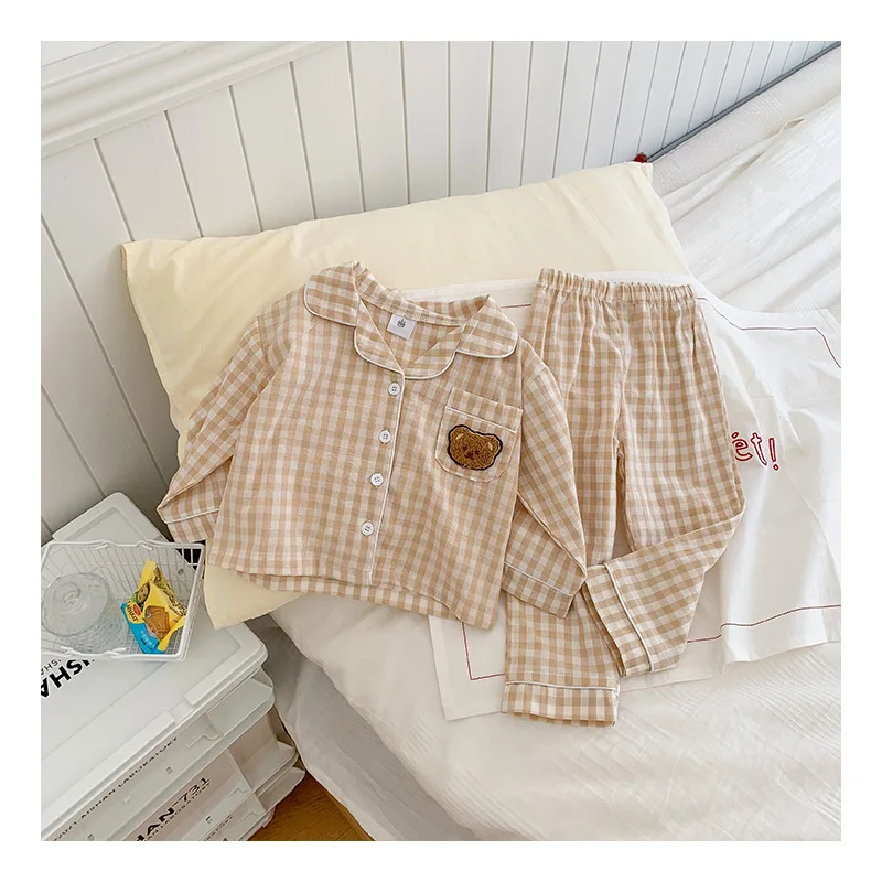 Ropa de dormir de algodón suave para niños y niñas, moda coreana, conjuntos de pijamas a cuadros con bonito oso de dibujos animados, ropa para el hogar para primavera y verano