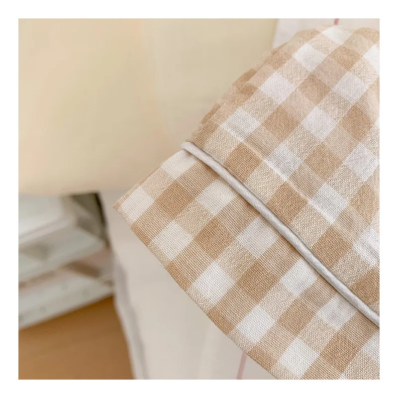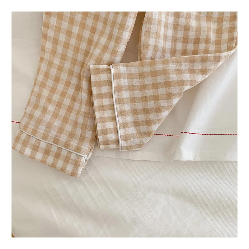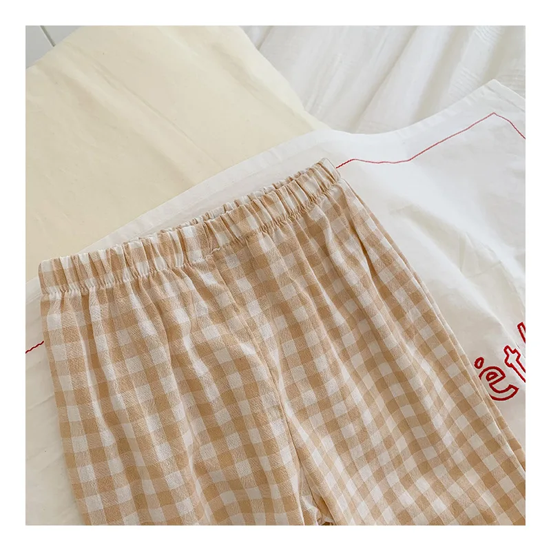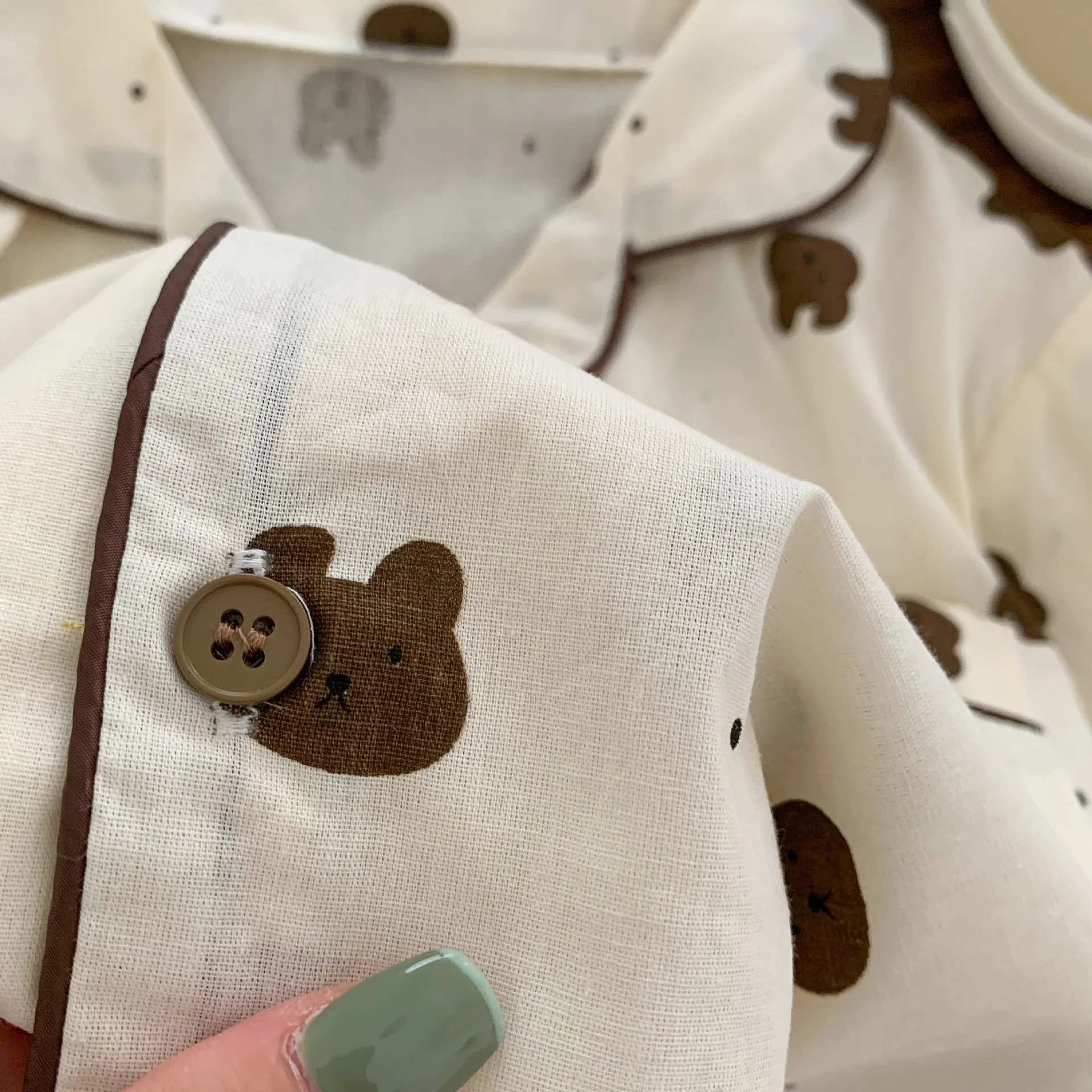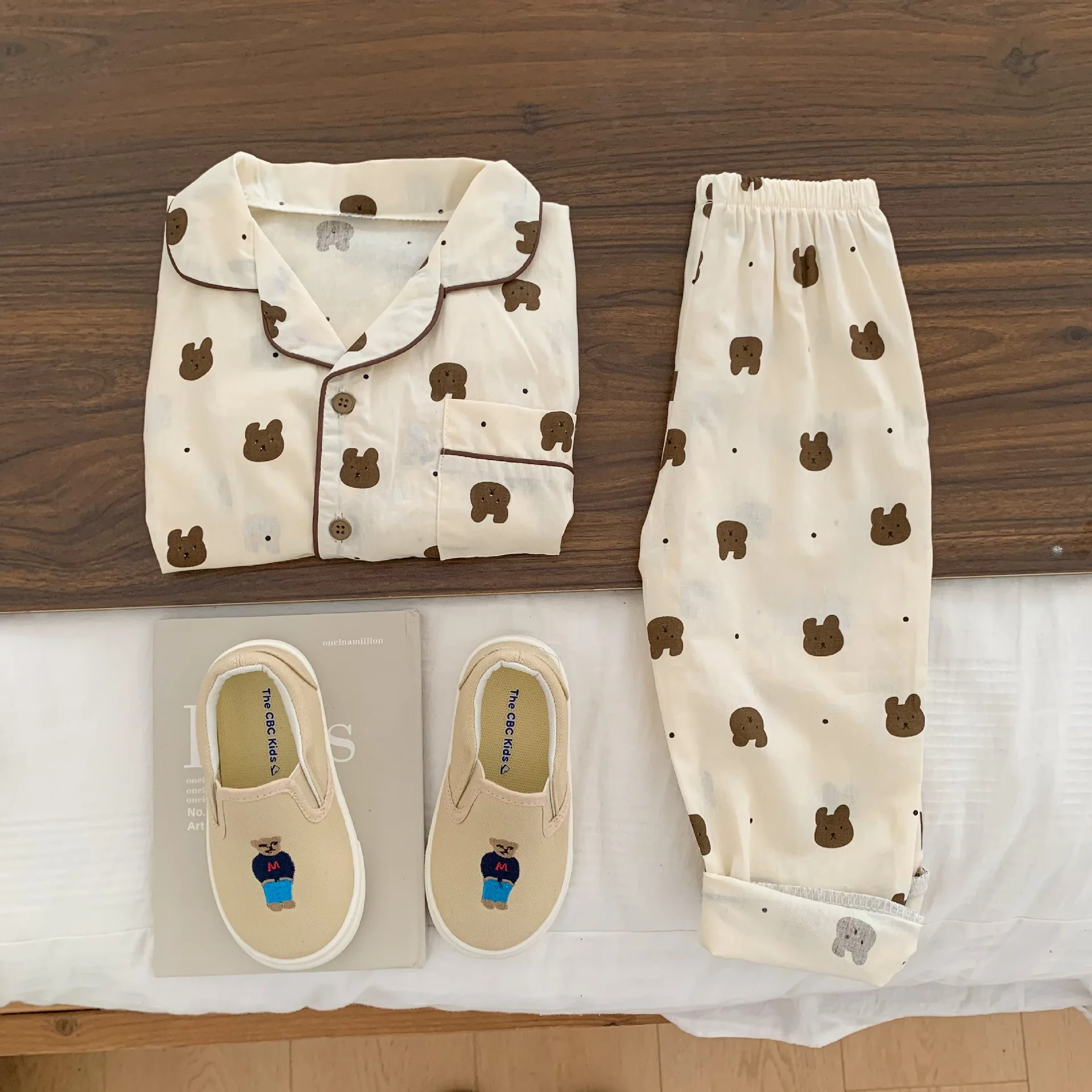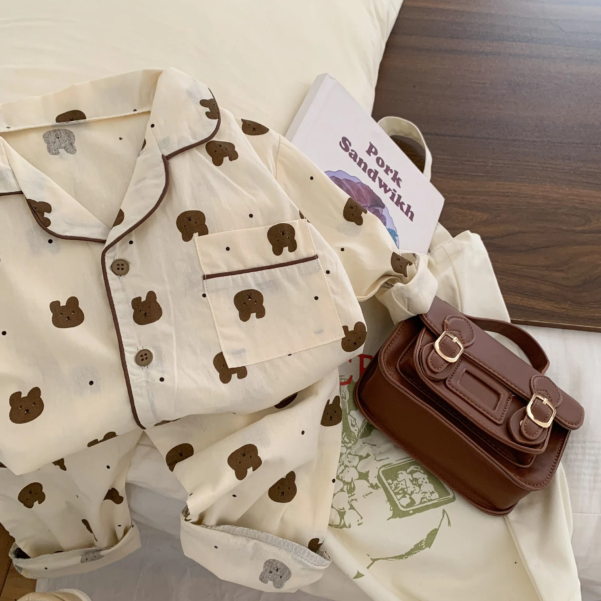 Ropa de dormir de algodón suave para niños y niñas, moda coreana, conjuntos de pijamas a cuadros con bonito oso de dibujos animados, ropa para el hogar para primavera y verano