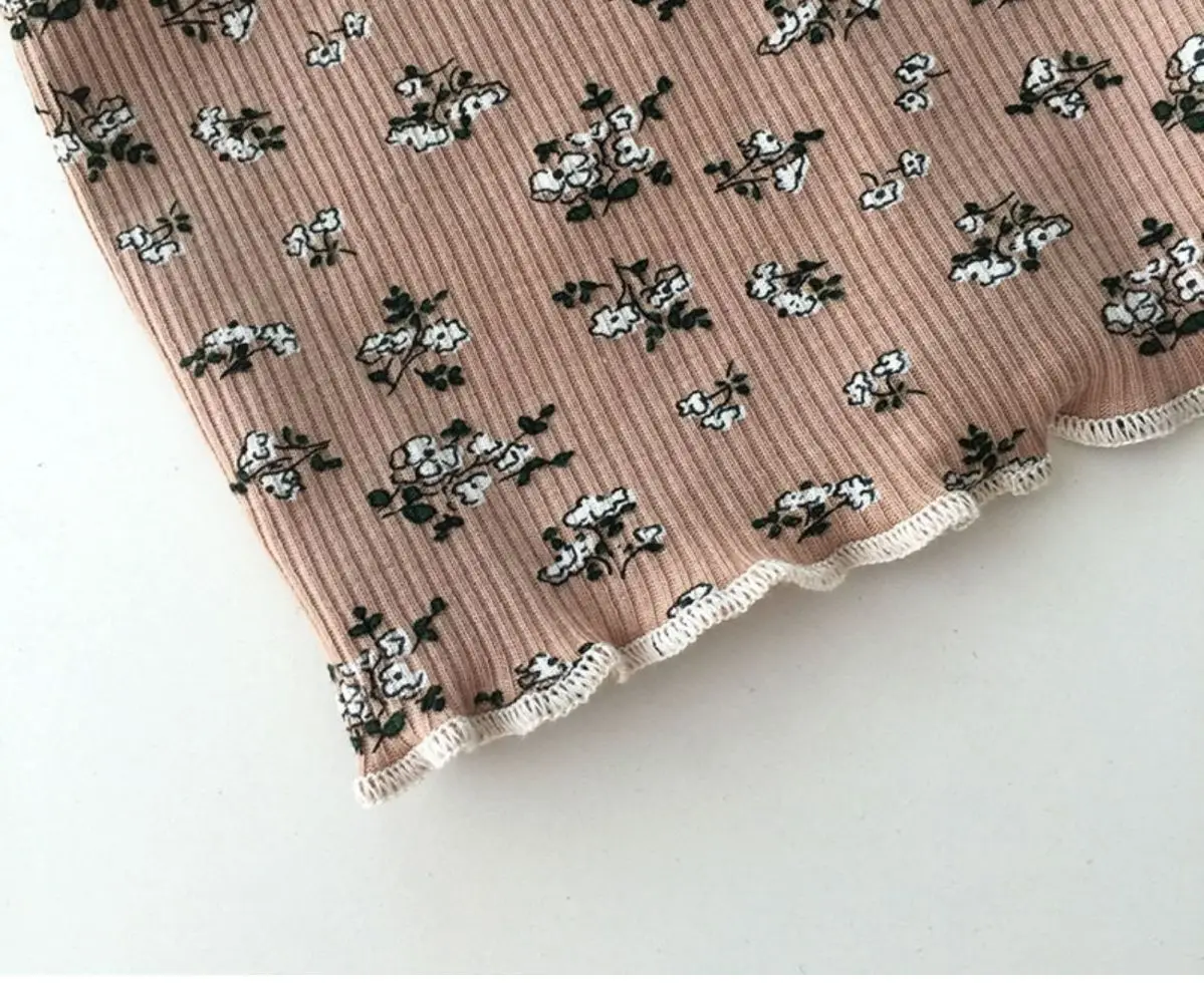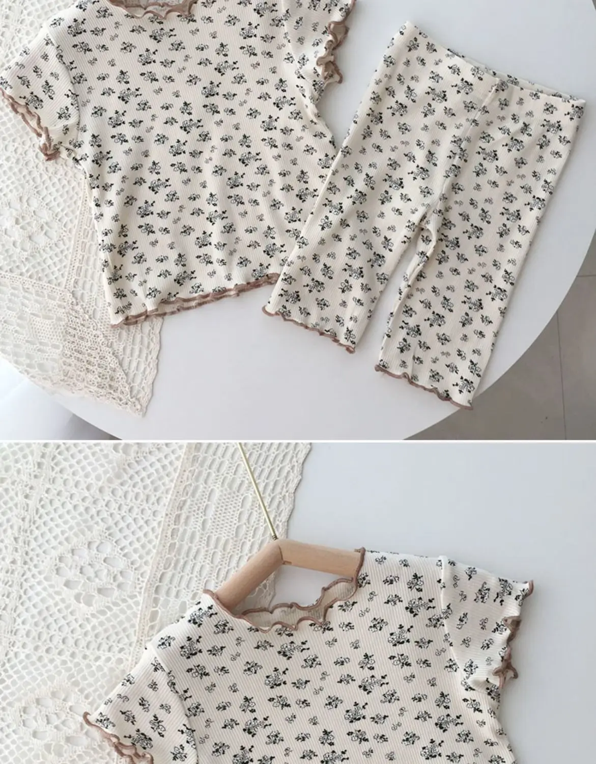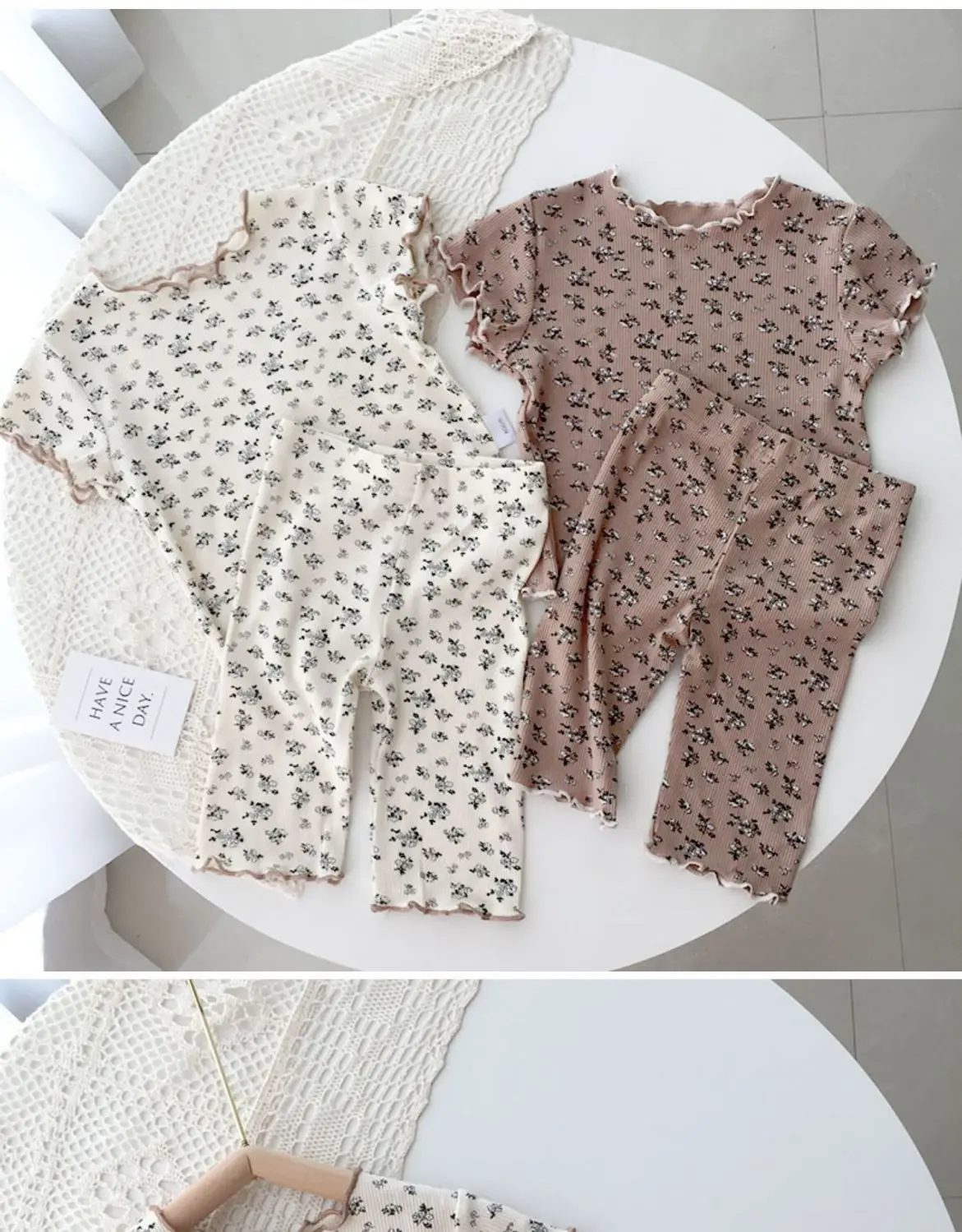 Ropa de dormir de verano de seda helada para niña, conjunto de pijama Floral con estampado bonito de Color café Beige para niños, Tops cortos de algodón suave, pantalones