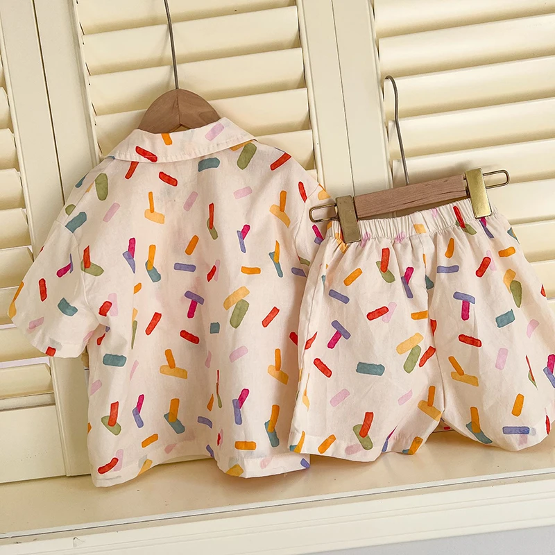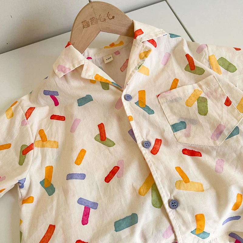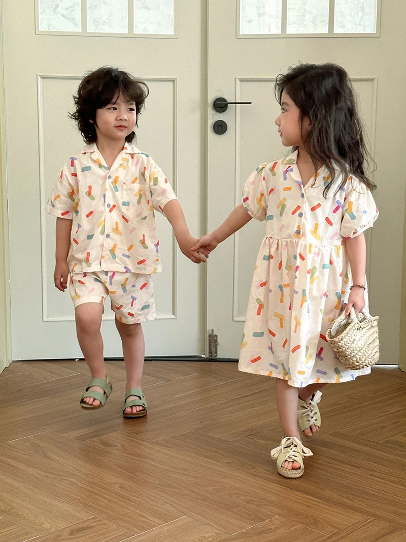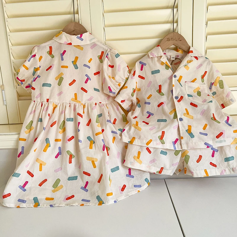 Diseño a juego conmovedor: Estilos coordinados para hermanos.El conjunto de 2 piezas para niño y el vestido para niña comparten estampados vibrantes y divertidos, creando momentos perfectos para fotografías, salidas o uso diario.