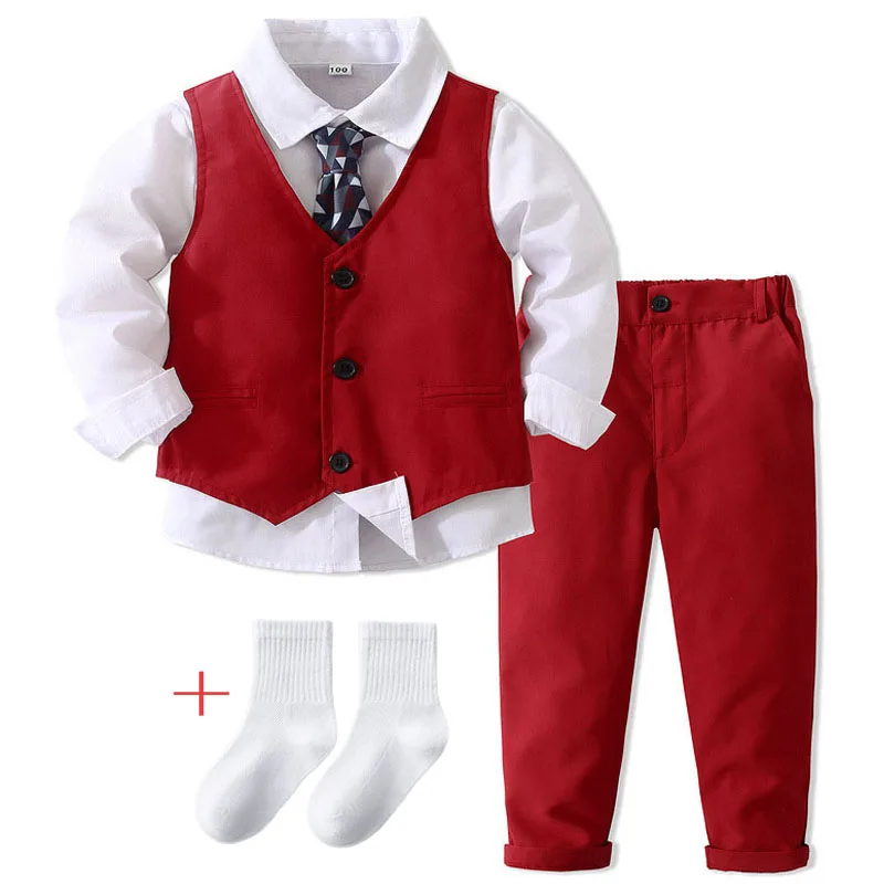 Ropa Formal para bebés, traje de manga larga con corbata, camisa, chaleco, pantalones, conjunto de 4 piezas para caballero, ropa de fiesta de boda y cumpleaños para niños