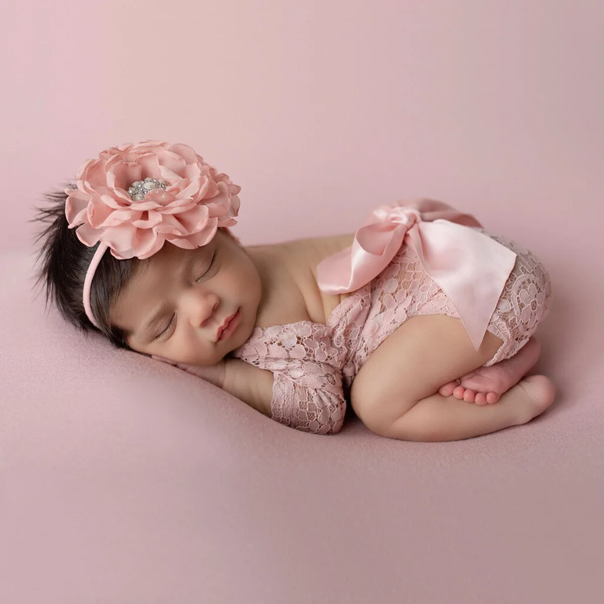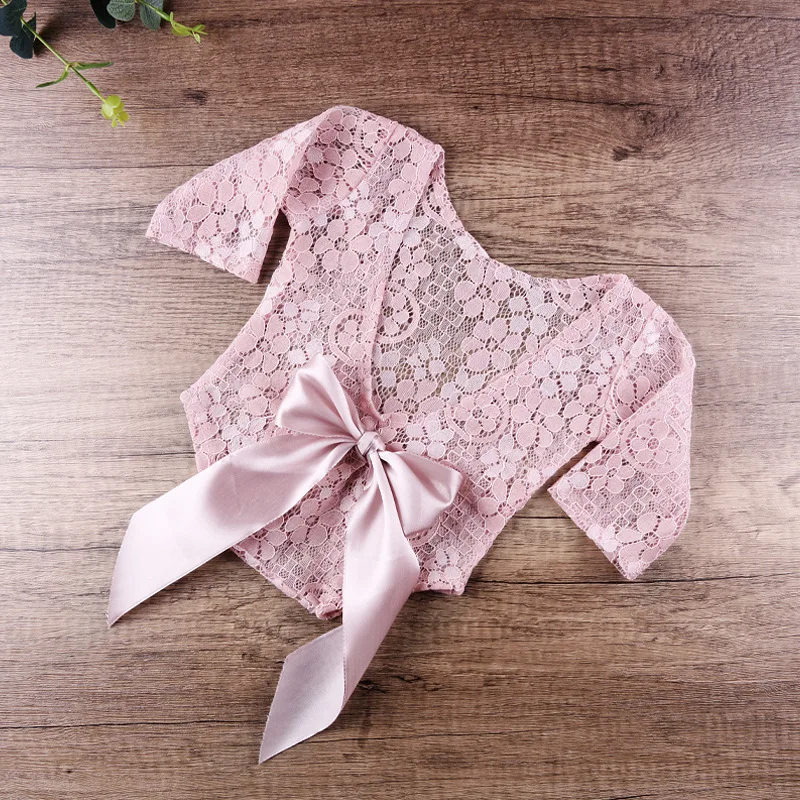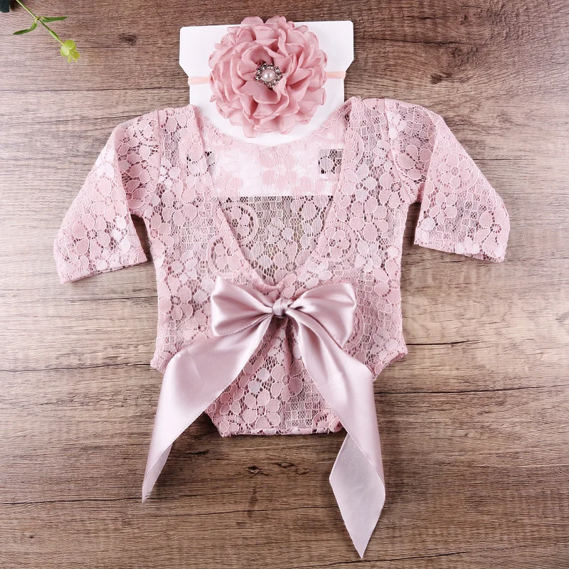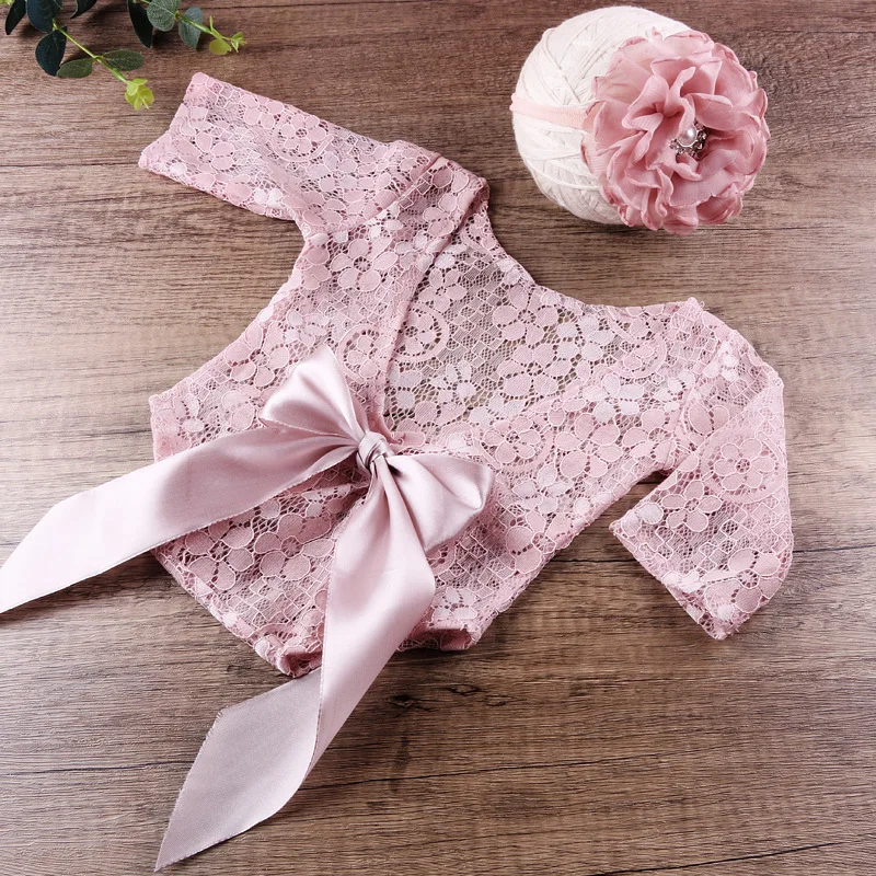 Comprar Ropa de fotografía para recién nacido, traje de fotografía de encaje, diadema de flores, camisa triangular sin espalda, disfraz de fotografía de dos piezas de encaje