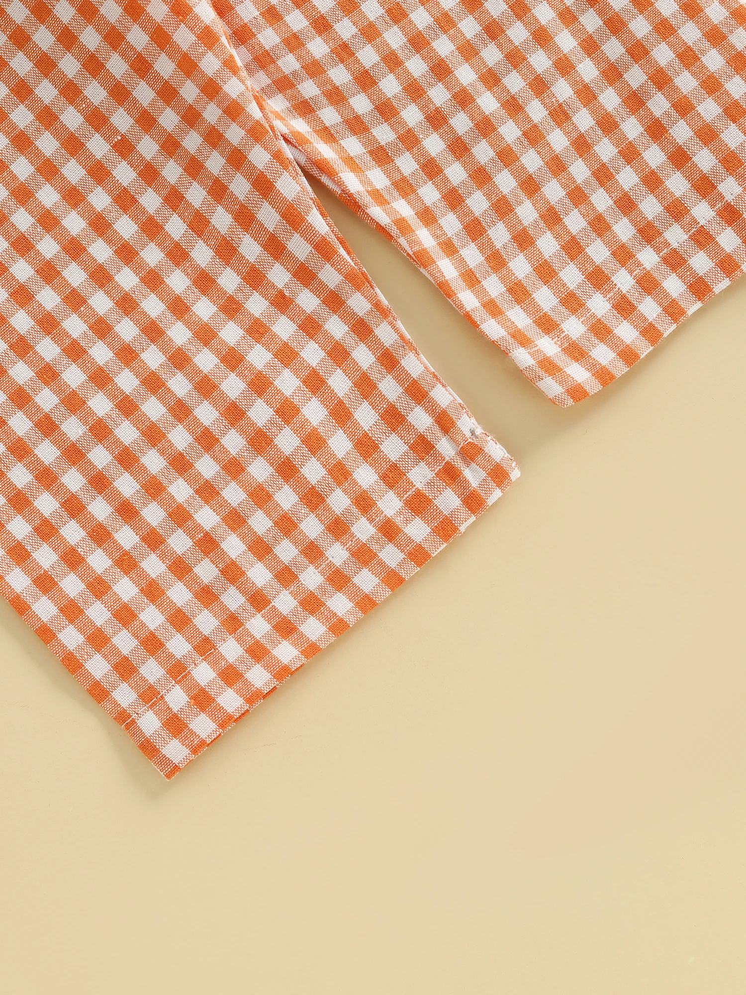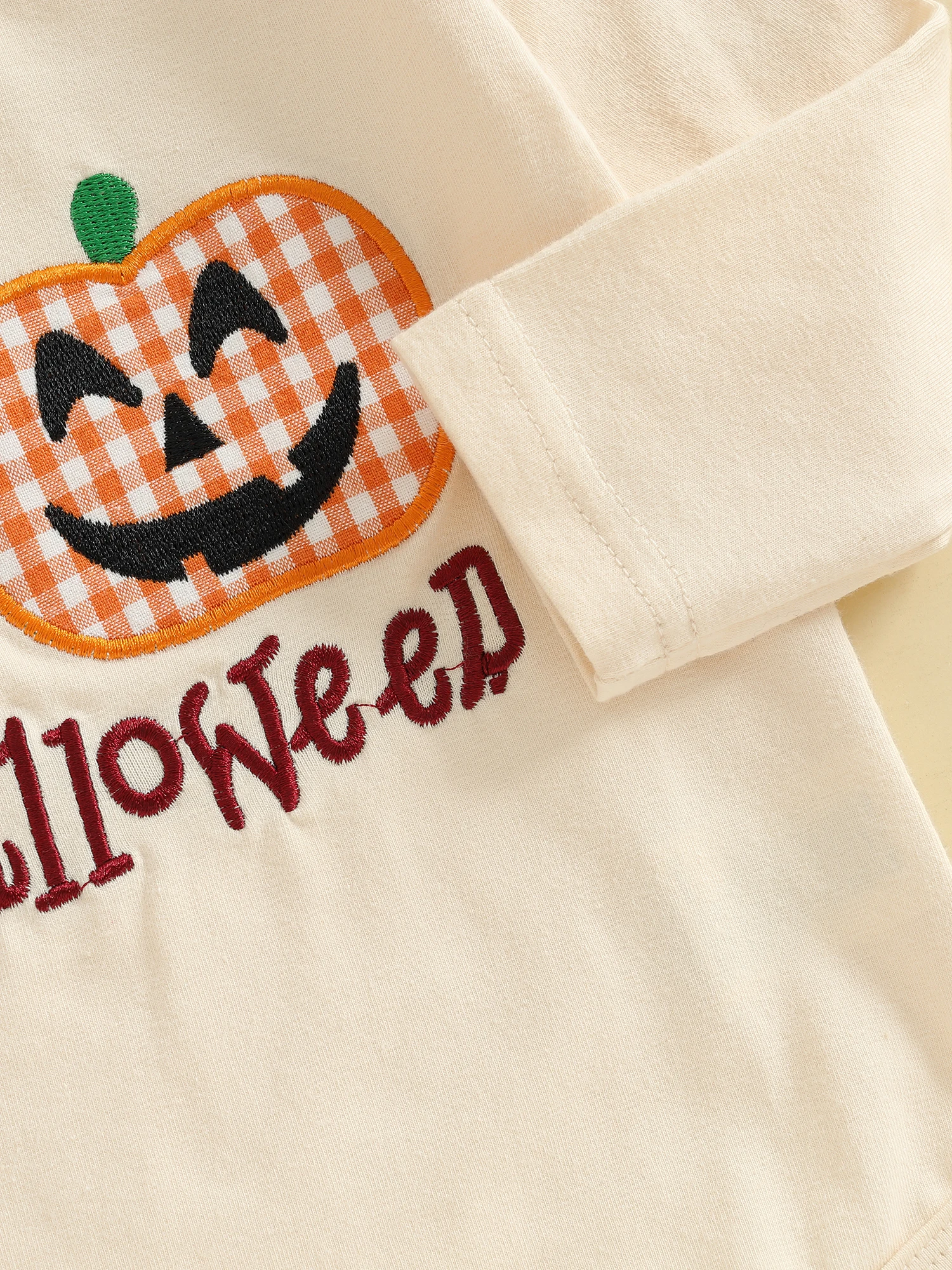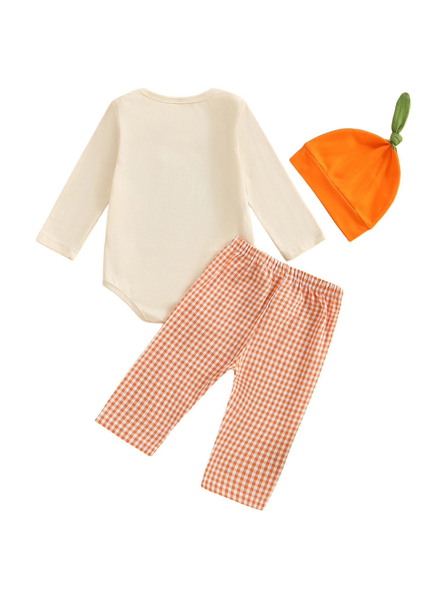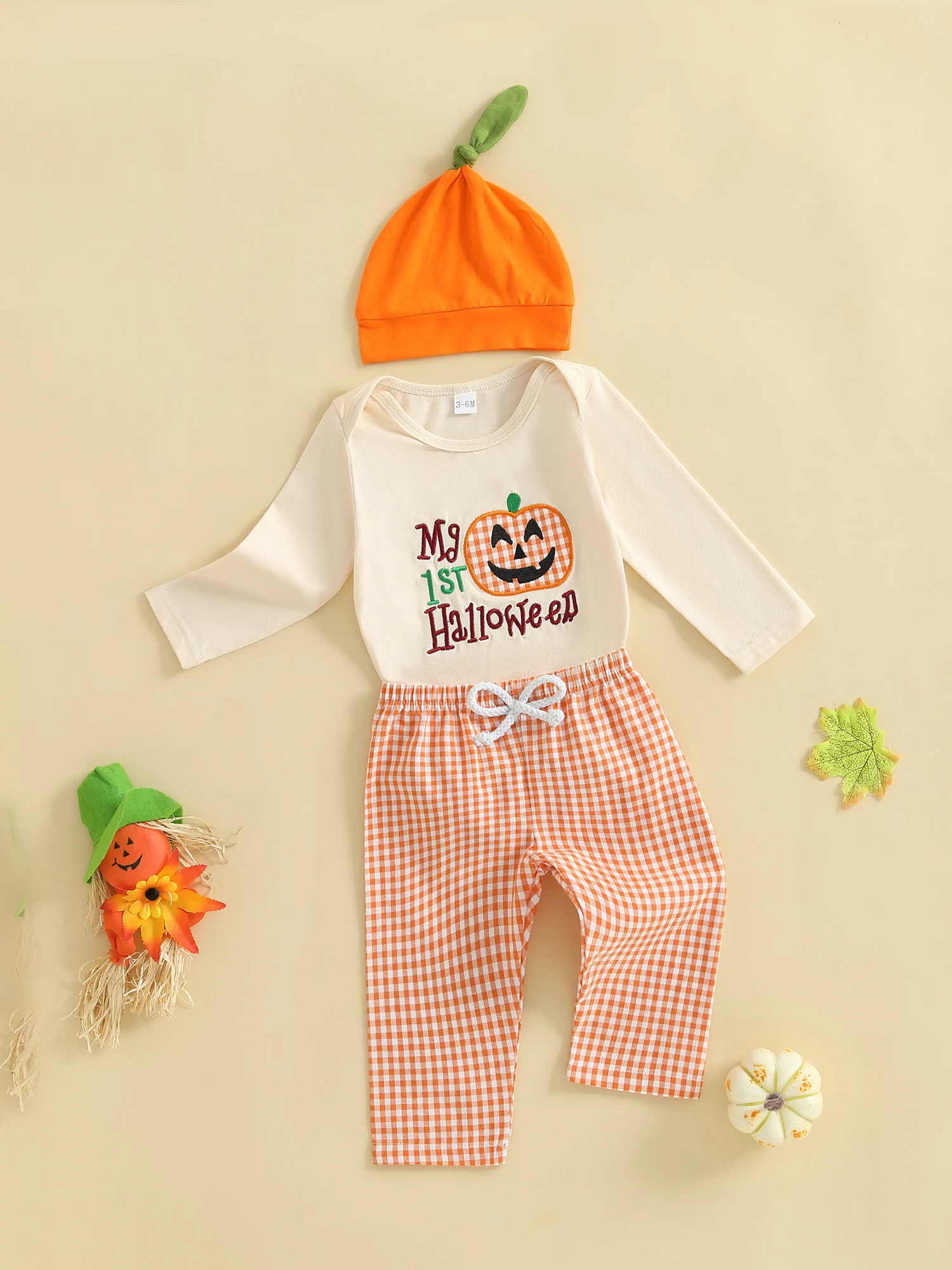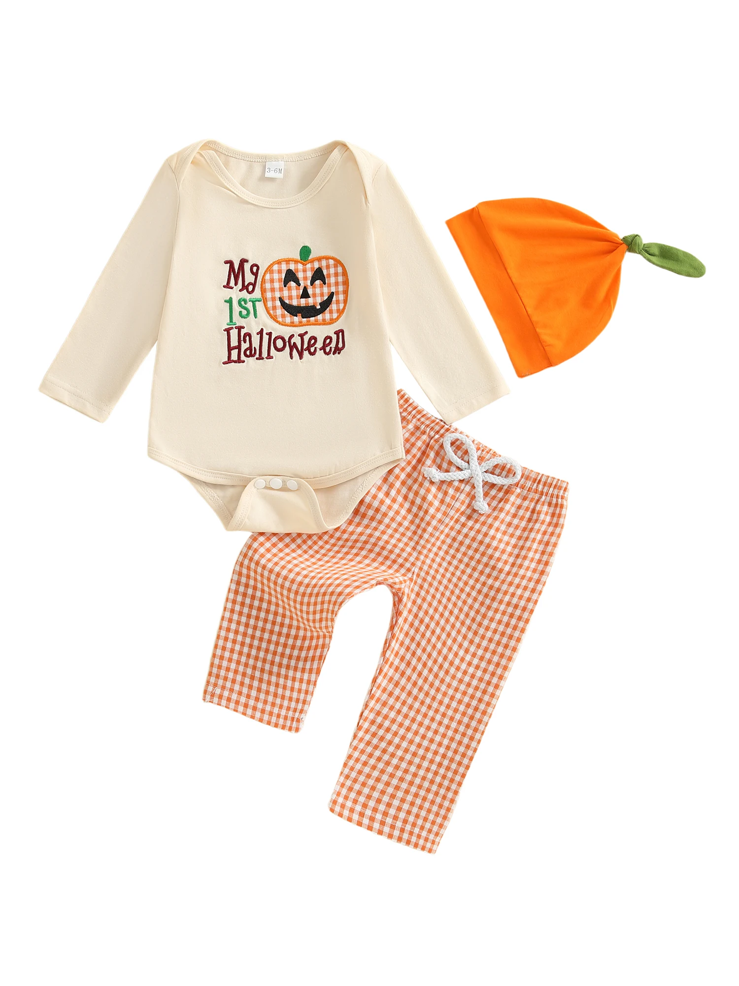 Comprar Ropa de Halloween para bebé de 0 a 18 meses, pelele de manga larga con bordado de calabaza y letras, pantalones a cuadros y sombrero, traje de otoño de 3 uds.