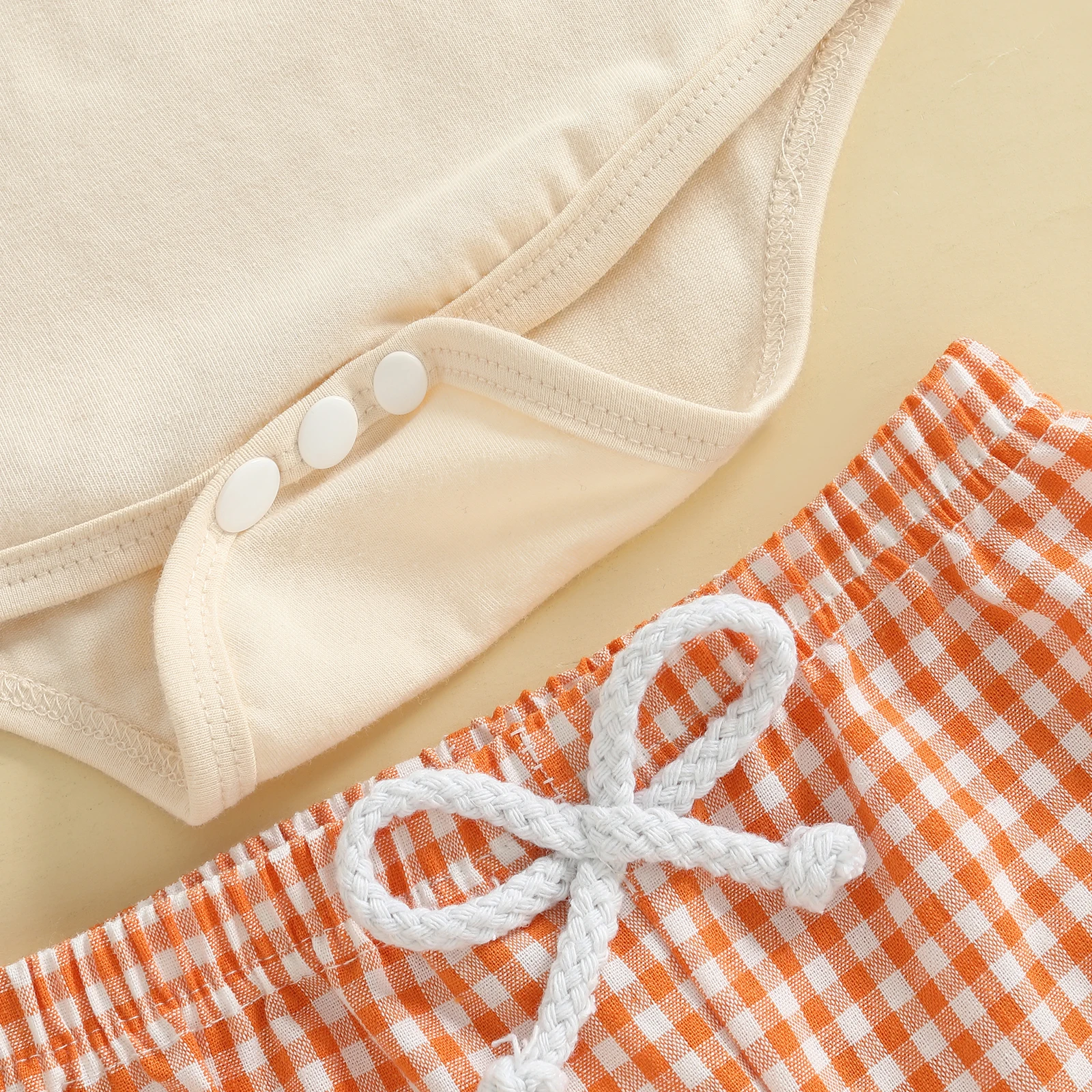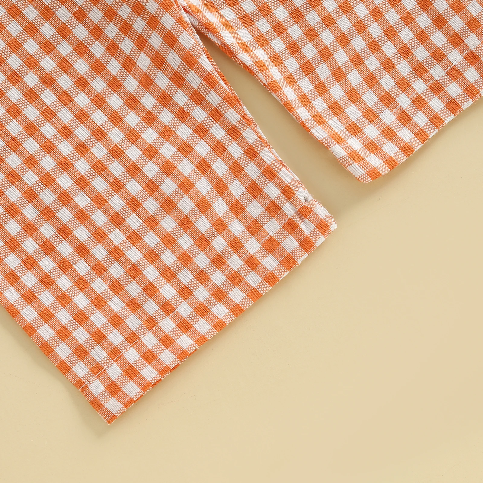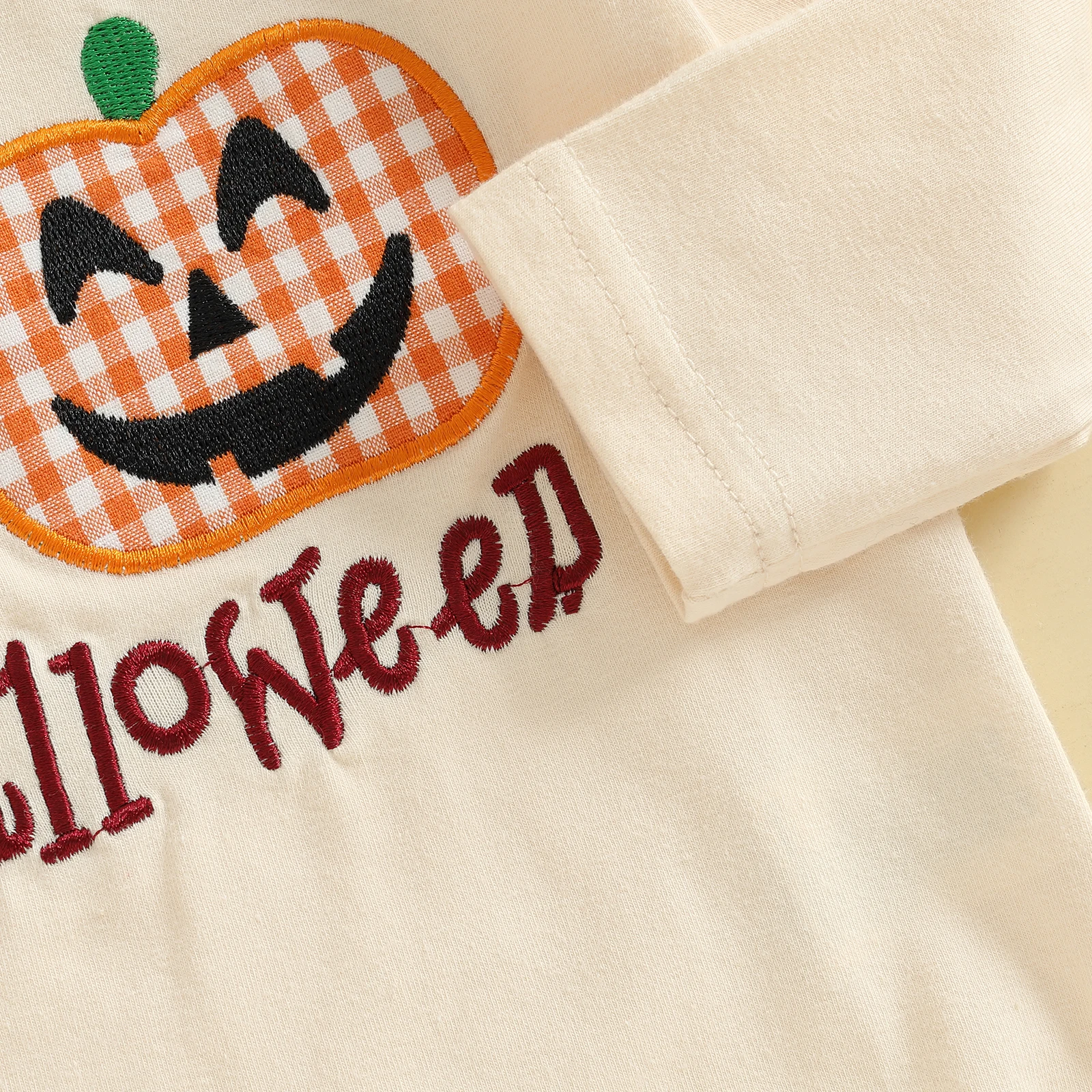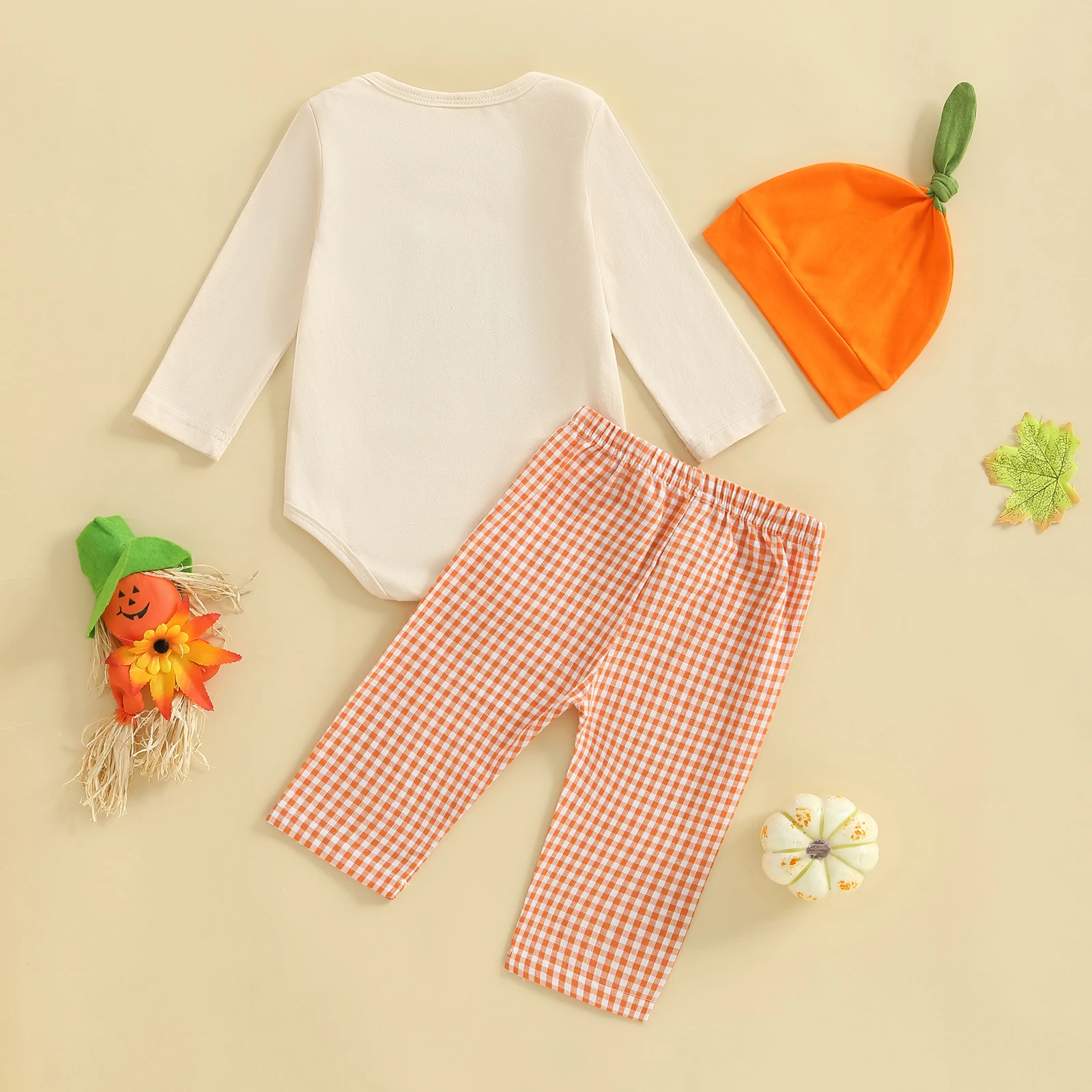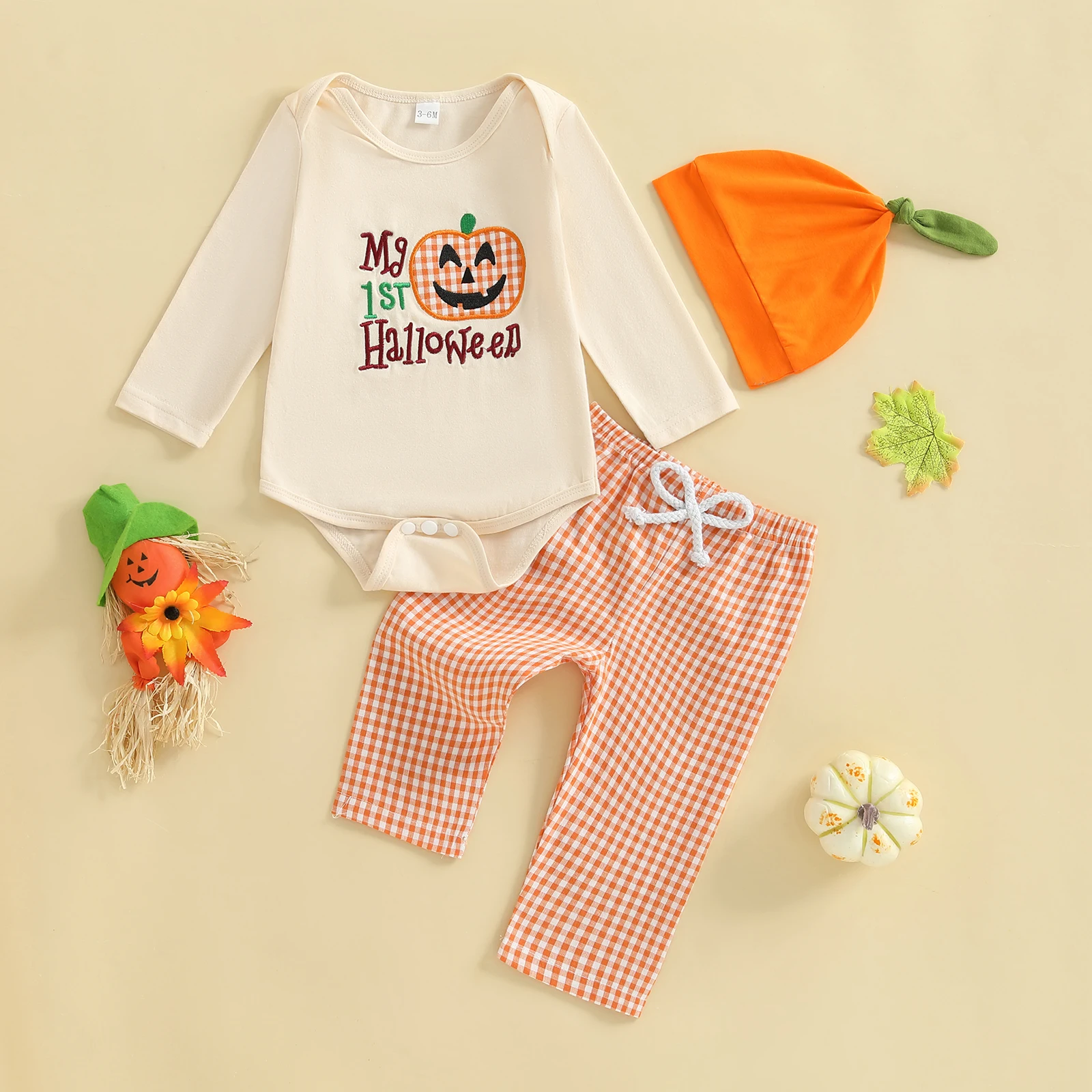 Comprar Ropa de Halloween para bebé de 0 a 18 meses, pelele de manga larga con bordado de calabaza y letras, pantalones a cuadros y sombrero, traje de otoño de 3 uds.