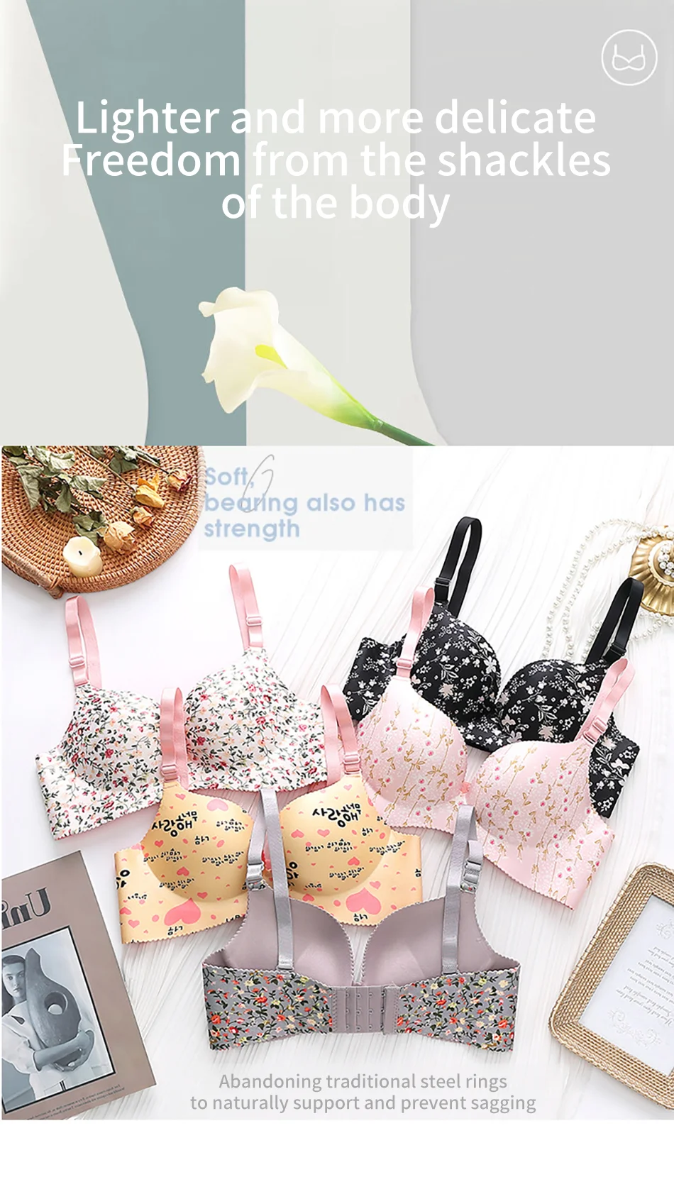 igual que la foto al ponérselo una sensación de comodidad extrema no lleva aros cosa que les agradece no se clava por ningún lado las copas son suaves no aprietan totalmente 100% calidad y recomendable