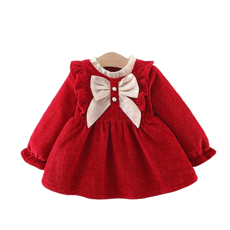 Ropa de invierno para niña pequeña, traje de lana de malla con lazo lindo coreano, vestidos de cumpleaños rojos de manga larga, vestido de lujo de princesa para recién nacido, BC847