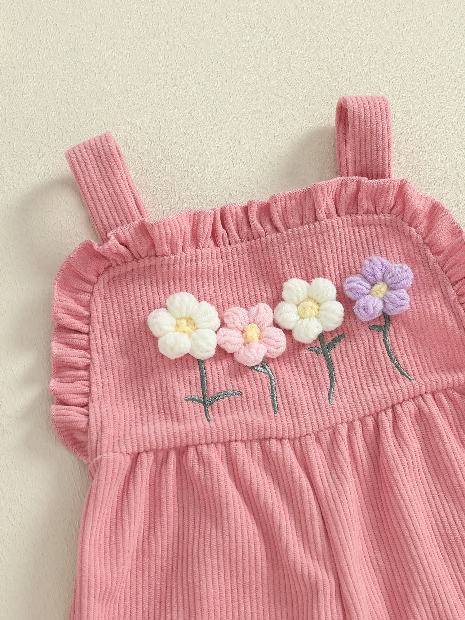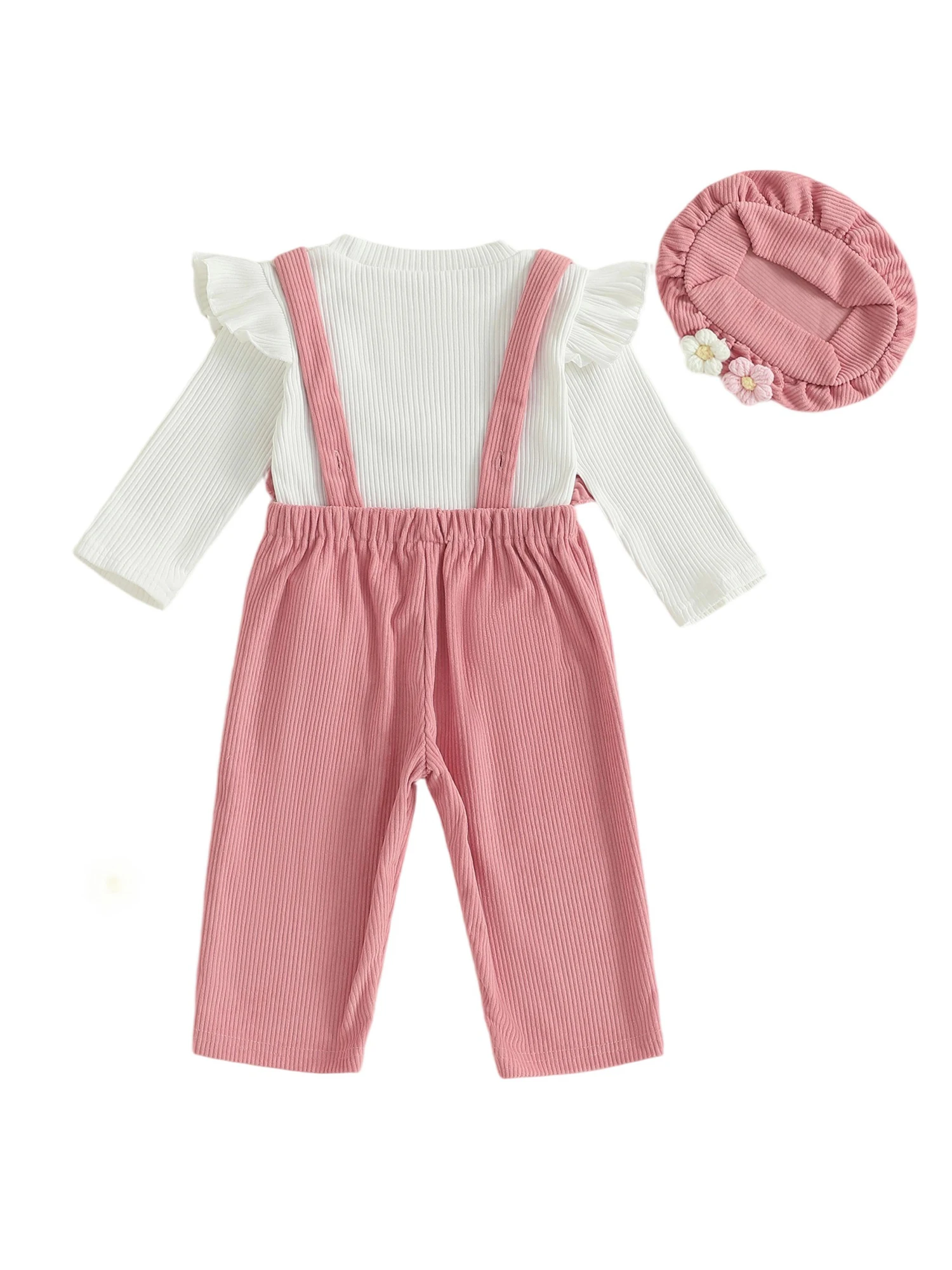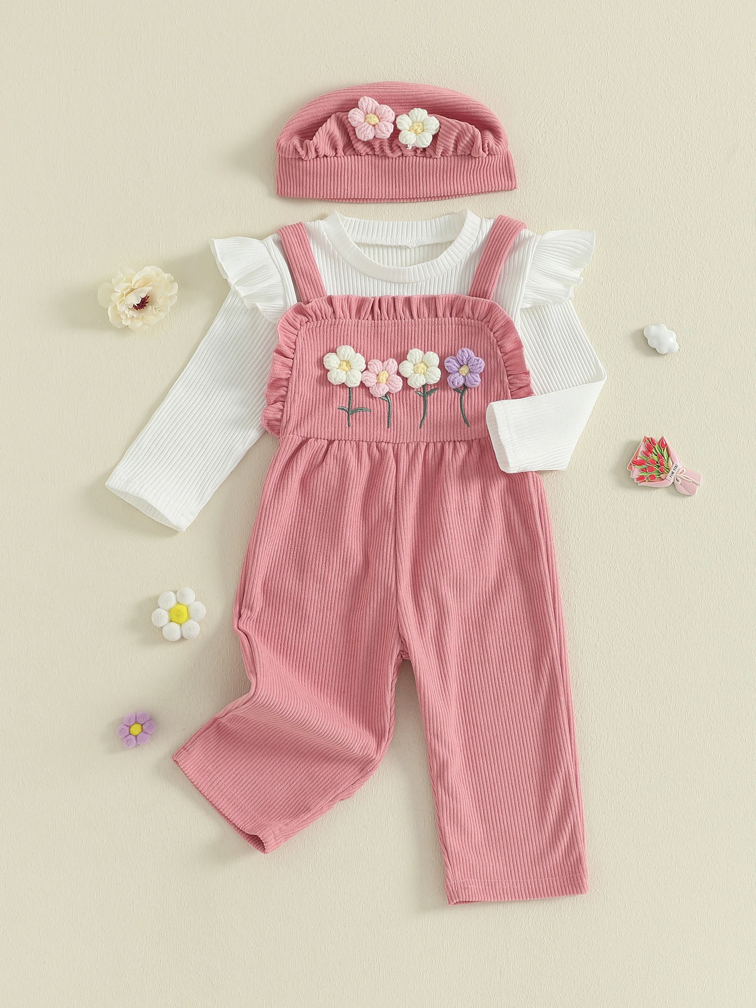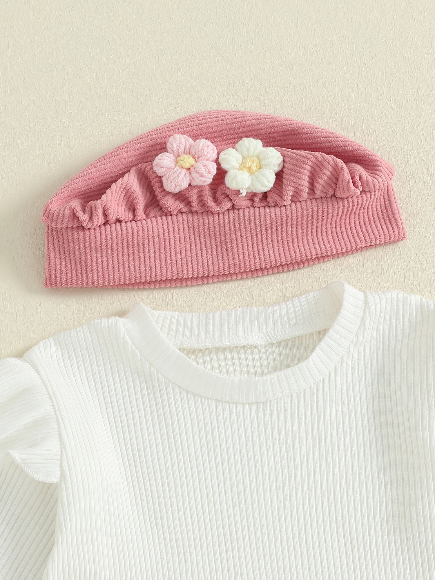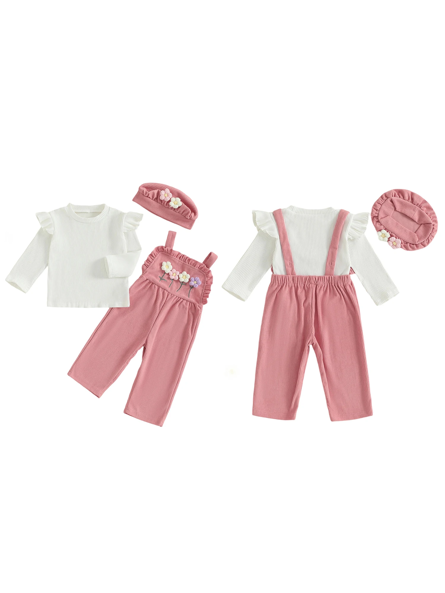 Conjunto para niñas, camiseta de manga larga con cuello redondo y mono de flores y sombrero de otoño