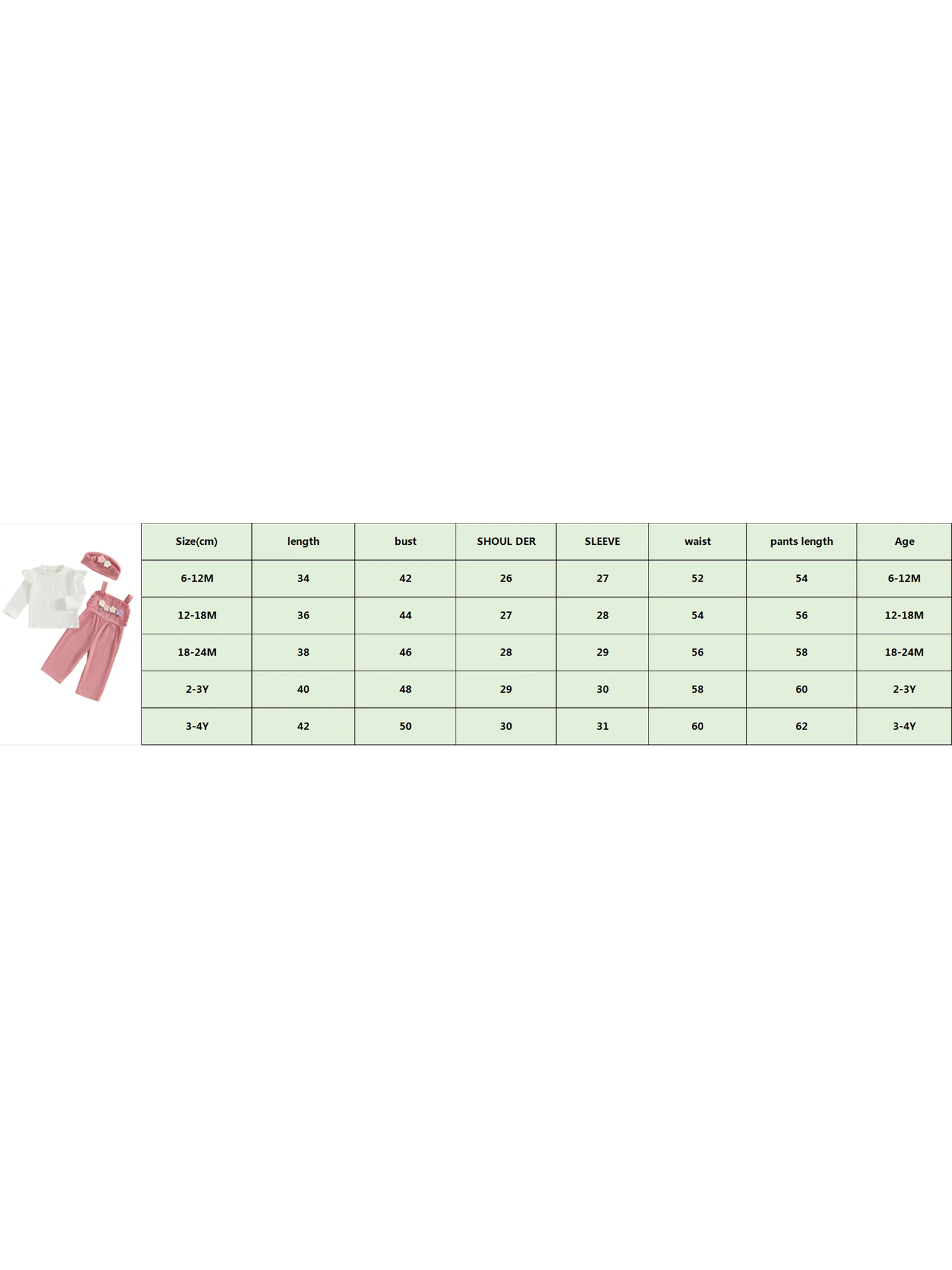Tabla de tallas Tamaño (cm) 6-12M Longitud de la camiseta: 34 Busto: 42 Manga: 27 Hombro: 26 Cintura: 52 Longitud de los pantalones: 54 Edad sugerida: 6-12 meses 12-18M Longitud de la camiseta: 36 Busto: 44 Manga: 28 Hombro: 27 Cintura: 54 Longitud de los pantalones: 56 Edad sugerida: 12-18 meses 18-24M Longitud de la camiseta: 38 Busto: 46 Manga: 29 Hombro: 28 Cintura: 56 Longitud de los pantalones: 58 Edad sugerida: 18-24 meses 2-3Y Longitud de la camiseta: 40 Busto: 48 Manga: 30 Hombro: 29 Cintura: 58 Longitud de los pantalones: 60 Edad sugerida: 2-3 años 3-4Y Longitud de la camiseta: 42 Busto: 50 Manga: 31 Hombro: 30 Cintura: 60 Longitud de los pantalones: 62 Edad sugerida: 3-4 años