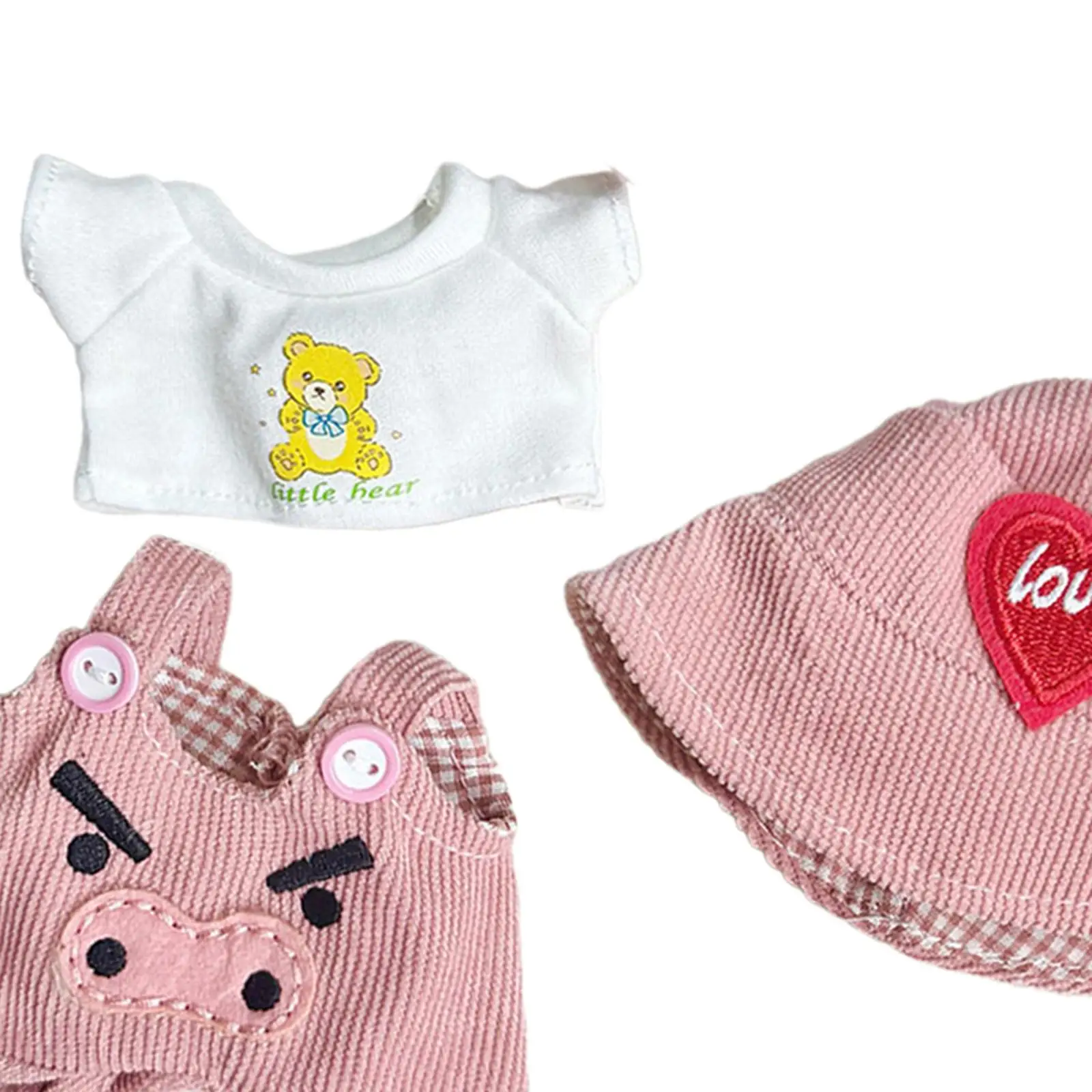 Comprar Ropa de muñeca para muñeca de peluche de 15cm, conjunto de pantalones de muñeca, sombrero con patrón de corazón elegante, accesorios de animales de peluche suaves DIY, dibujos animados (rosa)