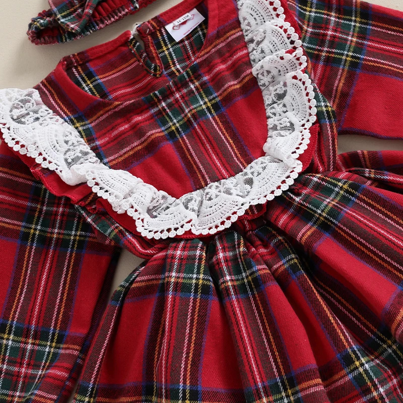 Peleles para niñas, vestido, ropa de Navidad, encaje a cuadros, cuello redondo, manga larga, monos para niños pequeños con diadema