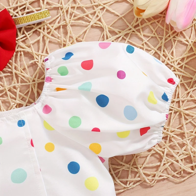 Comprar Ropa Para niña con manga abullonada, Tops de lunares arcoíris, pantalones cortos sólidos y Diadema para bebé, traje informal de estilo francés para exteriores, traje de viaje de princesa D2L