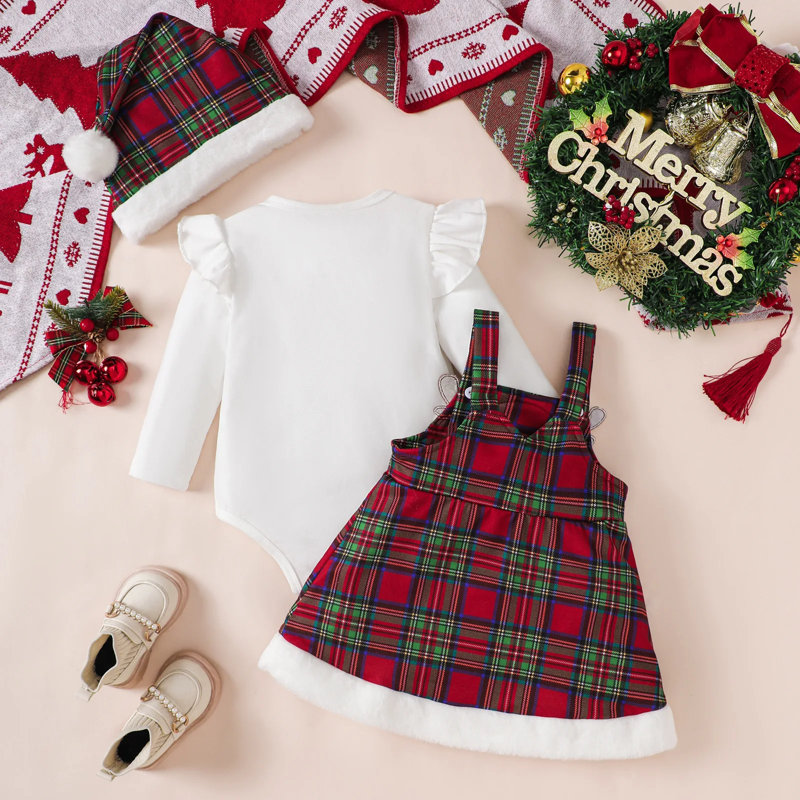 Comprar Ropa Para niña recién nacida de 0 a 24 meses, vestido de tirantes a cuadros de ciervo de dibujos animados de Navidad + Body de manga larga con sombrero de Papá Noel, regalo de Año Nuevo de 3 piezas