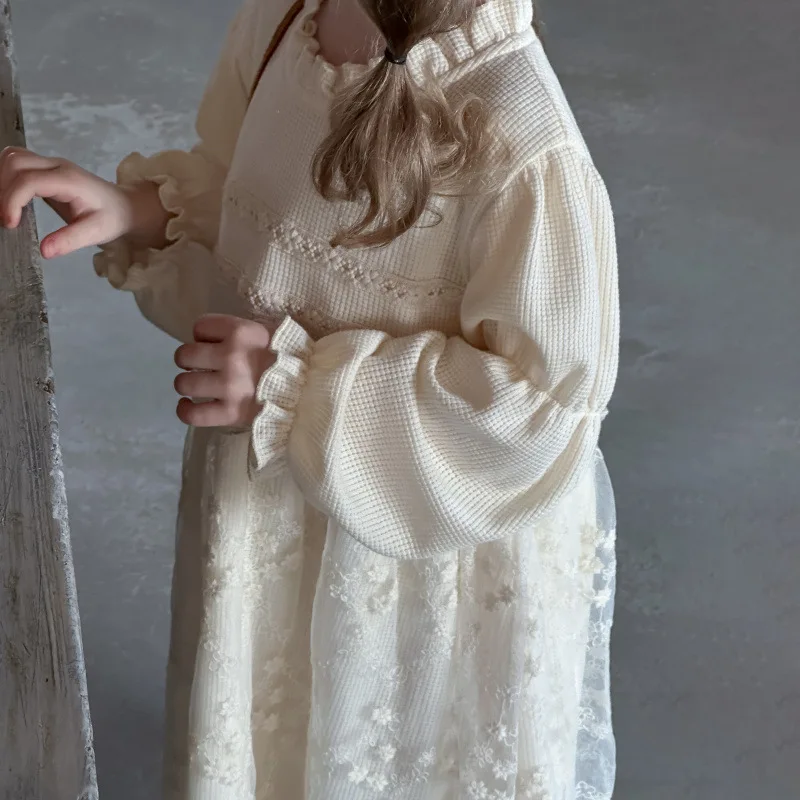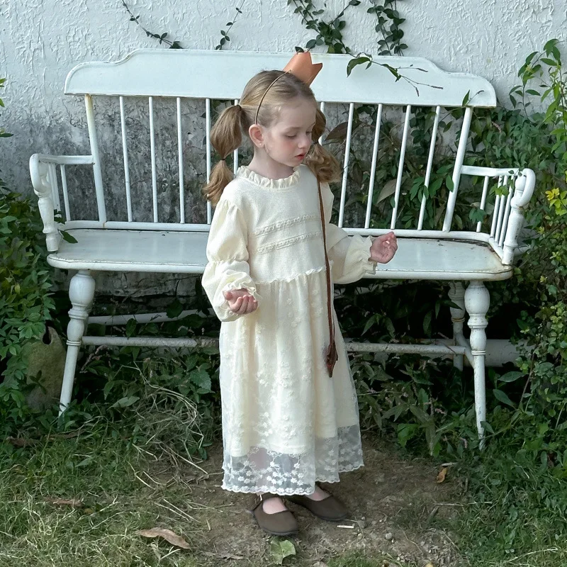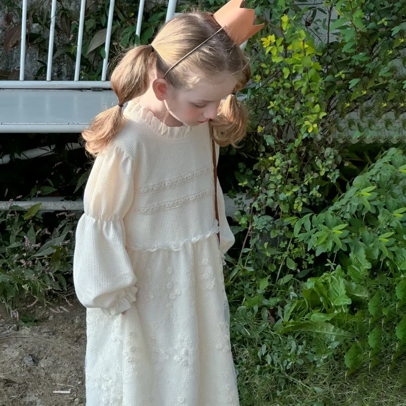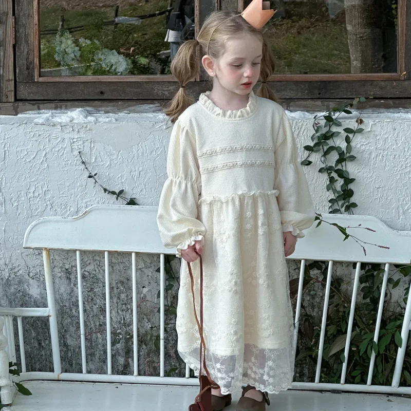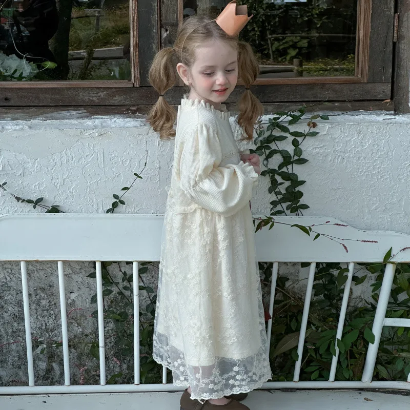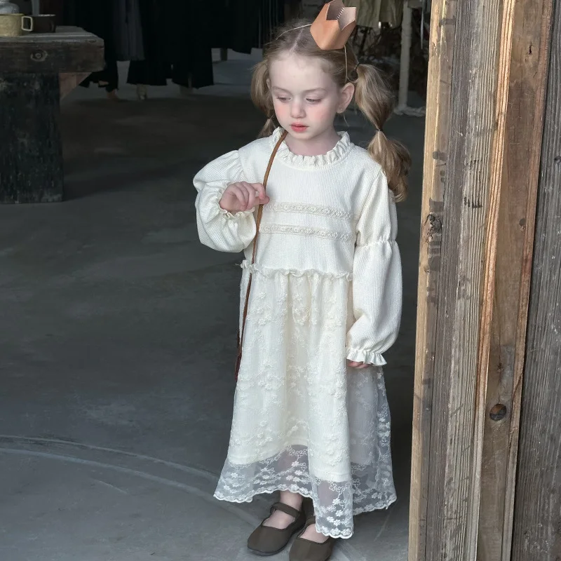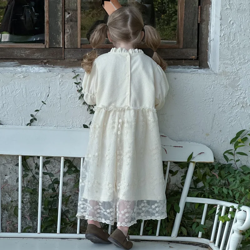 El vestido presenta un delicado diseño de encaje, añadiendo un toque de elegancia y feminidad al guardarropa de tu pequeña.