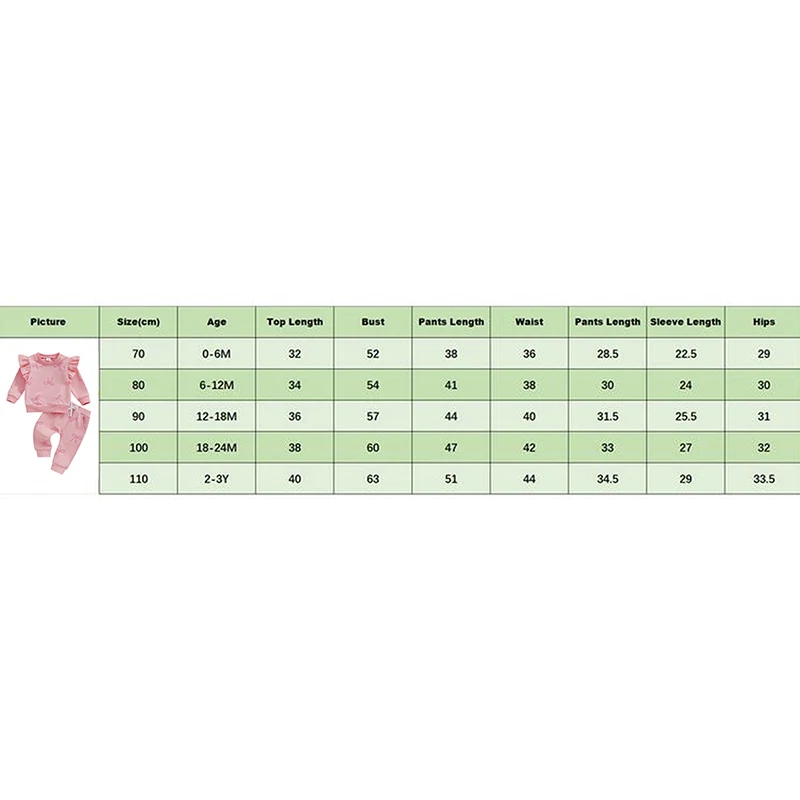 Conjunto de 2 piezas de otoño para niñas pequeñas, camisetas con estampado de lazo y cuello redondo, pantalones con cordónTamaño (cm)0-6M Longitud de la camiseta: 32 Busto: 52 Manga: 25,5 Hombro: 22 Longitud de pantalones: 38 Cintura: 36 Cadera: 58 Edad recomendada: 0-6 meses6-12M Longitud de la camiseta: 34 Busto: 54 Manga: 27 Hombro: 23 Longitud de los pantalones: 41 Cintura: 38 Cadera: 60 Edad recomendada: 6-12 meses12-18M Longitud de la camiseta: 36 Busto: 57 Manga: 28,5 Hombro: 24 Longitud de pantalones: 44 Cintura: 40 Cadera: 62 Edad recomendada: 12-18 meses18-24M Longitud de la camiseta: 38 Busto: 60 Manga: 30 Hombro: 25 Longitud de pantalones: 47 Cintura: 42 Cadera: 64 Edad recomendada: 18-24 meses2-3 años Longitud de la camiseta: 40 Busto: 63 Manga: 32 Hombro: 26 Longitud de pantalones: 51 Cintura: 44 Cadera: 67 Edad recomendada: 2-3 añosTamaño (pulgadas)0-6M Longitud de la camiseta: 12,6 Busto: 20.47 Manga: 104,04 Hombro: 8,66 Longitud de los pantalones: 14,96 Cintura: 14,17 Cadera: 22,83 Edad recomendada: 0-6 meses6-12M Longitud de la camiseta: 13,39 Busto: 21,26 Manga: 10,63 Hombro: 9,06 Largo de pantalones: 16,14 Cintura: 14,96 Cadera: 23,62 Edad recomendada: 6-12 meses12-18M Longitud de la camiseta: 14,17 Busto: 22,44 Manga: 11.22 Hombro: 9,45 Longitud de los pantalones: 17,32 Cintura: 15,75 Cadera: 24,41 Edad recomendada: 12-18 meses18-24M Longitud de la camiseta: 14,96 Busto: 23,62 Manga: 11.81 Hombro: 9,84 Longitud de los pantalones: 18,5 Cintura: 16,54 Cadera: 25,2 Edad recomendada: 18-24 meses2-3 años Longitud de la camiseta: 15,75 Busto: 24,8 Manga: 12,6 Hombro: 10.24 Longitud de los pantalones: 20,08 Cintura: 17,32 Cadera: 26,38 Edad recomendada: 2-3 añosEspecificación:Material: 70% algodón, 30% poliésterLongitud de la manga: largaTipo de patrón: ArcoGénero: NiñaTipo de artículo: conjuntosPaquete incluido:1 camiseta + 1 pantalón.Consejos amigables:1.Por favor permita una diferencia del 2-3% según la medición manual.2.Consulte cuidadosamente la tabla de medidas antes de comprar el artículo.(1 pulgada=2,54 cm)3.Tenga en cuenta que debe aceptarse una ligera diferencia de color debido a la luz y la pantalla.Gracias.Promesa:Si el producto tiene algún problema de calidad, háganoslo saber, lo ayudaremos a resolver el problema lo más rápido posible.
