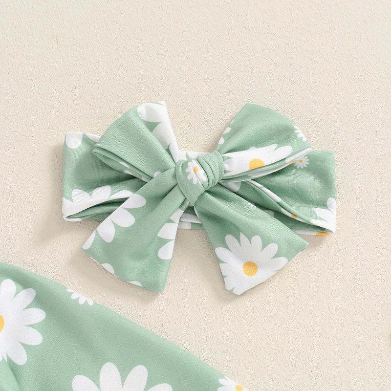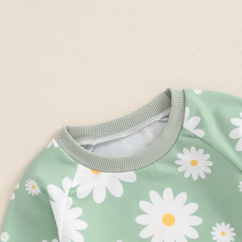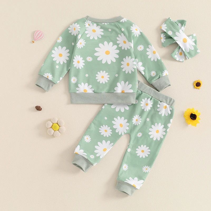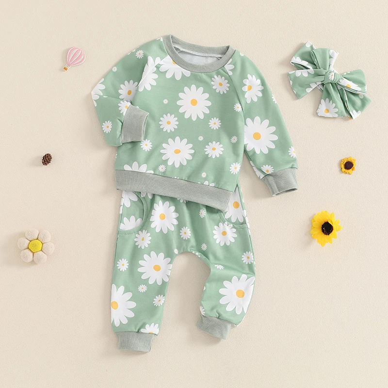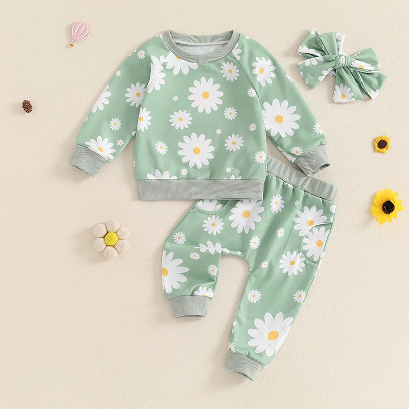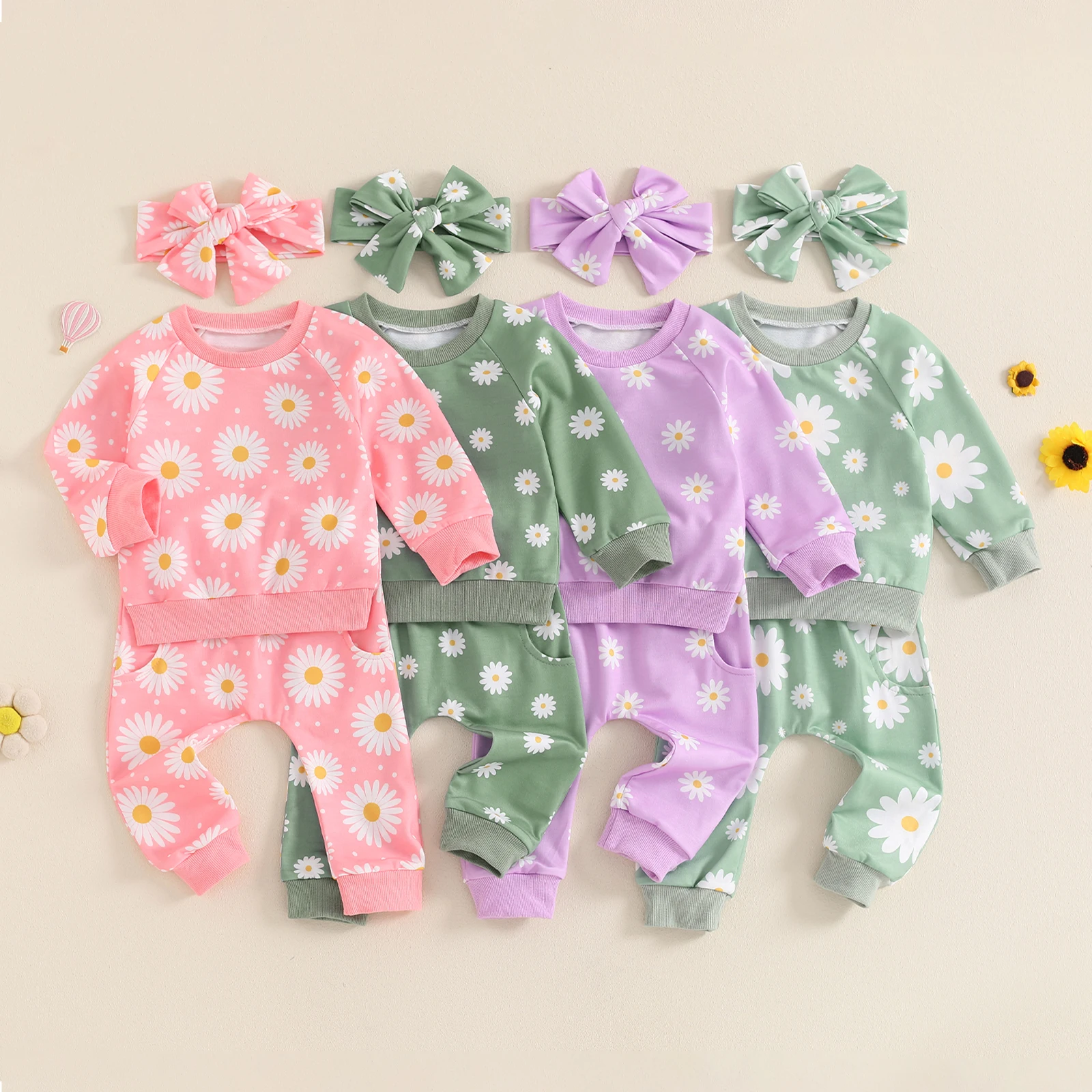 Comprar Ropa para niñas pequeñas de 0 a 3 años, Sudadera de cuello redondo de manga larga con estampado de flores, pantalones de chándal, diadema, traje de otoño