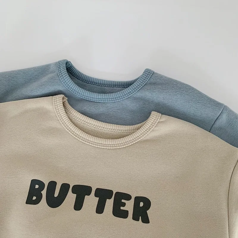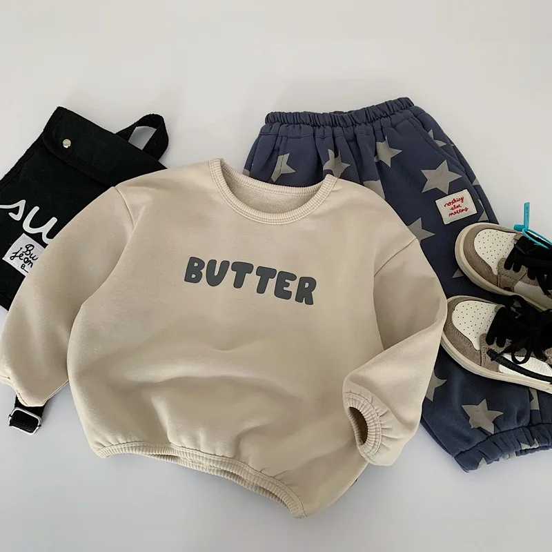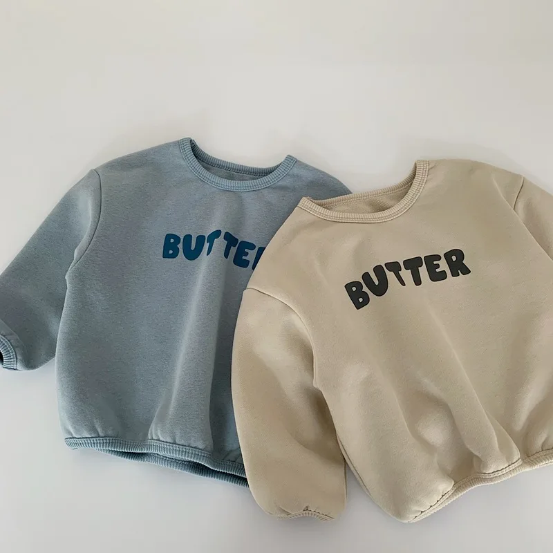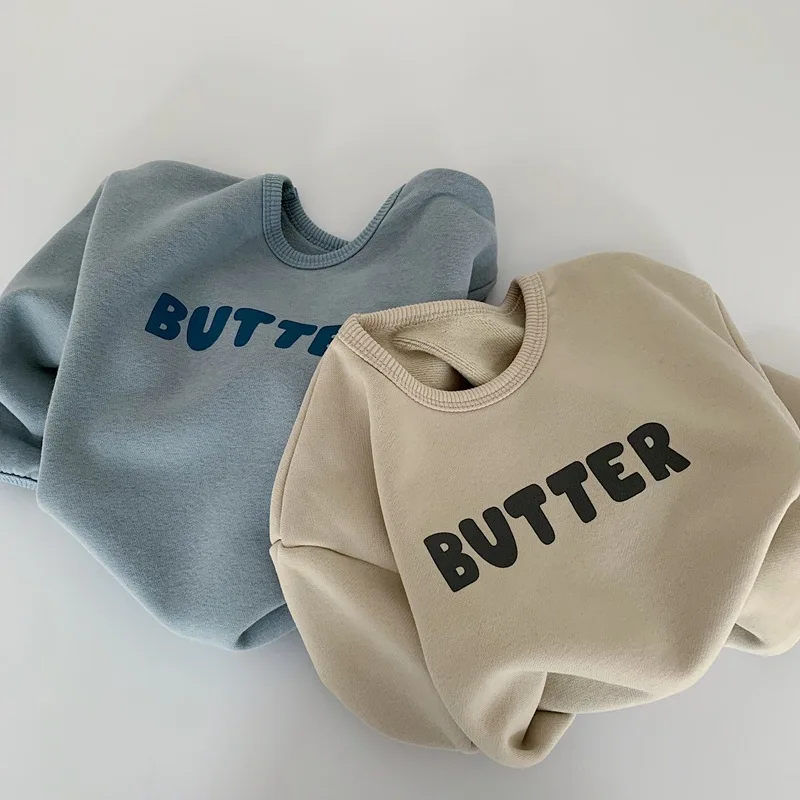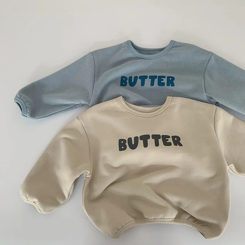 Presenta un moderno; BUTTER; estampado de letras con un toque vintage, adecuado tanto para niños como para niñas.