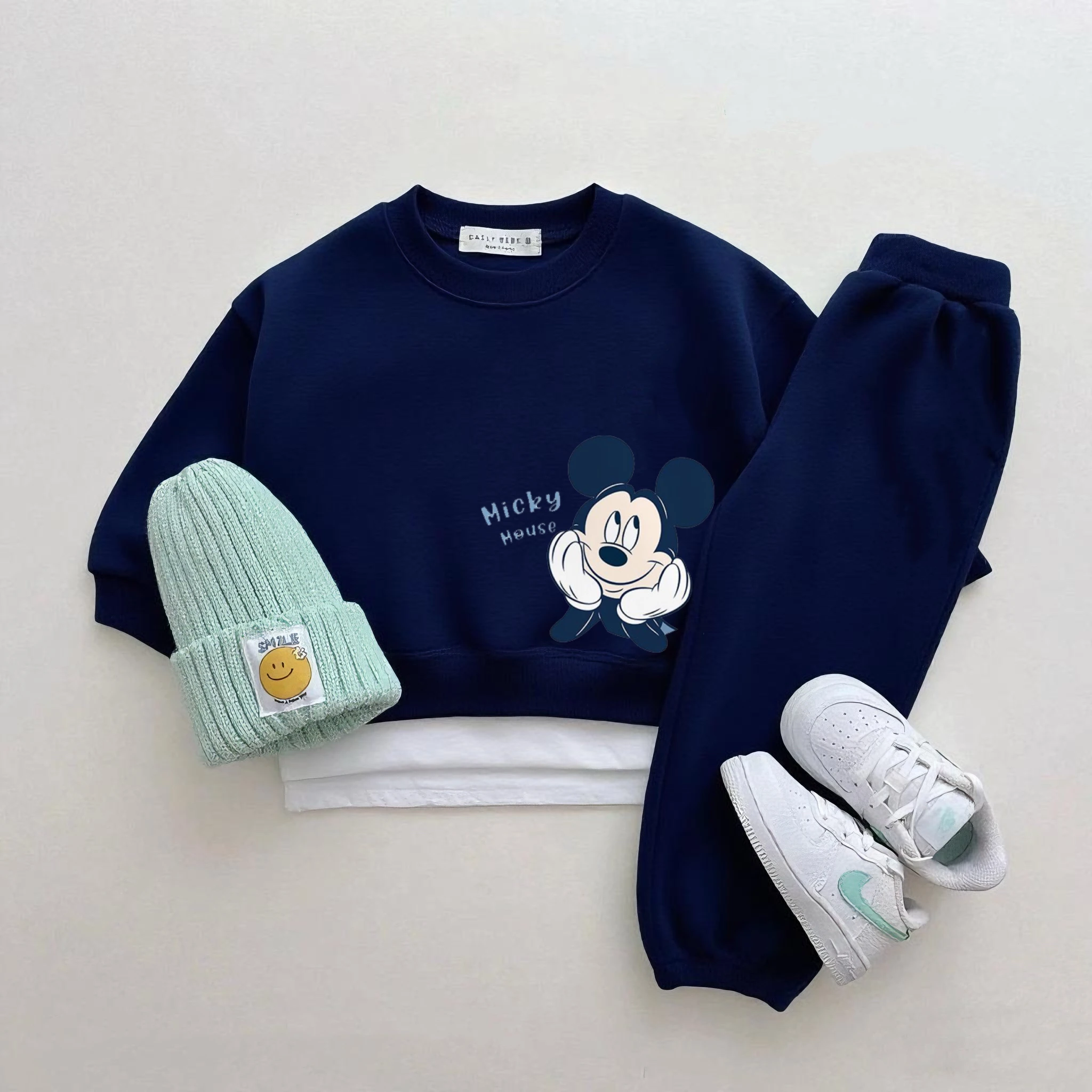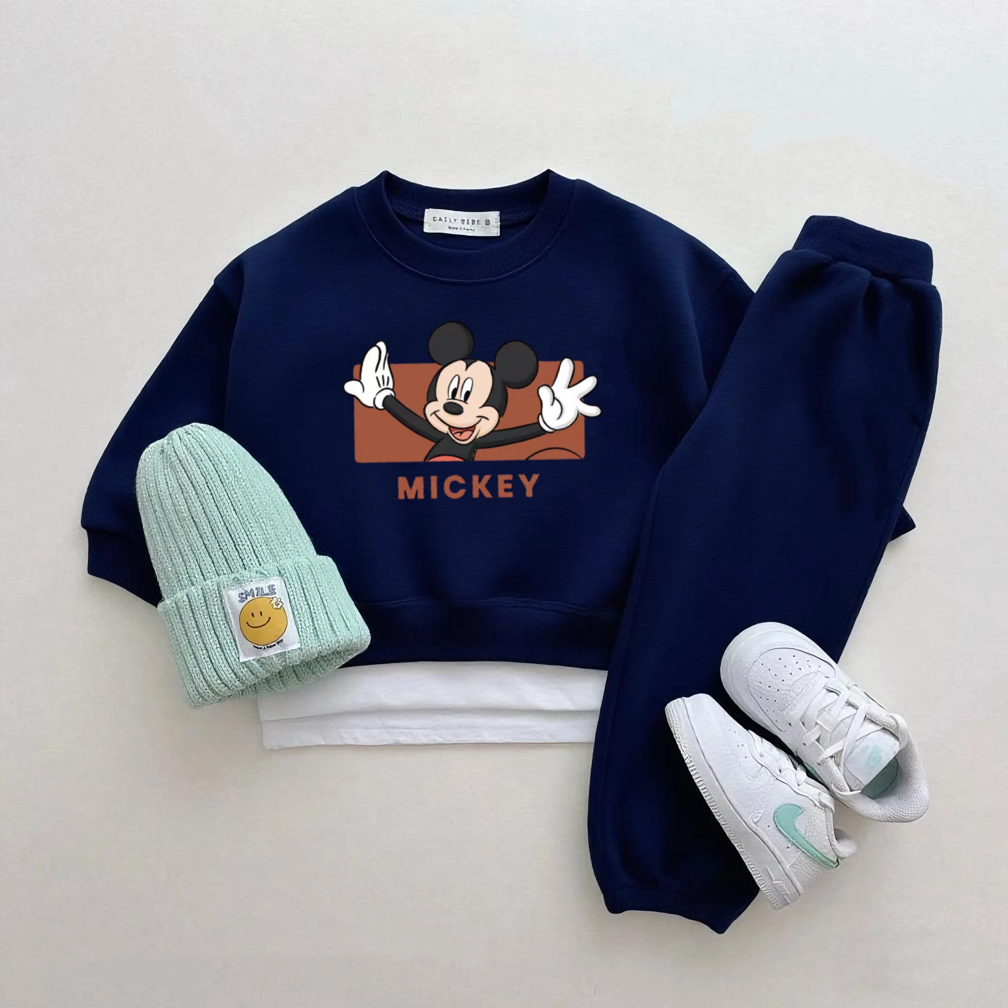 Comprar Ropa para niños, sudaderas de Mickey, pantalones sueltos, disfraz Popular de dos piezas, Tops con cuello redondo y estampado de dibujos animados, trajes con pantalones que combinan con todo