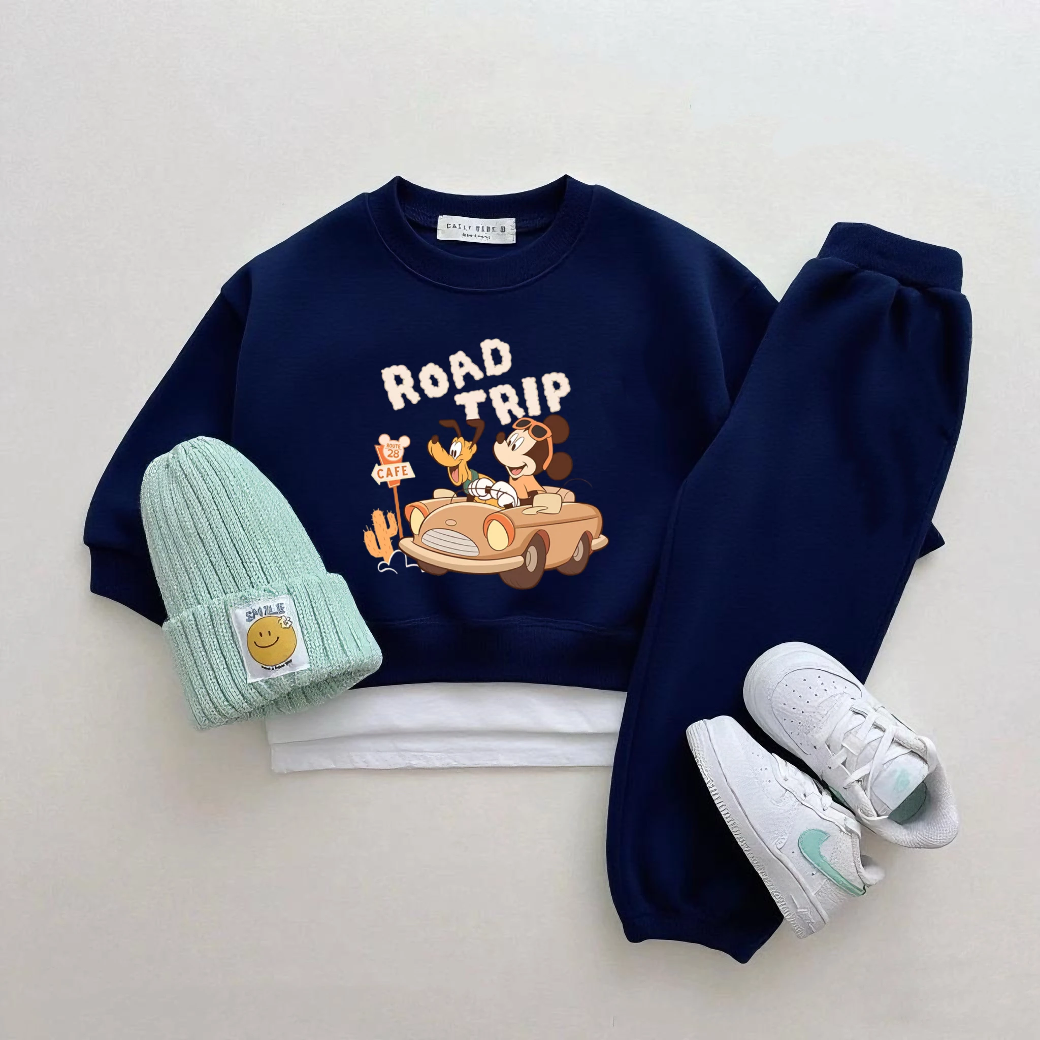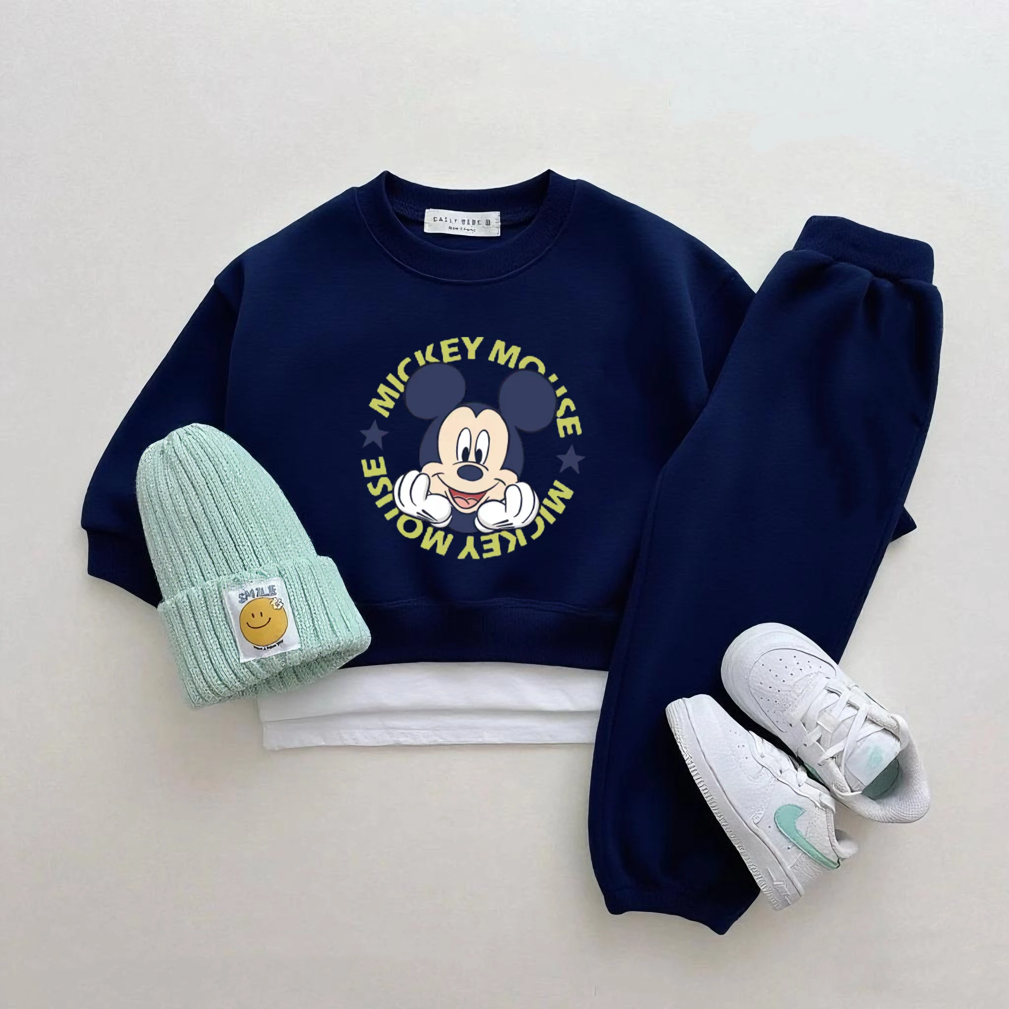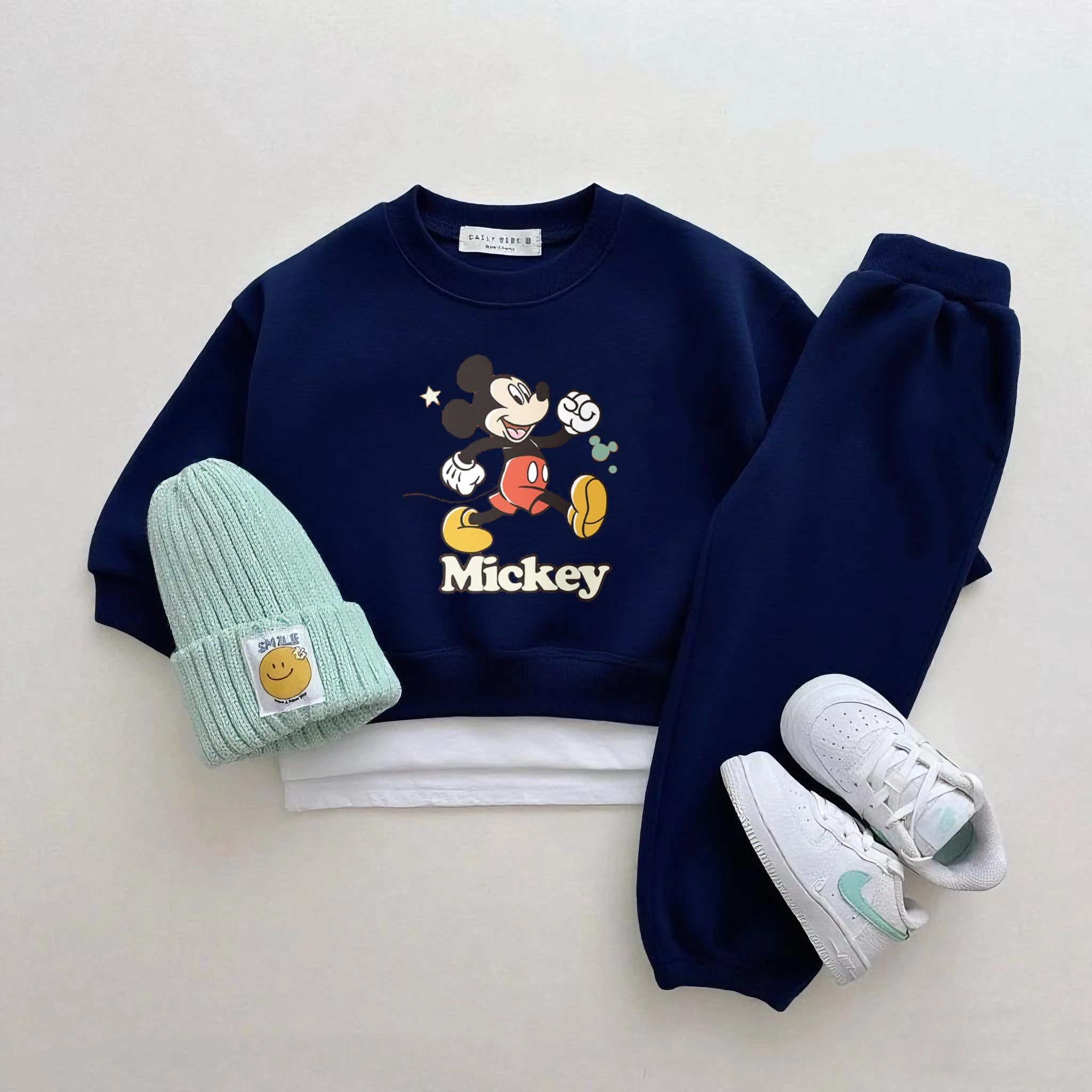 Comprar Ropa para niños, sudaderas de Mickey, pantalones sueltos, disfraz Popular de dos piezas, Tops con cuello redondo y estampado de dibujos animados, trajes con pantalones que combinan con todo
