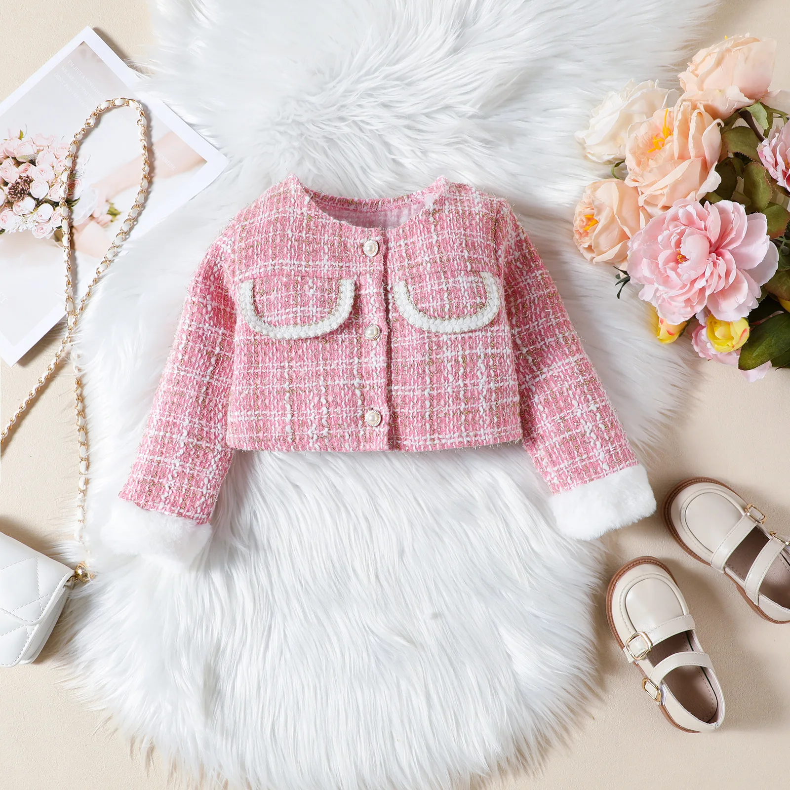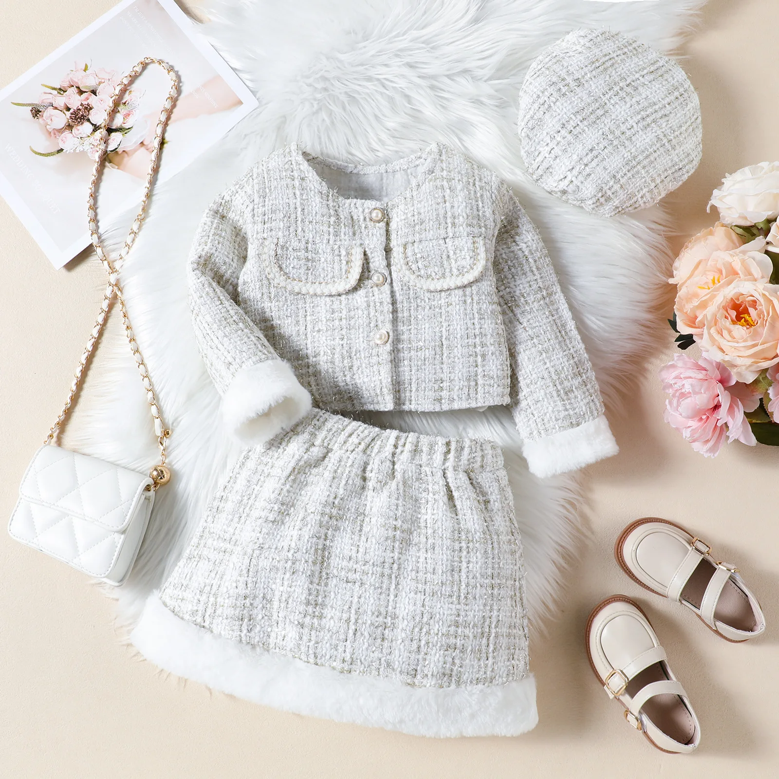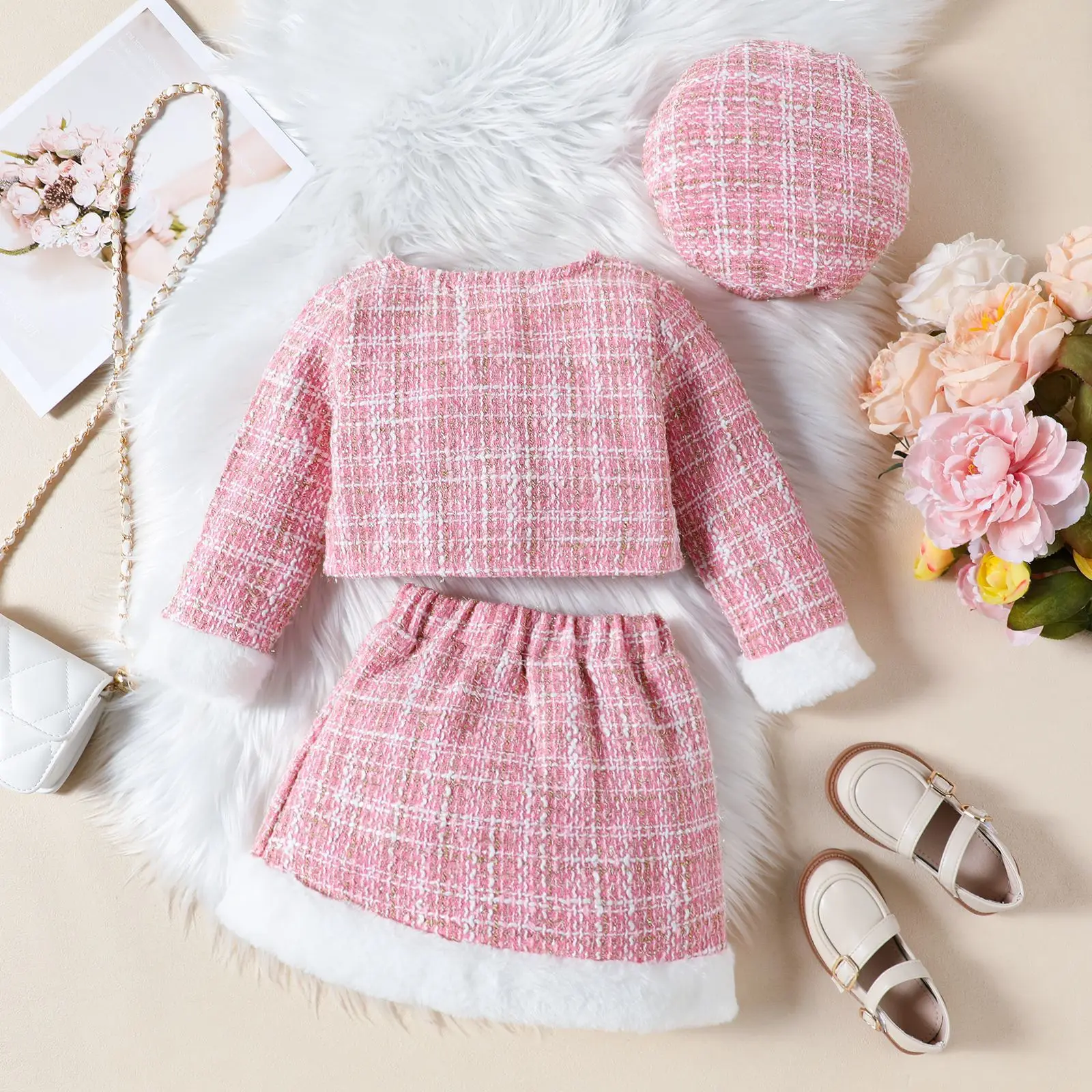 Ropa de Otoño Invierno para niño niña, moda coreana, Tweed a cuadros negros, abrigo de manga larga para bebé, falda y sombrero, conjuntos para niños BC106, 3 piezas