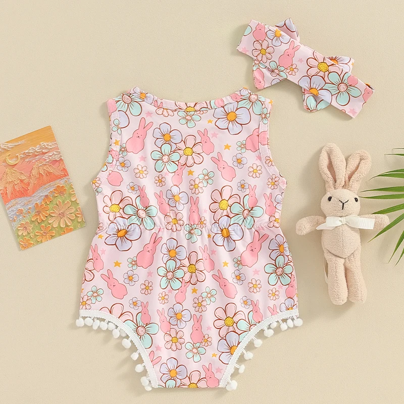 Mamelucos para niñas con estampado de conejo y flores, sin mangas, borlas, monos infantiles, ropa de Pascua de verano, monos