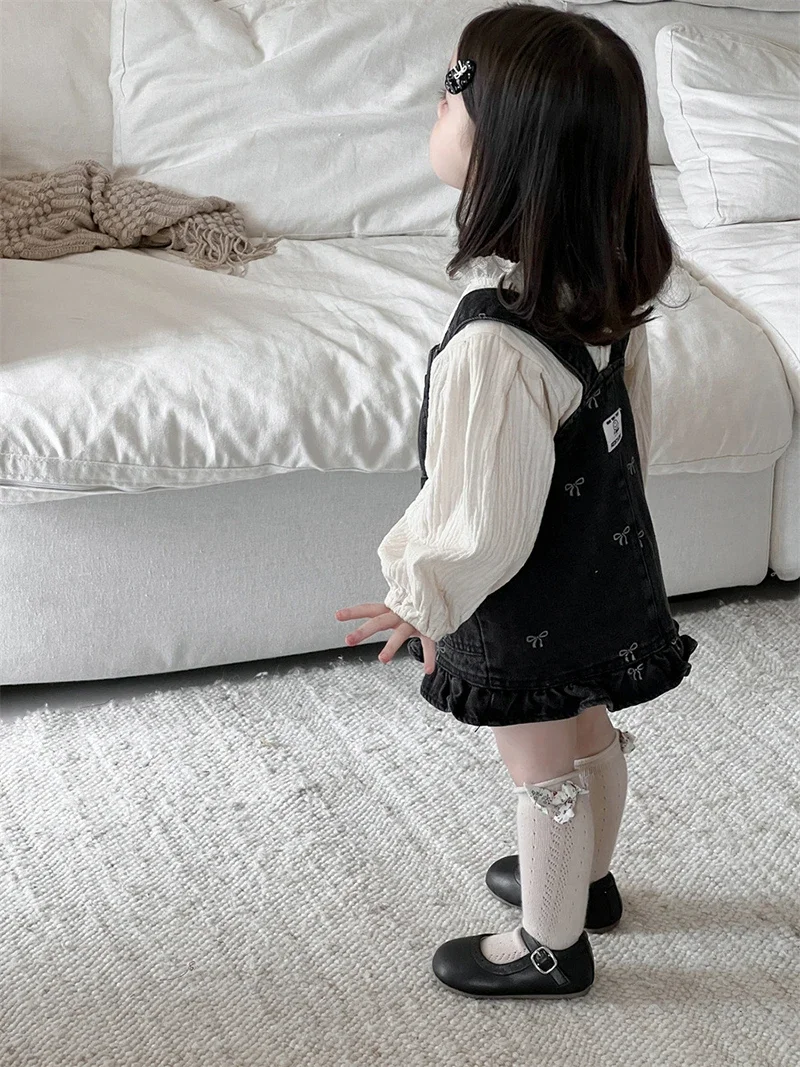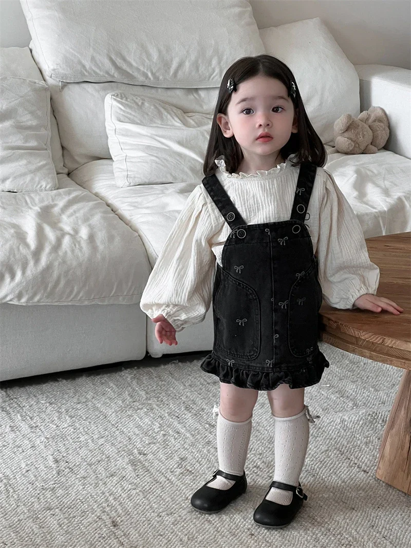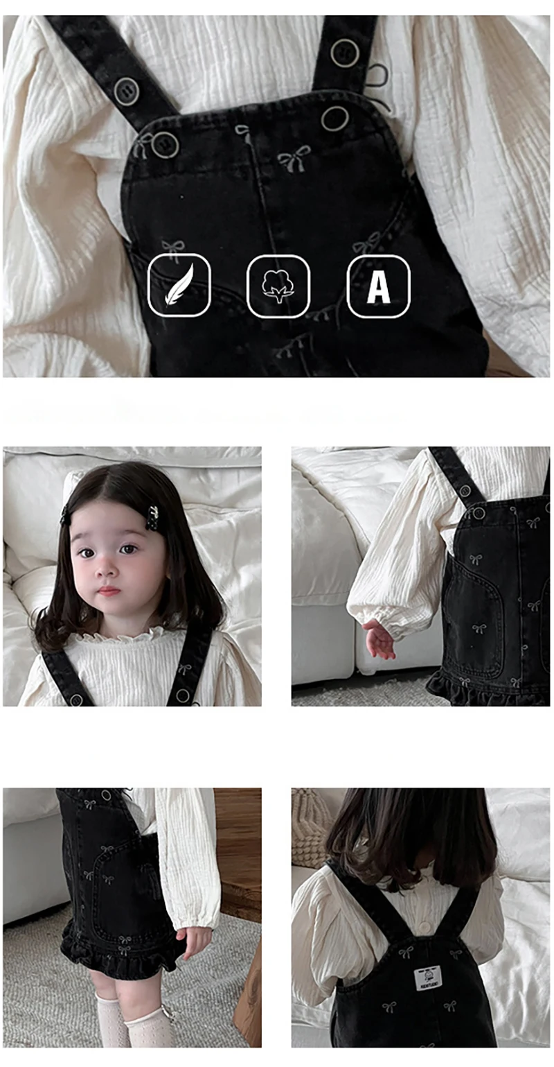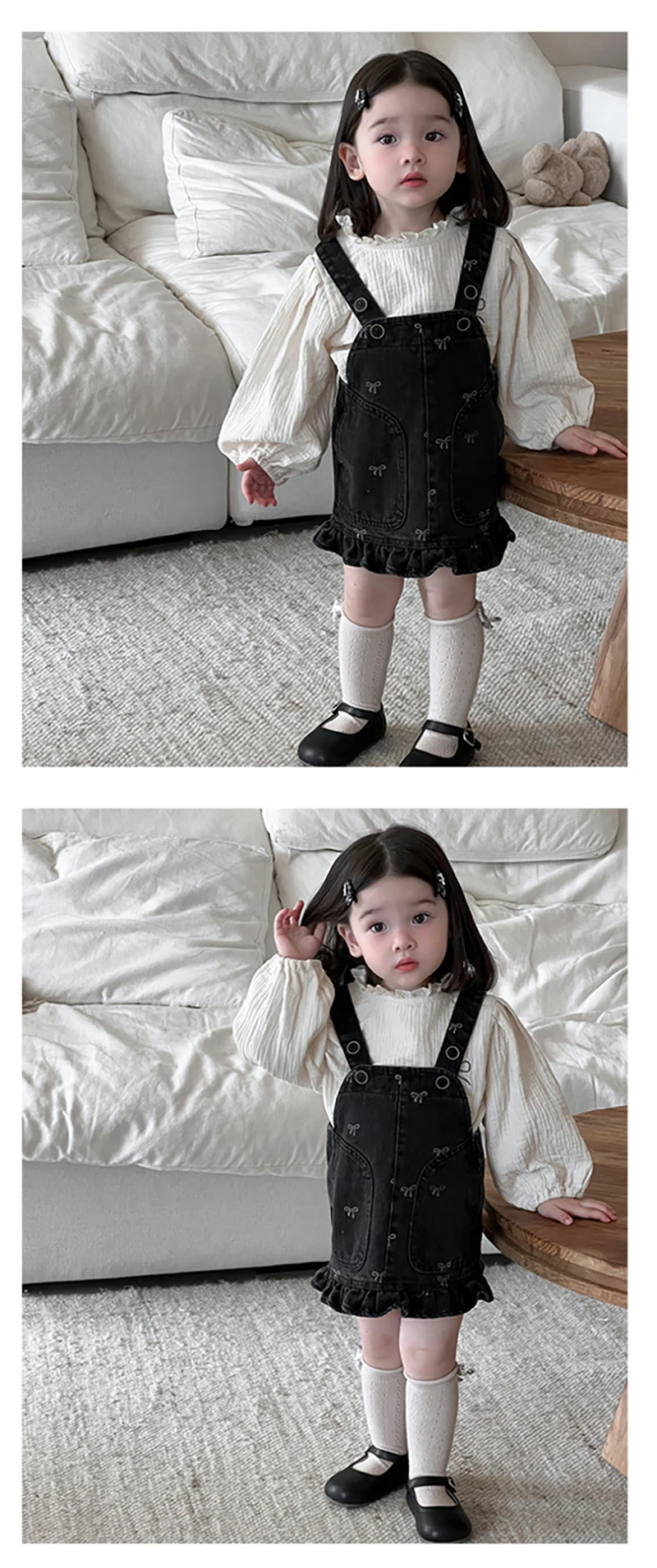 1.Diseño elegante de estilo coreano: este conjunto de ropa de primavera para niños presenta un diseño moderno de estilo coreano.La blusa estilo muñeca con mangas farol y cuello con volantes irradia un encanto dulce e inocente, mientras que la falda vaquera con bordado de lazo añade un toque de ternura y moda.