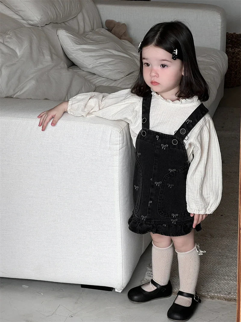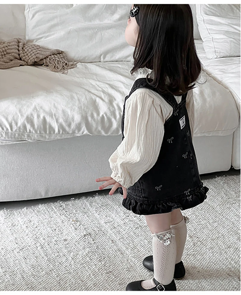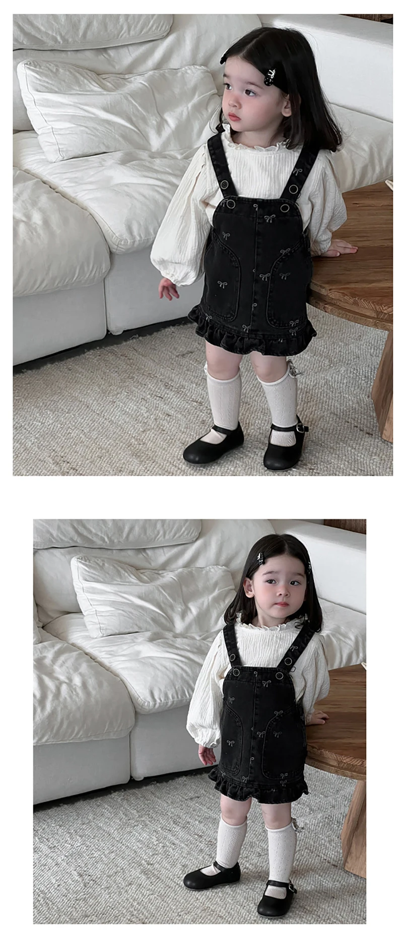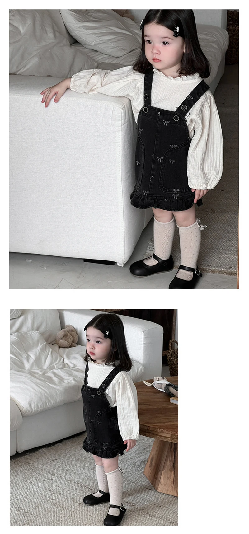 1.Diseño elegante de estilo coreano: este conjunto de ropa de primavera para niños presenta un diseño moderno de estilo coreano.La blusa estilo muñeca con mangas farol y cuello con volantes irradia un encanto dulce e inocente, mientras que la falda vaquera con bordado de lazo añade un toque de ternura y moda.