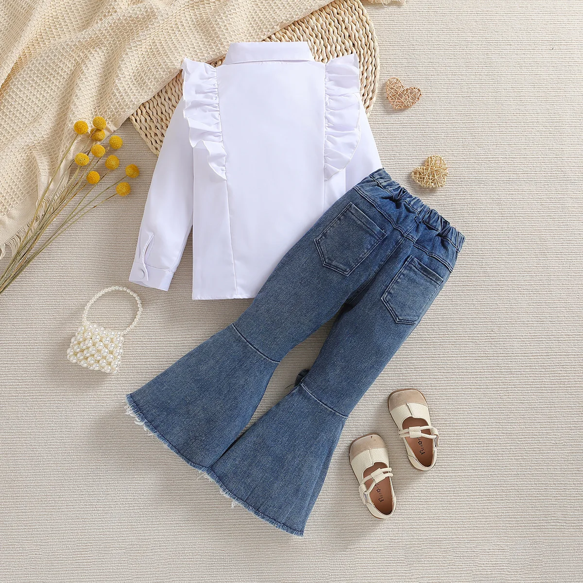 Comprar Ropa de primavera para niña, Tops de manga larga de algodón blanco a la moda coreana y pantalones acampanados, conjuntos de Boutique para niños, BC729